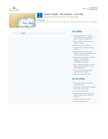 Infolinia 9 KARAIBY ZACHODNIE - FORT LAUDERDALE - SILVER SPIRIT DNI Silversea - Silver Spirit 801 08 08 03 22 492 77 90 | Rok budowy: 2009 TRASA REJSU: Fort Lauderdale TERMIN dzie Cozumel Cozumel Belize City Santo Tomas dzie Key West Fort Lauderdale CENA ZAWIERA zakwaterowanie w 2-os. kabinie wybranej kategorii (cena zależy od położenia kabiny na pokładzie) serwis bagażowy podczas wejścia i zejścia ze statku 24-godzinny serwis kabinowy 3 główne posiłki, przekąski między posiłkami napoje: open bar: wybrane wina, alkohole, szampan, soft drinks, woda mineralna, barek w kabinie korzystanie ze wszystkich urządzeń sportowo – rekreacyjnych znajdujących się na statku (wymienionych w opisie) sporty wodne: nurkowanie z maską i rurką, windsurfing, kajaki morskie, narty wodne, banan udział we wszystkich imprezach organizowanych na statku napiwki dla obsługi na statku. CENA NIE ZAWIERA dojazdu do/z portów rozpoczęcia i zakończenia rejsu ewentualnych dodatkowych noclegów przed rejsem lub po rejsie wycieczek fakultatywnych wydatków osobistych (fryzjer, Spa, telefon, pralnia, zakupy w barach i butikach...) ubezpieczenia turystycznego kosztu wymaganych wiz.
