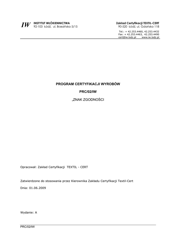 program certyfikacji wyrobów prc/02/iw „znak zgodności