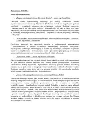 Rok szkolny 2010/2011 Innowacje pedagogiczne: 1. „Zajęcia rozwijające twórczą aktywność dziecka” – autor: mgr Anna Bułat Głównym celem wprowadzanej innowacji jest rozwój osobowości dziecka poprzez stymulowanie twórczej aktywności. Doskonałą metodą na zaspokojenie potrzeb, rozwijanie i pogłębianie zainteresowań, zwiększenie poziomu dodatniej samooceny i samoakceptacji jest aktywność twórcza. Wprowadzenie jej jako wyjścia poza ramy obowiązującego systemu i odejście od stereotypowego nauczania da szansę każdemu dziecku na swobodny, harmonijny rozwój emocjonalno – umysłowy w sposób przyjemny, zabawowy i odkrywczy. 2. „Matematyka z wykorzystaniem technologii informacyjnej (matematyka + komputer)” – autor mgr Joanna Szczepańska Założeniem innowacji jest zapoznanie uczniów z podstawowymi wiadomościami i umiejętnościami z zakresu technologii informacyjnej, rozwijanie umiejętności wykorzystania technologii informacyjnej w uczeniu się matematyki, rozwijanie aktywności uczniów w projektowaniu i rozwiązywaniu zadań i problemów przy pomocy nowoczesnej technologii informacyjnej oraz wykorzystania różnych źródeł informacji. 3. „Z gryfem w herbie” – autor: mgr Bożena Binkiewicz Głównym celem innowacji jest poznanie historii Szczecinka i jego okolic podczas panowania na tych ziemiach dynastii Gryfitów oraz rozwój postaw patriotycznych związanych z tożsamością kultury regionalnej. Wprowadzana innowacja posiada strukturę modułową, oznacza to, że jest oparta o integrację treści kształcenia z różnych obszarów wiedzy. Realizacja modułów oparta jest o aktywną postawę uczniów i ich samodzielne działanie, w którym nauczyciel pełni inspirującą do działania rolę. 4. „Nasza wielka przygoda z muzeum” – autor: mgr Elżbieta Rodzik Poznawanie własnego regionu, jego historii, kultury odbywa się od wczesnego dzieciństwa. Pierwszy etap poznawania następuje w domu rodzinnym. Każdy następny etap to inny sposób przekazywania wiedzy, działania, poznawania. Jest to związane ze specyfiką psychofizycznego i intelektualnego rozwoju dzieci. Jednakże w każdym etapie edukacji historycznej i regionalnej istotne jest to, by zaszczepić w uczniach zainteresowanie sprawami swojej miejscowości i regionu. Mają na uwadze przynależność do wspólnej Europy należy kształcić postawy patriotyczne, będące wyrazem miłości i przywiązania do swojej wielkiej i przede wszystkim „małej Ojczyzny”. Realizacja innowacji ma umożliwić uczniom integrację ze środowiskiem i dziedzictwem kulturowym swojego regionu. Przybliżenie uczniom regionu, jego piękna nastąpi poprzez wycieczki, zajęcia prowadzone w Muzeum Regionalnym w Szczecinku. 5. „Doskonalenie umiejętności formułowania wypowiedzi pisemnych uczniów klas trzecich” – autor: mgr Hanna Zawadzka Innowacja ta zakłada rozwijanie umiejętności logicznego myślenia, wykształcenie umiejętności identyfikowania różnych form wypowiedzi pisemnych na podstawie cech charakterystycznych. Zadaniem wprowadzonej innowacji będzie również wspieranie pomysłowości dzieci, twórczych poszukiwań, rozwijanie zamiłowań literackich. 6. „Świat przyrody w plastyce” – autor: Iwona Lewandowska Celem wprowadzanej innowacji jest przeobrażenie dzieci z biernych i nieświadomych we wnikliwych, wrażliwych i świadomych uczestników środowiska przyrodniczego. Jednym z naczelnych działań innowacyjnych będzie częste organizowanie zajęć w środowisku naturalnym. Organizowane spacery i wycieczki pozwolą uczniom na bezpośrednią obserwację, przeprowadzenie doświadczeń. Istotnym elementem każdego spotkania z dziećmi będzie wykonanie pracy plastycznej odzwierciedlającej zdobytą wiedzę i umiejętności w czasie kolejnych zajęć. 7. „Muzykalne dzieci” – autor: mgr Jolanta Fabiszak Muzyka bardzo korzystnie wpływa na rozwój dziecka. samodzielna gra na instrumentach muzycznych, słuchanie muzyki wspomagają rozwój intelektualny, emocjonalny, fizyczny oraz społeczny dzieci. Program innowacyjny zakłada naukę gry na flecie prostym. Program jest spójny z celami i zadaniami rozwoju szkoły. 8. „Szczecinek i okolice – moja mała Ojczyzna” – autor: mgr Lena Pawlikowska – Bukowska Innowacja dotyczy edukacji regionalnej, została ukierunkowana na kształcenie umiejętności właściwego stosunku do „małej ojczyzny” i przekazywanie dziedzictwa kulturowego poprzez przyjęcie wartości tkwiących w bezpośrednim kulturowym i przyrodniczym otoczeniu dziecka. 9. „Zaczarowany świat książek” – autor: mgr Aleksandra Bieniek Wprowadzana innowacja ma na celu kształcenie u uczniów uważnego słuchania, rozbudzanie motywacji do czytania książek oraz rozwijanie zainteresowań czytelniczych. 10. „Zabawy papierkiem i koralikiem” – autor: mgr Wiesława Martuszewska Celem innowacji jest rozwój osobowości uczniów poprzez twórczość plastyczną. Prowadzone zajęcia będą kształtowały poczucie estetyki i wyobraźni twórczej, rozwijały zdolności manualne oraz uwrażliwiały dzieci na piękno. 11. „Gramy na gitarze” – autor: mgr Bożena Kania Założeniem wprowadzanej innowacji jest wyrobienie znajomości podstaw muzyki, kształcenie słuchu muzycznego, zaznajomienie z podstawami harmonii, w tym budowy akordów, podstawowych gam. Uczniowie posiądą umiejętność gry wybranych utworów lub ich fragmentów z repertuaru różnych zespołów muzycznych. 12. „Pierwszy krok akrobatyczny” – autor: mgr Wioletta Szydlak Inspiracją do opracowania i wdrożenia innowacji pedagogicznej jest potrzeba rozwijania zainteresowań sportowych, podniesienia sprawności fizycznej, dbałość o zdrowie psychiczne i fizyczne. Program zawiera elementy edukacji motoryczno – zdrowotno – muzycznej. Realizowanie programu akrobatyki sportowej w oparciu o program Polskiego Związku Akrobatyki Sportowej pozwoli rozbudzić wśród dzieci zami