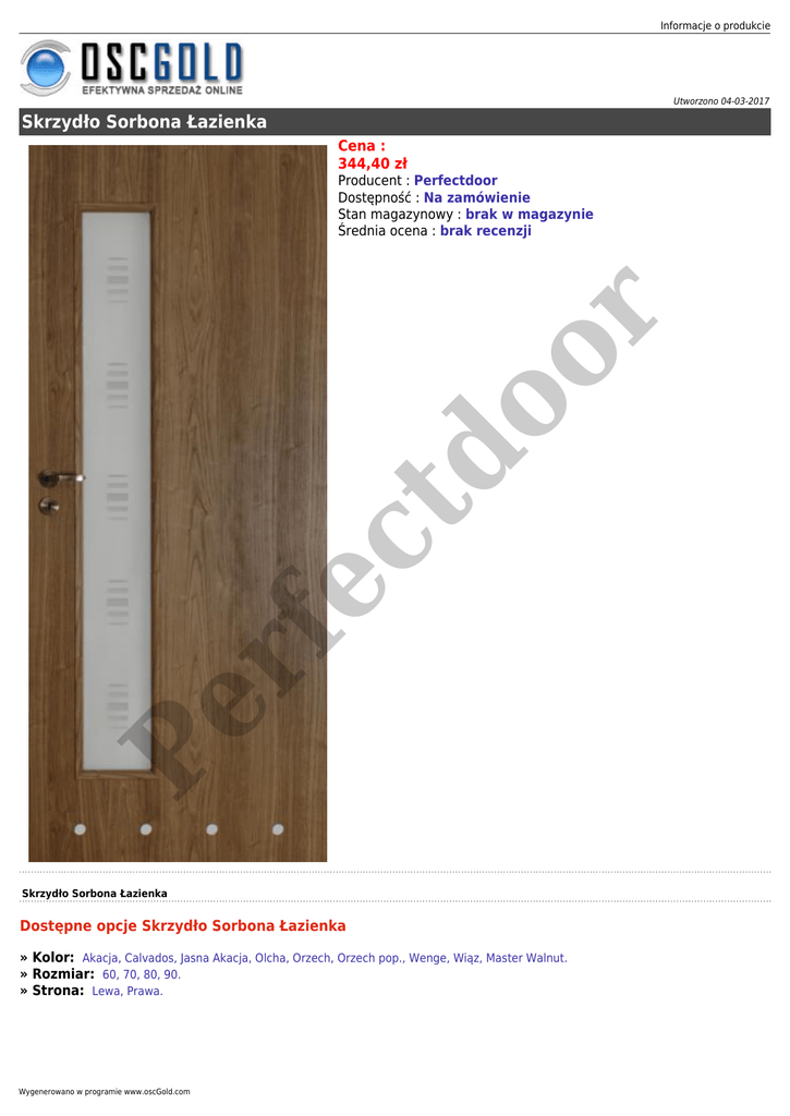 Informacje o produkcie Utworzono 04-03-2017 Skrzydło Sorbona Łazienka Cena : 344,40 zł Pe rf ec td o or Producent : Perfectdoor Dostępność : Na zamówienie Stan magazynowy : brak w magazynie Średnia ocena : brak recenzji Skrzydło Sorbona Łazienka Dostępne opcje Skrzydło Sorbona Łazienka » Kolor: Akacja, Calvados, Jasna Akacja, Olcha, Orzech, Orzech pop., Wenge, Wiąz, Master Walnut. » Rozmiar: 60, 70, 80, 90. » Strona: Lewa, Prawa. Wygenerowano w programie www.oscGold.com