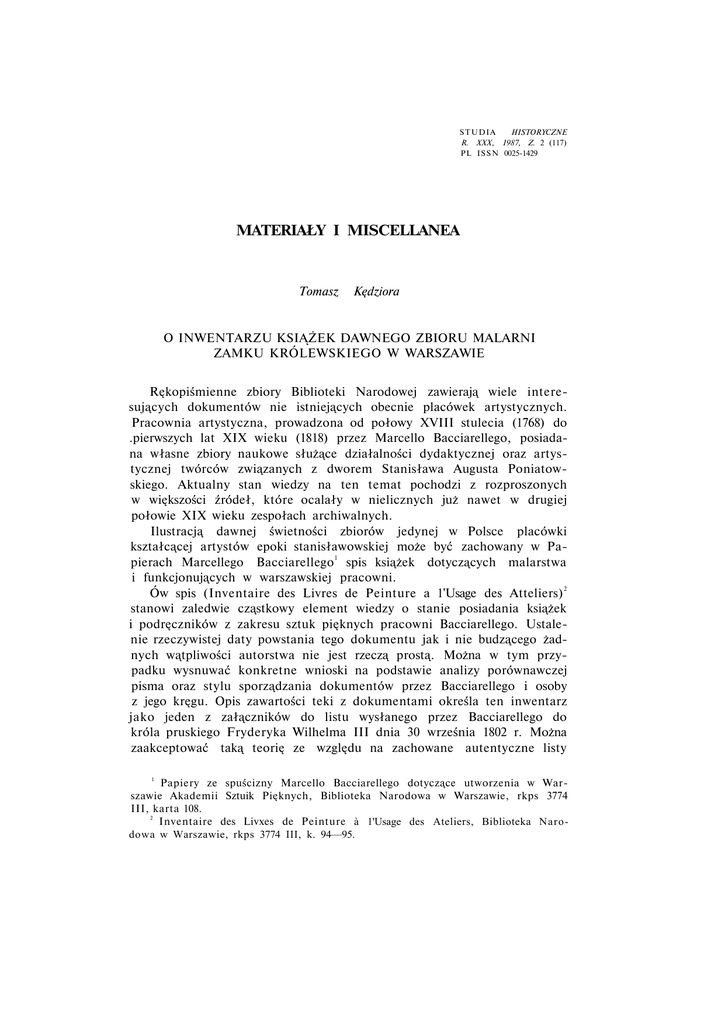 STUDIA HISTORYCZNE R. XXX, 1987, Z. 2 (117) PL I S S N 0025-1429 MATERIAŁY I MISCELLANEA Tomasz Kędziora O INWENTARZU KSIĄŻEK DAWNEGO ZBIORU MALARNI ZAMKU KRÓLEWSKIEGO W WARSZAWIE Rękopiśmienne zbiory Biblioteki Narodowej zawierają wiele intere sujących dokumentów nie istniejących obecnie placówek artystycznych. Pracownia artystyczna, prowadzona od połowy XVIII stulecia (1768) do .pierwszych lat XIX wieku (1818) przez Marcello Bacciarellego, posiada na własne zbiory naukowe służące działalności dydaktycznej oraz artys tycznej twórców związanych z dworem Stanisława Augusta Poniatow skiego. Aktualny stan wiedzy na ten temat pochodzi z rozproszonych w większości źródeł, które ocalały w nielicznych już nawet w drugiej połowie XIX wieku zespołach archiwalnych. Ilustracją dawnej świetności zbiorów jedynej w Polsce placówki kształcącej artystów epoki stanisławowskiej może być zachowany w Pa pierach Marcellego Bacciarellego 1 spis książek dotyczących malarstwa i funkcjonujących w warszawskiej pracowni. Ów spis (Inventaire des Livres de Peinture a 1'Usage des Atteliers) 2 stanowi zaledwie cząstkowy element wiedzy o stanie posiadania książek i podręczników z zakresu sztuk pięknych pracowni Bacciarellego. Ustale nie rzeczywistej daty powstania tego dokumentu jak i nie budzącego żad nych wątpliwości autorstwa nie jest rzeczą prostą. Można w tym przy padku wysnuwać konkretne wnioski na podstawie analizy porównawczej pisma oraz stylu sporządzania dokumentów przez Bacciarellego i osoby z jego kręgu. Opis zawartości teki z dokumentami określa ten inwentarz jako jeden z załączników do listu wysłanego przez Bacciarellego do króla pruskiego Fryderyka Wilhelma III dnia 30 września 1802 r. Można zaakceptować taką teorię ze względu na zachowane autentyczne listy 1 Papiery ze spuścizny Marcello Bacciarellego dotyczące utworzenia w War szawie Akademii Sztuik Pięknych, Biblioteka Narodowa w Warszawie, rkps 3774 III, karta 108. 2 Inventaire des Livxes de Peinture à 1'Usage des Ateliers, Biblioteka Narodowa w Warszawie, rkps 3774 III, k. 94—95. 292 Bacciarellego do króla Prus oraz odpowiedzi podpisane ręką Wilhelma III. Prawdopodobieństwo wykonania tegoż inwentarza przez Bacciarellego jest bardzo duże, ale autorytatywna wypowiedź na ten temat zawsze bu dzić może określone wahania. Brak podpisu i daty nie może jednak cał kowicie wykluczać autorstwa i czasu powstania dokumentu. Poważnej analizy rękopisów dotyczących stanisławowskiej akademii sztuk pięknych, która w XVIII wieku przybrała jedynie kształt malarni zamkowej, dokonał Władysław Tatarkiewicz, publikując wybrane ręko pisy 3. Inwentarz nie był jednak przedmiotem bliższego opisu ani publi kacji. Wszystkie z przytoczonych przez Tatarkiewicza rękopisów zostały po dokładnej ocenie określone, jeśli chodzi o autorstwo i czas ich spo rządzenia. Takich uwag nie udało mi się odnaleźć odnośnie do inwenta rza, który w; formie tabeli przedstawia poszczególne dzieła. Podobny sche mat tablic spotyka się w rękopisach wykonanych przez Bacciarellego na zamówienie Stanisława Augusta. W tym przypadku treść wiązała się z projektami Akademii Sztuk Pięknych lub planowanym rozwojem dzia łalności artystycznej na dworze królewskim. Istnieje możliwość jedynie teoretycznej koncepcji, że treść meryto ryczna inwentarza została opracowana przez Bacciarellego, a jedynie tech niczna strona jego sporządzenia była udziałem osoby nam nie znanej. Oczywiście takie stwierdzenie może być jedynie niezobowiązującym do mniemaniem, jednak dosyć realnym. Tabela zawierająca opis literatury posiada cztery podziały pionowe, ilustrujące kolejno numerację poszczególnych pozycji, opisy bibliogra ficzne, wartość dzieł podaną w dukatach oraz we florenach (?). Kolej ność numeracji ulega odkształceniu przy pozycjach 20—23, gdzie braku je pozycji 21 i 22; brak także miejsca na ich uzupełnienie. Można po traktować to jako pomyłkę autora. Kolejny przedział tabeli obejmuje opisy bibliograficzne 22 dzieł. Kon frontując jakość tych opisów z zasadami stosowanymi w XIX wieku, a także ze współczesnymi przepisami w tym zakresie można wyciągnąć ogólny wniosek. Ogromna swoboda przy sporządzaniu opisów powoduje poważne trudności identyfikacji poszczególnych dzieł. Oddalenie czasowe oraz burzliwa historia zarówno naszego kraju, jak i całej Europy w XIX i XX wieku trudności te znacznie zwiększyła. Liczne wojny i przemie szczenia zbiorów nie sprzyjają obecnym badaniom stanu ówczesnych za sobów. Wytłumaczeniem takiego sporządzenia opisu może być intencja jedynie informacyjnego podejścia do inwentarza, co znajduje potwierdze nie w opracowaniu załącznika do wspomnianego listu. Inną sprawą bę dą obowiązujące wówczas zasady, gdyż trudno mówić jeszcze o normie bibliograficznej. 3 W. T a t a r k i e w i c z , Akademia Sztuk Pięknych sława Augusta [w:] O sztuce polskiej XVII i XVIII aneksy, s. 471—476. Autor nie publikuje tego rękopisu. w Warszawie za Stani wieku, Warszawa 1986, 293 Z większą dokładnością opisu spotkamy się dopiero w początku na stępnego stulecia. Zbiory biblioteczne Uniwersytetu Wileńskiego czy Gim nazjum Wołyńskiego są już zdecydowanie lepiej opracowane, dostarcza jąc więcej szczegółów bibliograficznych o posiadanych książkach. Poszczególne dzieła przedstawione w inwentarzu mogą stanowić wy cinek struktury używanych w kształceniu artystycznym prac teoretycz nych i albumów poglądowych. Ponieważ nie istniały praktycznie w zakresie teorii i dziejów sztuki opracowania polskie wydawane w naszych oficynach, sprowadzano książ ki z Francji, Włoch, ewentualnie z Niemiec, gdzie już można było mó wić o doświadczeniu w tym zakresie. Szczególnie aktywne były ośrodki posiadające uczelnie artystyczne. Bacciarelli zabiegał o kupno podręcz ników w Paryżu, Wiedn