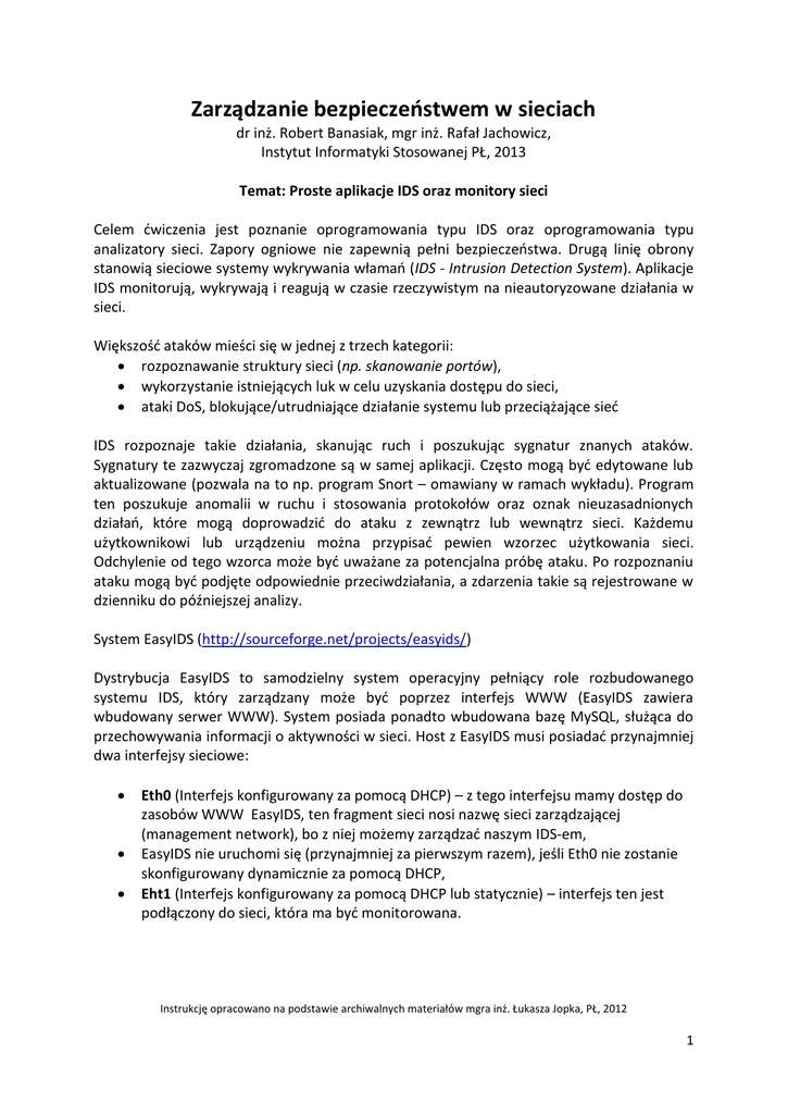 Zarządzanie bezpieczeństwem w sieciach dr inż. Robert Banasiak, mgr inż. Rafał Jachowicz, Instytut Informatyki Stosowanej PŁ, 2013 Temat: Proste aplikacje IDS oraz monitory sieci Celem ćwiczenia jest poznanie oprogramowania typu IDS oraz oprogramowania typu analizatory sieci. Zapory ogniowe nie zapewnią pełni bezpieczeństwa. Drugą linię obrony stanowią sieciowe systemy wykrywania włamań (IDS - Intrusion Detection System). Aplikacje IDS monitorują, wykrywają i reagują w czasie rzeczywistym na nieautoryzowane działania w sieci. Większość ataków mieści się w jednej z trzech kategorii: rozpoznawanie struktury sieci (np. skanowanie portów), wykorzystanie istniejących luk w celu uzyskania dostępu do sieci, ataki DoS, blokujące/utrudniające działanie systemu lub przeciążające sieć IDS rozpoznaje takie działania, skanując ruch i poszukując sygnatur znanych ataków. Sygnatury te zazwyczaj zgromadzone są w samej aplikacji. Często mogą być edytowane lub aktualizowane (pozwala na to np. program Snort – omawiany w ramach wykładu). Program ten poszukuje anomalii w ruchu i stosowania protokołów oraz oznak nieuzasadnionych działań, które mogą doprowadzić do ataku z zewnątrz lub wewnątrz sieci. Każdemu użytkownikowi lub urządzeniu można przypisać pewien wzorzec użytkowania sieci. Odchylenie od tego wzorca może być uważane za potencjalna próbę ataku. Po rozpoznaniu ataku mogą być podjęte odpowiednie przeciwdziałania, a zdarzenia takie są rejestrowane w dzienniku do późniejszej analizy. System EasyIDS (http://sourceforge.net/projects/easyids/) Dystrybucja EasyIDS to samodzielny system operacyjny pełniący role rozbudowanego systemu IDS, który zarządzany może być poprzez interfejs WWW (EasyIDS zawiera wbudowany serwer WWW). System posiada ponadto wbudowana bazę MySQL, służąca do przechowywania informacji o aktywności w sieci. Host z EasyIDS musi posiadać przynajmniej dwa interfejsy sieciowe: Eth0 (Interfejs konfigurowany za pomocą DHCP) – z tego interfejsu mamy dostęp do zasobów WWW EasyIDS, ten fragment sieci nosi nazwę sieci zarządzającej (management network), bo z niej możemy zarządzać naszym IDS-em, EasyIDS nie uruchomi się (przynajmniej za pierwszym razem), jeśli Eth0 nie zostanie skonfigurowany dynamicznie za pomocą DHCP, Eht1 (Interfejs konfigurowany za pomocą DHCP lub statycznie) – interfejs ten jest podłączony do sieci, która ma być monitorowana. Instrukcję opracowano na podstawie archiwalnych materiałów mgra inż. Łukasza Jopka, PŁ, 2012 1 Zadanie 1 1. Skonfiguruj siec zarządzająca według poniższego schematu Rys 1. Konfiguracja ćwiczeniowa 2. Do przetestowania działania serwera DHCP można użyć dowolnego hosta (maszyna wirtualna z jednym interfejsem sieciowym). 3. Zainstaluj EasyIDS jako wirtualną maszynę VirtualBox: a. Typ maszyny: RedHat 32 bit – baza w EasyIDS to CentOS 5.4, b. Pamięć RAM – 256 - 512 MB, c. Dysk 2GB – tryb dynamiczna alokacja przestrzeni dyskowej. 4. Wystartuj system z obrazu „EasyIDS-0.4.iso”. Postępuj zgodnie z instrukcjami pojawiającymi się na ekranie. System poprosi Cię o podanie nowego hasła dla użytkownika root. Rys 2. Okno logowania EasyIDS 5. Skonfiguruj interfejsy sieciowe: Eth0 – konfiguracja za pomocą DHCP, Eth1 – konfiguracja statyczna wg Rys1. 6. Ustanów hasło dostępu do panelu WWW za pomocą komendy: passwd-admin (będzie później potrzebne do zalogowania się do EasyIDS GUI wraz z loginem admin) 7. Z maszyny, na której znajduje się serwer DHCP (lub dowolnej innej, znajdującej się w tej samej sieci), używając przeglądarki WWW, zaloguj się do panelu kontrolnego EasyIDS (w przeglądarce należy podać adres interfejsu hosta z EasyIDS). Instrukcję opracowano na podstawie archiwalnych materiałów mgra inż. Łukasza Jopka, PŁ, 2012 2 8. Podczas pierwszego uruchomienia system poprosi o zmianę hasła dostępu do bazy MySQL. 9. EasyIDS został wstępnie skonfigurowany (ilustracja poniżej). Zadanie 2 1. Skonfiguruj dalsza cześć sieci według poniższego schematu na Rys 3: Rys 3. Dalsza część topologii testowej Instrukcję opracowano na podstawie archiwalnych materiałów mgra inż. Łukasza Jopka, PŁ, 2012 3 2. Role zapory ogniowej i jednocześnie routera pełni host z zainstalowanym system Linux, z wykorzystaniem mechanizmu iptables (skorzystać można z instrukcji do przedniego ćwiczenia). Zadania, jakie musi spełniać zapora / router: Routing pomiędzy siecią wewnętrzna (adres sieciowy 192.168.1.0/24), a siecią zewnętrzna (może to być siec rzeczywista w pracowni). Translacje NAT. 3. Stacja PC może mieć zainstalowany dowolny system operacyjny. Wygeneruj dowolny ruch w sieci (z/do stacji roboczej, różne usługi i protokoły), następnie zaloguj się do EasyIDS i sprawdź zarejestrowany ruch: Przygotuj raport w postaci elektronicznej: a. Co pokazało narzędzie Arpwatch ? b. Co pokazało narzędzie Ntop ? i. Jaki był udział pakietów Unicast, Broadcast i Multicast ? ii. Jakie były długości pakietów? Jaka długość dominowała ? iii. Jaki był TTL pakietów? Jaka wartość dominuje, a jaka jest średnia ? iv. Co jeszcze można odczytać za pomocą tego narzędzia o ruchu sieciowym? c. Przetestuj narzędzie o nazwie „ICMP Watch” – jakie informacje udostępnia? d. Co pokazało narzędzie Snort? e. Za pomocą narzędzie Nmap znajdź informacje o komputerach w sieci monitorowej przez EasyIDS. Zadanie 3 1. Skonfiguruj dalszą część sieci według poniższego schematu na Rys 4: Rys 4. Dalsza część topologii testowej Stacja PC „Włamywacz” imituje host z sieci zewnętrznej, z którego dokonywany będzie atak. Za pomocą narzędzia Nmap dokonaj skanowania portów sieci. Instrukcję opracowano na podstawie archiwalnych materiałów mgra inż. Łukasza Jopka, PŁ, 2012 4 http://nmap.org/man/pl/ - Pod tym adresem znajduje się opis programu Nmap oraz technik skanowania portów. Zapoznaj s