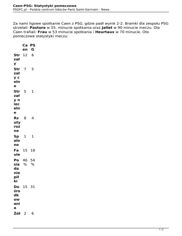 Caen-PSG: Statystyki pomeczowe PSGFC.pl - Polskie centrum kibiców Paris Saint-Germain - News Za nami ligowe spotkanie Caen z PSG, gdzie padł wynik 2-2. Bramki dla zespołu PSG strzelali: Pastore w 55. minucie spotkania oraz Jallet w 90 minucie meczu. Dla Caen trafiali: Frau w 53 minucie spotkania i Heurtaux w 70 minucie. Oto pomeczowe statystyki meczu: Ca PS en G Str 12 zał y 6 Str zał yc eln e 7 5 Str zał yn iec eln e 5 1 Rz 8 uty roż ne 4 Sp alo ne 1 1 Fa 15 18 ule Po 46 54 sia % % da nie pił ki Do 15 31 śro dk ow ani a Żół 2 6 1/2 Caen-PSG: Statystyki pomeczowe PSGFC.pl - Polskie centrum kibiców Paris Saint-Germain - News te kar tki Cz 0 er wo ne kar tki 0 Autor: patrykPSG 2/2 Powered by TCPDF (www.tcpdf.org)