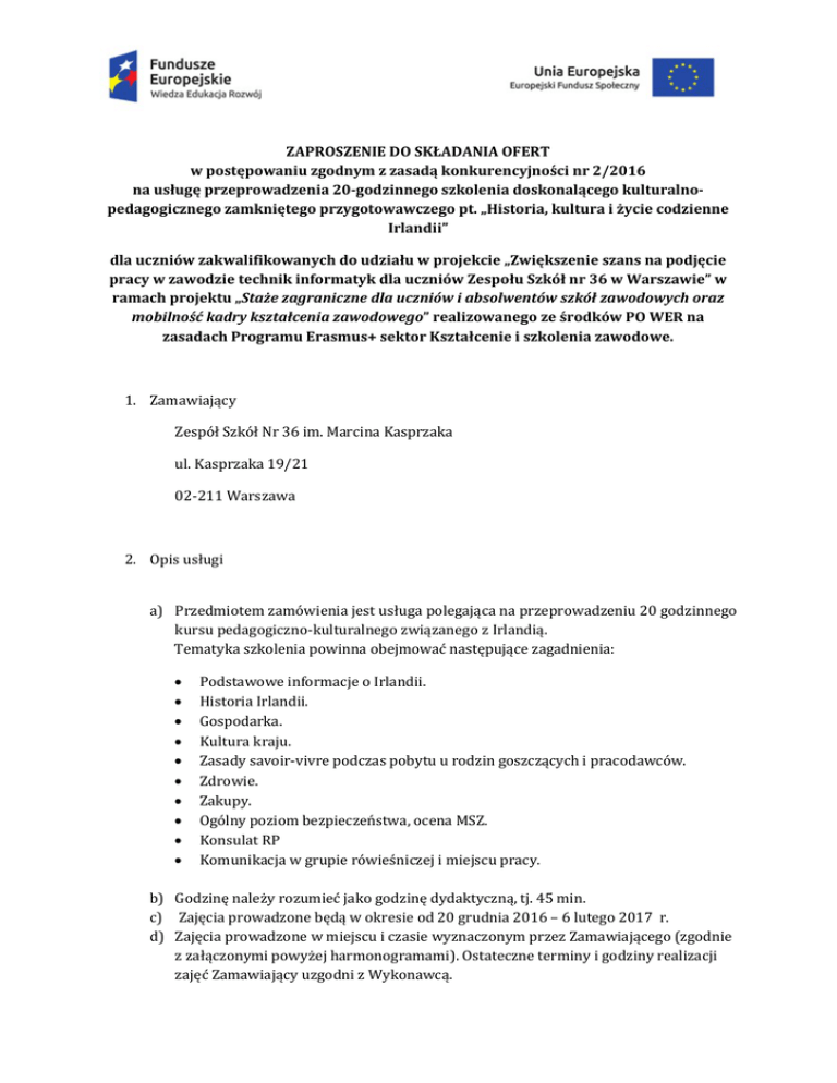 ZAPROSZENIE DO SKŁADANIA OFERT w postępowaniu zgodnym z zasadą konkurencyjności nr 2/2016 na usługę przeprowadzenia 20-godzinnego szkolenia doskonalącego kulturalnopedagogicznego zamkniętego przygotowawczego pt. „Historia, kultura i życie codzienne Irlandii” dla uczniów zakwalifikowanych do udziału w projekcie „Zwiększenie szans na podjęcie pracy w zawodzie technik informatyk dla uczniów Zespołu Szkół nr 36 w Warszawie” w ramach projektu „Staże zagraniczne dla uczniów i absolwentów szkół zawodowych oraz mobilność kadry kształcenia zawodowego” realizowanego ze środków PO WER na zasadach Programu Erasmus+ sektor Kształcenie i szkolenia zawodowe. 1. Zamawiający Zespół Szkół Nr 36 im. Marcina Kasprzaka ul. Kasprzaka 19/21 02-211 Warszawa 2. Opis usługi a) Przedmiotem zamówienia jest usługa polegająca na przeprowadzeniu 20 godzinnego kursu pedagogiczno-kulturalnego związanego z Irlandią. Tematyka szkolenia powinna obejmować następujące zagadnienia: Podstawowe informacje o Irlandii. Historia Irlandii. Gospodarka. Kultura kraju. Zasady savoir-vivre podczas pobytu u rodzin goszczących i pracodawców. Zdrowie. Zakupy. Ogólny poziom bezpieczeństwa, ocena MSZ. Konsulat RP Komunikacja w grupie rówieśniczej i miejscu pracy. b) Godzinę należy rozumieć jako godzinę dydaktyczną, tj. 45 min. c) Zajęcia prowadzone będą w okresie od 20 grudnia 2016 – 6 lutego 2017 r. d) Zajęcia prowadzone w miejscu i czasie wyznaczonym przez Zamawiającego (zgodnie z załączonymi powyżej harmonogramami). Ostateczne terminy i godziny realizacji zajęć Zamawiający uzgodni z Wykonawcą. e) Zamawiający zastrzega sobie prawo do zmiany harmonogramów, każdorazowo zmiana harmonogramu będzie uzgadniana z Wykonawcą usługi minimum 3 dni przed terminem, którego dotyczą zmiany. W uzasadnionych przypadkach (np. zdarzenia losowe) Zamawiający może odwołać zajęcia na dzień przed terminem realizacji danej części usługi. 3. Warunki udziału w postępowaniu: Wykładowca prowadzący zajęcia spełnia poniższe minimalne wymagania kwalifikacyjne: A. Posiada przygotowanie pedagogiczne. B. Posiada wykształcenie wyższe magisterskie studia wyższe na kierunku filologia angielska. C. Posiada stopień awansu zawodowego minimum nauczyciela kontraktowego. D. Posiadają minimum 5 letni stażu pracy w szkole średniej technicznej w obszarze kształcenia elektryczno-elektroniczny (preferowany kierunek technik informatyk, technik elektronik) na stanowisku pedagoga szkolnego. E. Posiadają kwalifikacje do prowadzenia zajęć wskazanych w danej części zamówienia. 4. Zakres wykonywanych zadań w projekcie opracowanie programu zajęć i planu pracy; prowadzenie zajęć zgodnie z harmonogramem (zajęcia przed lub po obowiązkowych lekcjach w godzinach dostosowanych do wymogów uczestników i warunków szkoły) w terminie maksymalnym do 06.02.2017 r. prowadzenie dokumentacji zajęć pozalekcyjnych (karty czasu pracy, dzienniki zajęć, listy obecności); przeprowadzenie na początku realizacji zajęć i na ich zakończenie testu wiedzy i umiejętności monitorującego przyrost wiedzy i umiejętności zdobytych przez uczestników w trakcie prowadzonych zajęć. sporządzanie analizy osiągnięć uczniów. 5. Warunki płatności Należność za prowadzenie zajęć zostanie uregulowana po przedstawieniu przez Wykonawcę prawidłowo wystawionego rachunku i karty czasu pracy w terminie 21 dni od przyjęcia przez wykonawcę rachunku. 6. Sposób przygotowania oferty: Oferta musi zawierać: prawidłowo wypełniony formularz ofertowy, podpisany przez Wykonawcę. Dokumenty (oryginały) potwierdzające spełnianie warunków wymienionych w punkcie należy przedstawić przedłożyć na wezwanie Zamawiającego przed podpisaniem umowy. 7. Ofertę należy dostarczyć do sekretariatu szkoły do dnia 14 grudnia 2016 r. godz. 12:00. 8. Kryteria oceny oferty (łącznie 100 pkt.): 1) Cena - 90 pkt. 2) Udokumentowany staż pracy na stanowisku pedagoga szkolnego w technikum w obszarze kształcenia elektryczno-elektroniczny (preferowany kierunek technik informatyk, technik elektronik) - 10% Jeśli kandydat posiada doświadczenie w pracy pedagoga szkolnego: Od 5 do 10 lat stażu pracy – 5 pkt., więcej jak 10 lat i mniej niż 15 – 8 pkt., od 15 lat pracy i więcej 10 pkt. 9. Wybór Wykonawcy realizującego usługę Zamawiający wybierze Wykonawcę na podstawie złożonych ofert. Zamówienie zostanie udzielone Oferentom, którzy spełnią kryteria dostępu i przedstawią najkorzystniejszą ofertę. Zamawiający zastrzega sobie prawo do odpowiedzi tylko na wybraną ofertę. Zamawiający zastrzega sobie prawo do negocjacji warunków zamówienia, a także do rezygnacji z zamówienia bez podania przyczyn przed podpisaniem umowy. Zamawiający zapewni bieżącą współpracę oraz gotowość do udzielenia informacji i wyjaśnień odnośnie problemów i wątpliwości mogących się pojawić na etapie realizacji zamówienia. 10. Osoba kontaktowa ze strony Zespołu Szkół Nr 36, Elżbieta Kudelska tel. 22 632 02 11.