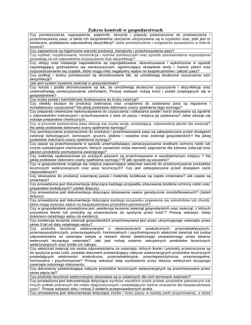 Zakres kontroli w gospodarstwach Czy pomieszczenia, wyposażenie, pojemniki, skrzynie i pojazdy przeznaczone do przetwarzania i przechowywania pasz, a także ich bezpośrednie otoczenie utrzymywane są w czystości oraz, jeśli jest to konieczne, poddawane odpowiedniej dezynfekcji? Jakie pomieszczenia i urządzenia sprawdzono w trakcie kontroli? Czy zapewnione są higieniczne warunki produkcji, transportu i przechowywania pasz? Czy rozkład, rozplanowanie, konstrukcja i rozmiar pomieszczeń oraz sposób zainstalowania wyposażenia pozwalają na ich odpowiednie oczyszczanie i/lub dezynfekcję? Czy stropy oraz instalacje napowietrzne są zaprojektowane, skonstruowane i wykończone w sposób zapobiegający gromadzeniu się zanieczyszczeń, ograniczający skraplanie wody i rozrost pleśni oraz rozprzestrzenianie się cząstek, które mogą mieć negatywny wpływ na bezpieczeństwo i jakość pasz? Czy podłogi i ściany pomieszczeń są skonstruowane tak, że umożliwiają skuteczne czyszczenie lub/i dezynfekcję? Jaki jest system żywienia zwierząt w gospodarstwie? Czy koryta i poidła skonstruowane są tak, że umożliwiają skuteczne czyszczenie i dezynfekcję oraz uniemożliwiają zanieczyszczenie odchodami, Proszę wskazać rodzaj koryt i poideł znajdujących się w gospodarstwie? Czy liczba poideł i karmideł jest dostosowana do liczby zwierząt? Czy obiekty służące do produkcji zwierzęcej oraz urządzenia do zadawania pasz są regularnie i kompleksowo czyszczone? Na jakiej podstawie dokonano oceny spełnienia tego wymogu? Czy preparaty chemiczne wykorzystywane do czyszczenia i odkażania poideł i koryt stosowane są zgodnie z odpowiednimi instrukcjami i przechowywane z dala od paszy i miejsca jej zadawania? Jakie stosuje się rodzaje preparatów chemicznych. Czy w procesie wytwarzania pasz stosuje się czystą wodę, posiadającą odpowiednią jakość dla zwierząt? Na jakiej podstawie dokonano oceny spełnienia wymogu? Czy pomieszczenia przeznaczone do produkcji i przechowywania pasz są zabezpieczone przed dostępem zwierząt dzikożyjących, domowych, gryzoni, ptaków i owadów oraz zwierząt gospodarskich? Na jakiej podstawie dokonano oceny spełnienia wymogu? Czy pasze są przechowywane w sposób uniemożliwiający zanieczyszczenie środkami ochrony roślin lub innymi substancjami chemicznymi, których zawartość może stanowić zagrożenie dla zdrowia zwierząt oraz jakości produktów pochodzenia zwierzęcego? Czy materiały opakowaniowe po zużytych paszach są przechowywane w wyodrębnionym miejscu ? Na jakiej podstawie dokonano oceny spełnienia wymogu? W jaki sposób są usuwane? Czy w gospodarstwie znajduje się miejsce zapewniające właściwe warunki do przetrzymywania produktów leczniczych weterynaryjnych oraz pasz leczniczych? Czy jest zabezpieczone przed dostępem osób niepowołanych? Czy stosowane do produkcji zwierzęcej pasze i materiały ściółkowe są często zmieniane? Jak często są zmieniane? Czy prowadzona jest dokumentacja dotycząca każdego przypadku stosowania środków ochrony roślin oraz preparatów biobójczych? (Jeżeli dotyczy) Czy prowadzona jest dokumentacja dotycząca stosowania nasion genetycznie zmodyfikowanych? (Jeżeli dotyczy) Czy prowadzona jest dokumentacja dotycząca każdego przypadku pojawienia się szkodników lub chorób, które mogą wywrzeć wpływ na bezpieczeństwo produktów pierwotnych? Czy w gospodarstwie prowadzona jest „ewidencja leczenia zwierząt gospodarskich oraz zwierząt, z których pozyskane tkanki lub produkty są przeznaczone do spożycia przez ludzi”? Proszę wskazać, kiedy dokonano ostatniego wpisu do ewidencji. Czy ewidencja leczenia zwierząt gospodarskich przechowywana jest przez utrzymującego zwierzęta przez okres 5 lat od daty ostatniego wpisu? Czy produkty lecznicze weterynaryjne o właściwościach anabolicznych, przeciwbakteryjnych, przeciwpasożytniczych, przeciwzapalnych, hormonalnych i psychotropowych właściciel zwierząt lub osoba odpowiedzialna za zwierzęta nabyła w ramach obrotu detalicznego prowadzonego przez lekarza weterynarii leczącego zwierzęta? Jaki jest rodzaj ostatnio zakupionych produktów leczniczych weterynaryjnych oraz źródło ich zakupu. Czy właściciel zwierząt lub osoba odpowiedzialna za zwierzęta, których tkanki i produkty przeznaczone są do spożycia przez ludzi, posiada dokument potwierdzający nabycie weterynaryjnych produktów leczniczych posiadających właściwości anaboliczne, przeciwbakteryjne, przeciwpasożytnicze, przeciwzapalne, hormonalne i psychotropowe? Proszę wskazać datę wystawienia przez lekarza weterynarii leczącego zwierzęta ostatniego dokumentu. Czy dokumenty potwierdzające nabycie produktów leczniczych weterynaryjnych są przechowywane przez okres pięciu lat? Czy produkty lecznicze weterynaryjne stosowane są w ustalonych dla nich terminach ważności? Czy prowadzona jest dokumentacja dotycząca wyników wszelkich analiz próbek produktów pierwotnych lub innych próbek pobranych dla celów diagnostycznych i posiadających istotne znaczenie dla bezpieczeństwa pasz? Proszę wskazać daty i rodzaj 2 ostatnio przeprowadzonych analiz. Czy prowadzona jest dokumentacja dotycząca źródła i ilości paszy w każdej partii przyjmowanej, a także przeznaczenia i ilości paszy w każdej partii wydawanej? Czy prowadzona jest dokumentacja dotycząca prawidłowego usuwania martwych zwierząt i ściółki? Czy osoba odpowiedzialna za żywienie i opiekę nad zwierzętami posiada odpowiednie umiejętności, wiedzę i kompetencje? Czy pracownik odpowiedzialny za przygotowywanie i zdawanie paszy stosuje odzież ochronną? Czy zboża oraz inne pasze przechowywane w taki sposób, aby były niedostępne dla zwierząt? Czy pasze gotowe oddzielone są od nieprzetworzonych materiałów paszowych oraz dodatków w celu uniknięcia zanieczyszczenia krzyżowego? Na jakiej podstawie dokonano oceny spełnienia wymogu? Czy przemieszczanie pasz z miej