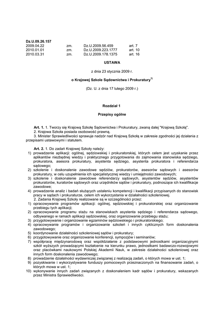 Dz.U.09.26.157 2009.04.22 2010.01.01 2010.03.31 zm. zm. zm. Dz.U.2009.56.459 Dz.U.2009.223.1777 Dz.U.2009.178.1375 art. 7 art. 10 art. 16 USTAWA z dnia 23 stycznia 2009 r. 1) o Krajowej Szkole Sądownictwa i Prokuratury (Dz. U. z dnia 17 lutego 2009 r.) Rozdział 1 Przepisy ogólne Art. 1. 1. Tworzy się Krajową Szkołę Sądownictwa i Prokuratury, zwaną dalej "Krajową Szkołą". 2. Krajowa Szkoła posiada osobowość prawną. 3. Minister Sprawiedliwości sprawuje nadzór nad Krajową Szkołą w zakresie zgodności jej działania z przepisami ustawowymi i statutem. Art. 2. 1. Do zadań Krajowej Szkoły należy: 1) prowadzenie aplikacji: ogólnej, sędziowskiej i prokuratorskiej, których celem jest uzyskanie przez aplikantów niezbędnej wiedzy i praktycznego przygotowania do zajmowania stanowiska sędziego, prokuratora, asesora prokuratury, asystenta sędziego, asystenta prokuratora i referendarza sądowego; 2) szkolenie i doskonalenie zawodowe sędziów, prokuratorów, asesorów sądowych i asesorów prokuratury, w celu uzupełnienia ich specjalistycznej wiedzy i umiejętności zawodowych; 3) szkolenie i doskonalenie zawodowe referendarzy sądowych, asystentów sędziów, asystentów prokuratorów, kuratorów sądowych oraz urzędników sądów i prokuratury, podnoszące ich kwalifikacje zawodowe; 4) prowadzenie analiz i badań służących ustaleniu kompetencji i kwalifikacji przypisanych do stanowisk pracy w sądach i prokuraturze, celem ich wykorzystania w działalności szkoleniowej. 2. Zadania Krajowej Szkoły realizowane są w szczególności przez: 1) opracowywanie programów aplikacji: ogólnej, sędziowskiej i prokuratorskiej oraz organizowanie przebiegu tych aplikacji; 2) opracowywanie programu stażu na stanowiskach asystenta sędziego i referendarza sądowego, odbywanego w ramach aplikacji sędziowskiej, oraz organizowanie przebiegu stażu; 3) przygotowywanie i organizowanie egzaminów sędziowskiego i prokuratorskiego; 4) opracowywanie programów i organizowanie szkoleń i innych cyklicznych form doskonalenia zawodowego; 5) koordynowanie działalności szkoleniowej sądów i prokuratury; 6) przygotowywanie oraz organizowanie konferencji, sympozjów i seminariów; 7) współpracę międzynarodową oraz współdziałanie z podstawowymi jednostkami organizacyjnymi szkół wyższych prowadzącymi kształcenie na kierunku prawo, jednostkami badawczo-rozwojowymi oraz placówkami naukowymi Polskiej Akademii Nauk, w zakresie działalności szkoleniowej oraz innych form doskonalenia zawodowego; 8) prowadzenie działalności wydawniczej związanej z realizacją zadań, o których mowa w ust. 1; 9) pozyskiwanie i wykorzystywanie funduszy pomocowych przeznaczonych na finansowanie zadań, o których mowa w ust. 1; 10) wykonywanie innych zadań związanych z doskonaleniem kadr sądów i prokuratury, wskazanych przez Ministra Sprawiedliwości. Art. 3. Minister Sprawiedliwości, w drodze rozporządzenia, nadaje statut Krajowej Szkoły, określając jej ustrój, organizację, siedzibę, symbole oraz sposób i tryb realizowania działalności szkoleniowej, mając na uwadze stworzenie odpowiednich warunków organizacyjnych niezbędnych dla prawidłowej realizacji zadań Krajowej Szkoły. Art. 4. Do mienia i finansów Krajowej Szkoły stosuje się odpowiednio przepisy dotyczące państwowych szkół wyższych. Uprawnienia ministra właściwego w rozumieniu tych przepisów w odniesieniu do Krajowej Szkoły wykonuje Minister Sprawiedliwości. Rozdział 2 Organy Krajowej Szkoły Art. 5. Organami Krajowej Szkoły są: 1) Rada Programowa; 2) Dyrektor. Art. 6. 1. Radę Programową, zwaną dalej "Radą", powołuje Minister Sprawiedliwości. 2. Rada składa się z nie więcej niż 15 członków, w tym: 1) 3 członków wskazanych przez Ministra Sprawiedliwości; 2) 3 członków wskazanych przez Krajową Radę Sądownictwa; 3) 3 członków wskazanych przez Krajową Radę Prokuratury; 4) członka wskazanego przez Pierwszego Prezesa Sądu Najwyższego; 5) członka wskazanego przez Prezesa Naczelnego Sądu Administracyjnego; 6) członka wskazanego przez podstawowe jednostki organizacyjne szkół wyższych prowadzące kształcenie na kierunku prawo; 7) członka wskazanego przez Prezesa Naczelnej Rady Adwokackiej; 8) członka wskazanego przez Prezesa Krajowej Rady Radców Prawnych; 9) członka wskazanego przez Prezesa Krajowej Rady Notarialnej. 3. Członkiem Rady może być wyłącznie sędzia, prokurator, osoba posiadająca tytuł naukowy profesora albo stopień naukowy doktora habilitowanego nauk prawnych, sędzia albo prokurator w stanie spoczynku. 4. Kadencja członków Rady trwa 4 lata. W razie odwołania członka Rady z przyczyn, o których mowa w art. 8 albo jego śmierci, jego następca pełni obowiązki do końca kadencji zastępowanego członka Rady. 5. Członkowie Rady mogą być powołani tylko raz na jeszcze jedną kadencję. 6. Minister Sprawiedliwości na 3 miesiące przed dniem upływu kadencji członków Rady zwraca się do Krajowej Rady Sądownictwa, Krajowej Rady Prokuratury, Pierwszego Prezesa Sądu Najwyższego, Prezesa Naczelnego Sądu Administracyjnego oraz podstawowych jednostek organizacyjnych szkół wyższych prowadzących kształcenie na kierunku prawo o wskazanie kandydatów na członków Rady. Wskazanie kandydatów następuje najpóźniej na 30 dni przed dniem upływu kadencji członków Rady. Art. 7. 1. Członkowie Rady wybierają spośród siebie Przewodniczącego i zastępcę Przewodniczącego. 2. Przewodniczący Rady kieruje jej pracami. 3. Kadencja Przewodniczącego Rady i jego zastępcy trwa 4 lata, nie dłużej jednak niż członkostwo w Radzie. Art. 8. 1. Minister Sprawiedliwości odwołuje członka Rady, jeżeli członek Rady: 1) nie realizuje obowiązków związanych z członkostwem w Radzie; 2) stał się trwale niezdolny do pełnienia obowiązków związanych z członkostwem w Radzie na skutek choroby; 3) zrzekł się członkostwa w Radzie; 4) został skazany pra
