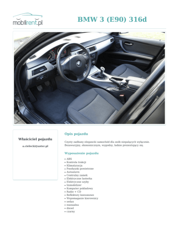 BMW 3 (E90) 316d Opis pojazdu Właściciel pojazdu [email protected] Czysty zadbany elegancki samochód dla osób niepalących wyłącznie. Bezawaryjny, ekonomicznym, wygodny, ładnie prezentujący się. Wyposażenie pojazdu ● ● ● ● ● ● ● ● ● ● ● ● ● ● ● ● ● ABS Kontrola trakcji Klimatyzacja Pooduszki powietrzne Autoalarm Centralny zamek Elektryczne lusterka Elektryczne szyby Immobilizer Komputer pokładowy Radio + CD Reflektory ksenonowe Wspomaganie kierownicy sedan manualna diesel czarny Rezerwacje Początek rezerwacji Koniec rezerwacji