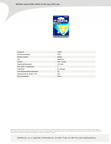 BATERIA ALKALICZNA VARTA V13GA (typ LR44) 2szt Producent VARTA Symbol producenta 4276 Rodzaj produktu Baterie Typ Alkaliczna Rozmiar R44 / V13GA Pojemność/Zawartość 125 mAh Ilość sztuk w opakowaniu 2 Gwarancja 24 miesiące Znak bezpieczeństwa/zgodności CE Dopuszczenie do obrotu w RP Tak Kraj pochodzenia Chiny Dokładamy wszelkich starań aby podane zdjęcie i opis były w pełni prawidłowe i kompletne. Niestety, nie możemy zagwarantować, że podane dane nie zawierają pomyłek i błędów, które jednak nie mogą być podstawą do ewentualnych roszczeń. W razie jakichkolwiek wątpliwości lub chęci uzyskania dodatkowych informacji prosimy o kontakt z działem handlowym. Prezentowane informacje nie stanowią oferty handlowej w rozumieniu Kodeksu Cywilnego. Multioffice Sp. z o.o. ul. Zawiła 65D, 30-390 Kraków tel.: 012 2999 777 faks: 012 2999 778 e-mail: [email protected]