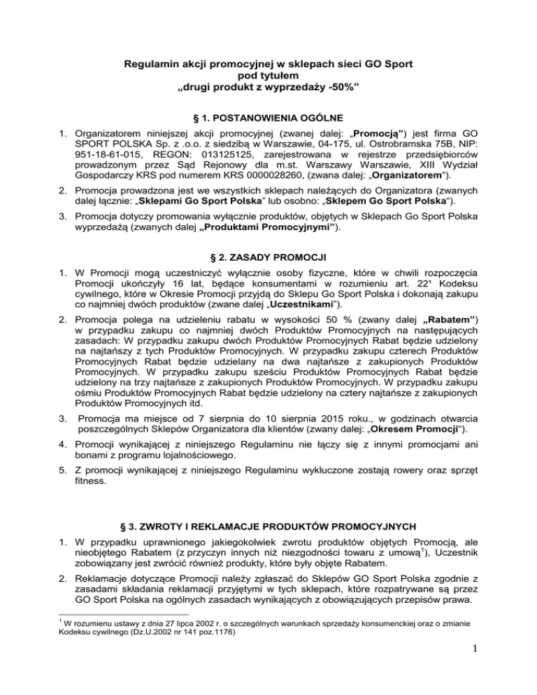Regulamin akcji promocyjnej w sklepach sieci GO Sport pod tytułem „drugi produkt z wyprzedaży -50%” § 1. POSTANOWIENIA OGÓLNE 1. Organizatorem niniejszej akcji promocyjnej (zwanej dalej: „Promocją”) jest firma GO SPORT POLSKA Sp. z .o.o. z siedzibą w Warszawie, 04-175, ul. Ostrobramska 75B, NIP: 951-18-61-015, REGON: 013125125, zarejestrowana w rejestrze przedsiębiorców prowadzonym przez Sąd Rejonowy dla m.st. Warszawy Warszawie, XIII Wydział Gospodarczy KRS pod numerem KRS 0000028260, (zwana dalej: „Organizatorem“). 2. Promocja prowadzona jest we wszystkich sklepach należących do Organizatora (zwanych dalej łącznie: „Sklepami Go Sport Polska” lub osobno: „Sklepem Go Sport Polska“). 3. Promocja dotyczy promowania wyłącznie produktów, objętych w Sklepach Go Sport Polska wyprzedażą (zwanych dalej „Produktami Promocyjnymi”). § 2. ZASADY PROMOCJI 1. W Promocji mogą uczestniczyć wyłącznie osoby fizyczne, które w chwili rozpoczęcia Promocji ukończyły 16 lat, będące konsumentami w rozumieniu art. 22¹ Kodeksu cywilnego, które w Okresie Promocji przyjdą do Sklepu Go Sport Polska i dokonają zakupu co najmniej dwóch produktów (zwane dalej „Uczestnikami”). 2. Promocja polega na udzieleniu rabatu w wysokości 50 % (zwany dalej „Rabatem”) w przypadku zakupu co najmniej dwóch Produktów Promocyjnych na następujących zasadach: W przypadku zakupu dwóch Produktów Promocyjnych Rabat będzie udzielony na najtańszy z tych Produktów Promocyjnych. W przypadku zakupu czterech Produktów Promocyjnych Rabat będzie udzielany na dwa najtańsze z zakupionych Produktów Promocyjnych. W przypadku zakupu sześciu Produktów Promocyjnych Rabat będzie udzielony na trzy najtańsze z zakupionych Produktów Promocyjnych. W przypadku zakupu ośmiu Produktów Promocyjnych Rabat będzie udzielony na cztery najtańsze z zakupionych Produktów Promocyjnych itd. 3. Promocja ma miejsce od 7 sierpnia do 10 sierpnia 2015 roku., w godzinach otwarcia poszczególnych Sklepów Organizatora dla klientów (zwany dalej: „Okresem Promocji“). 4. Promocji wynikającej z niniejszego Regulaminu nie łączy się z innymi promocjami ani bonami z programu lojalnościowego. 5. Z promocji wynikającej z niniejszego Regulaminu wykluczone zostają rowery oraz sprzęt fitness. § 3. ZWROTY I REKLAMACJE PRODUKTÓW PROMOCYJNYCH 1. W przypadku uprawnionego jakiegokolwiek zwrotu produktów objętych Promocją, ale nieobjętego Rabatem (z przyczyn innych niż niezgodności towaru z umową1), Uczestnik zobowiązany jest zwrócić również produkty, które były objęte Rabatem. 2. Reklamacje dotyczące Promocji należy zgłaszać do Sklepów GO Sport Polska zgodnie z zasadami składania reklamacji przyjętymi w tych sklepach, które rozpatrywane są przez GO Sport Polska na ogólnych zasadach wynikających z obowiązujących przepisów prawa. 1 W rozumienu ustawy z dnia 27 lipca 2002 r. o szczególnych warunkach sprzedaży konsumenckiej oraz o zmianie Kodeksu cywilnego (Dz.U.2002 nr 141 poz.1176) 1 3. Dane osobowe Uczestników Promocji składających reklamacje wskazane w §3 ust. 2 będą wykorzystywane zgodnie z ustawą o ochronie danych osobowych z dnia 29 sierpnia 1997 r. (Dz. U. z 2002 r. Nr 101, poz. 926 z późn. zm.), wyłącznie w celach związanych przedmiotowo z rozpoznaniem reklamacji. Administratorem danych osobowych Uczestników Promocji jest GO Sport Polska Sp. z o.o. z siedzibą w Warszawie. Każdy Uczestnik Promocji ma prawo wglądu do swoich danych, do ich poprawiania oraz usunięcia. Podanie danych osobowych jest dobrowolne jednak niezbędne dla rozpatrzenia reklamacji. § 4. POSTANOWIENIA KOŃCOWE 1. W sprawach nieuregulowanych niniejszym Regulaminem zastosowanie maja odpowiednie przepisy kodeksu cywilnego. Wszelkie spory wynikłe z tytułu wykonania zobowiązań związanych z niniejszą Promocją będą rozstrzygane przez sąd właściwy dla siedziby Organizatora. 2. Niniejszy Regulamin nie stanowi wzorca umowy w rozumieniu art. 384 §1 Kodeksu cywilnego. Określa on zasady prowadzenia Promocji. 3. Uczestnik nie może się powoływać na nieznajomość niniejszego Regulaminu, jeżeli bierze lub brał udział w Promocji. 4. Zasady Promocji określa wyłącznie niniejszy Regulamin. Wszelkie materiały reklamowe i promocyjne dotyczące Promocji mają charakter wyłącznie informacyjny. 5. Organizator zastrzega sobie prawo zmiany Regulaminu lub warunków Promocji, jeżeli jest to uzasadnione celem Promocji. Organizator zastrzega sobie również prawo przerwania Promocji w razie zaistnienia ważnych przyczyn po stronie Organizatora. Zmiany w Regulaminie nie mogą naruszać praw nabytych przez Uczestników Promocji przed dokonaniem zmiany. 6. Niniejszy Regulamin dostępny jest dla Uczestników w Sklepach GO Sport Polska oraz w siedzibie Organizatora. 7. W wypadku jakichkolwiek wątpliwości związanych ze stosowaniem Regulaminu Organizator zastrzega sobie prawo do ostatecznej interpretacji jego postanowień. W przypadku wątpliwości, co do stosowania regulaminu Uczestnik ma w każdym czasie prawo zwrócić się do Organizatora o dokonanie właściwej wykładni jego postanowień. 2