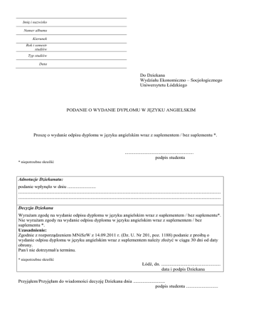 Imię i nazwisko Numer albumu Kierunek Rok i semestr studiów Typ studiów Data Do Dziekana Wydziału Ekonomiczno – Socjologicznego Uniwersytetu Łódzkiego PODANIE O WYDANIE DYPLOMU W JĘZYKU ANGIELSKIM Proszę o wydanie odpisu dyplomu w języku angielskim wraz z suplementem / bez suplementu *. .......................................................... podpis studenta * niepotrzebne skreślić Adnotacje Dziekanatu: podanie wpłynęło w dniu ........................ ............................................................................................................................................................. ............................................................................................................................................................. Decyzja Dziekana Wyrażam zgodę na wydanie odpisu dyplomu w języku angielskim wraz z suplementem / bez suplementu*. Nie wyrażam zgody na wydanie odpisu dyplomu w języku angielskim wraz z suplementem / bez suplementu *. Uzasadnienie: Zgodnie z rozporządzeniem MNiSzW z 14.09.2011 r. (Dz. U. Nr 201, poz. 1188) podanie z prośbą o wydanie odpisu dyplomu w języku angielskim wraz z suplementem należy złożyć w ciągu 30 dni od daty obrony. Pan/i nie dotrzymał/a terminu. * niepotrzebne skreślić Łódź, dn. .................................................. data i podpis Dziekana Przyjąłem/Przyjęłam do wiadomości decyzję Dziekana dnia ........................... podpis studenta ...........................
