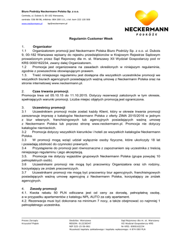 Biuro Podróży Neckermann Polska Sp. z o.o. Centrala, ul. Dubois 9, 00-182 Warszawa, centrala: 536 98 98, infolinia: 804 200 111, z tel. kom 222 120 500 www.neckermann.pl [email protected] Regulamin Customer Week 1. Organizator 1.1 Organizatorem promocji jest Neckermann Polska Biuro Podróży Sp. z o.o. ul. Dubois 9, 00-182 Warszawa wpisany do rejestru przedsiębiorców w Krajowym Rejestrze Sądowym prowadzonym przez Sąd Rejonowy dla m. st. Warszawy XII Wydział Gospodarczy pod nr KRS 0000162234, zwany dalej Organizatorem. 1.2 Promocja jest organizowana na zasadach określonych w niniejszym regulaminie, zgodnie z powszechnie obowiązującym prawem. 1.3. Treść niniejszego regulaminu jest dostępna dla wszystkich uczestników promocji we wszystkich biurach agencyjnych posiadających ważną umowę z Neckermann Polska oraz na stronie internetowej www.neckermann.pl. 2. Czas trwania promocji. Promocja trwa od 05.10.15 do 11.10.2015. Dotyczy rezerwacji założonych w tym okresie, spełniających warunki promocji. Liczba miejsc objętych promocją jest ograniczona. 3. Uczestnicy promocji 3.1 Uczestnikiem promocji może zostać każdy Klient, który w okresie trwania promocji zarezerwuje imprezę z katalogów Neckermann Polska z oferty ZIMA 2015/2016 w jednym z biur własnych, franchisingowych lub agencyjnych posiadających ważną umowę z Neckermann Polska lub poprzez stronę www.neckermann.pl. Promocja nie dotyczy katalogów niemieckich. 3.2 Promocja dotyczy wszystkich kierunków i hoteli ze wszystkich katalogów Neckermann Polska. 3.3 W promocji mogą wziąć udział wyłącznie osoby fizyczne, które ukończyły 18 lat i posiadają zdolność do czynności prawnych. 3.4 Przystąpienie do promocji jest równoznaczne z zapoznaniem się uczestnika z treścią niniejszego regulaminu i jego akceptacją. 3.5. Promocja nie dotyczy wyjazdów grupowych Neckermann Polska (grupa powyżej 10 pełnopłatnych osób). 3.6 Uczestnikami promocji nie mogą być pracownicy Organizatora oraz ich rodziny, korzystający ze zniżek pracowniczych. 3.7 Uczestnikami promocji nie mogą być pracownicy biur agencyjnych, franchisingowych posiadających ważną umowę agencyjną z Neckermann Polska, korzystający ze zniżek agencyjnych. 4. Zasady promocji 4.1. Kwota rabatu 50 PLN odliczana jest od ceny za dorosłą, pełnopłatną osobę, a w przypadku apartamentów z katalogu NPL AUTO za cały apartament. 4.2. Rezerwacja musi być dokonana na minimum 7 nocy, a także obejmować co najmniej 1 pełnopłatnego uczestnika. Prezes Zarządu Krzysztof Piątek Siedziba: Warszawa REGON: 012238347 Sąd Rejonowy dla m. st. Warszawy XII Wydział Gospodarczy KRS NIP 525-15-56-861 Nr KRS: 0000162234 Wysokość kapitału zakładowego i kapitału wpłaconego: 4 874 000 PLN Biuro Podróży Neckermann Polska Sp. z o.o. Centrala, ul. Dubois 9, 00-182 Warszawa, centrala: 536 98 98, infolinia: 804 200 111, z tel. kom 222 120 500 www.neckermann.pl [email protected] 4.3 W celu naliczenia rabatu biuro dokonujące rezerwacji jest zobowiązane do przesłania numeru rezerwacji na adres: [email protected] w nieprzekraczalnym terminie do środy 14.10.2015. Po tym terminie zgłoszenia nie będą akceptowane. 4.4 Rabat 50 PLN łączy się z innym promocjami obowiązującymi w trakcie trwania promocji, również z Kartą Stałego Klienta. 5. Rezygnacja lub anulacja wyjazdu 5.1 W przypadku rezygnacji z podróży przez uczestnika promocji, zastosowanie mają postanowienia umowy oświadczenie usług turystycznych oraz aktualnie obowiązujące Warunki Imprez Turystycznych i Warunki Płatności Neckermann Polska Biura Podróży Sp. z o.o. W przypadku rezygnacji rabat zostanie zdjęty z rezerwacji. 5.2 W przypadku rozwiązania umowy z winy Organizatora uczestnicy nabywają prawo do zachowania otrzymanej w dniu rezerwacji promocji na nową rezerwację. 6. Postanowienia końcowe 6.1. Neckermann Polska zastrzega sobie prawo do zawieszenia, przerwania, przedłużenia lub odwołania promocji bez podania przyczyn. Przy czym wszystkie rezerwacje dokonane do momentu opublikowania przez Neckermann Polska jednej z powyższych decyzji na temat promocji, pozostaną nią objęte. Prezes Zarządu Krzysztof Piątek Siedziba: Warszawa REGON: 012238347 Sąd Rejonowy dla m. st. Warszawy XII Wydział Gospodarczy KRS NIP 525-15-56-861 Nr KRS: 0000162234 Wysokość kapitału zakładowego i kapitału wpłaconego: 4 874 000 PLN