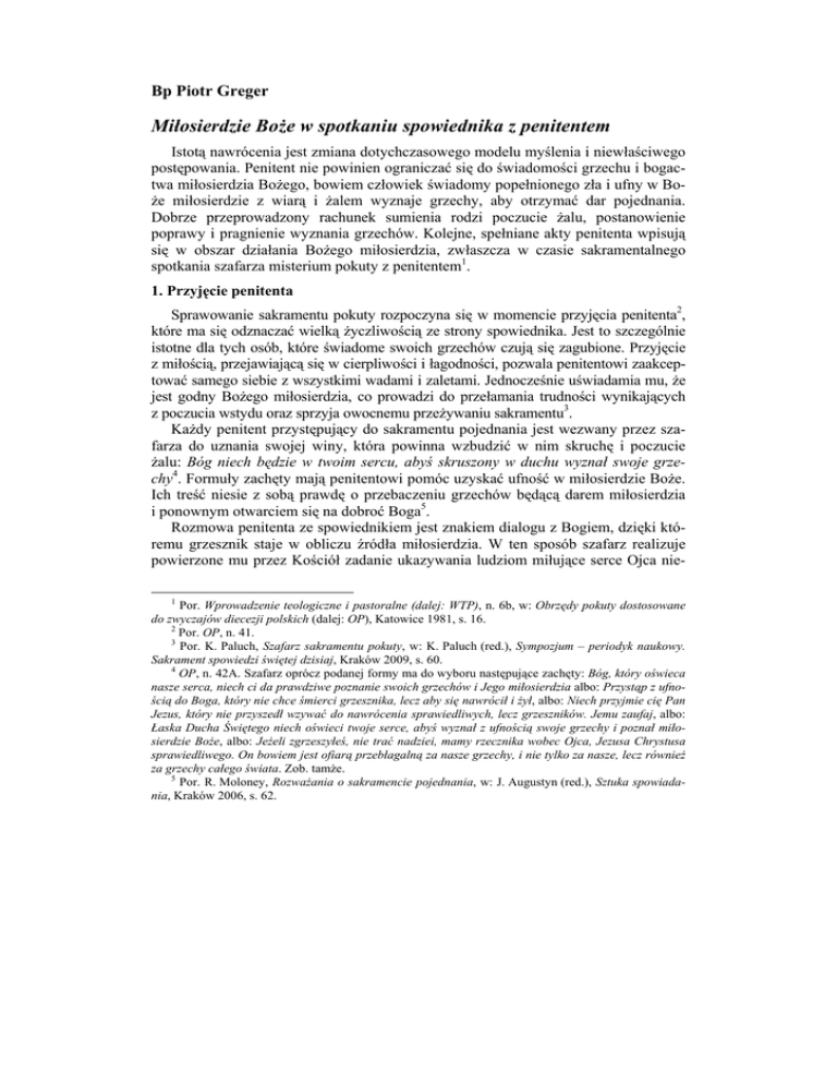 Bp Piotr Greger Miłosierdzie Boże w spotkaniu spowiednika z penitentem Istotą nawrócenia jest zmiana dotychczasowego modelu myślenia i niewłaściwego postępowania. Penitent nie powinien ograniczać się do świadomości grzechu i bogactwa miłosierdzia Bożego, bowiem człowiek świadomy popełnionego zła i ufny w Boże miłosierdzie z wiarą i żalem wyznaje grzechy, aby otrzymać dar pojednania. Dobrze przeprowadzony rachunek sumienia rodzi poczucie żalu, postanowienie poprawy i pragnienie wyznania grzechów. Kolejne, spełniane akty penitenta wpisują się w obszar działania Bożego miłosierdzia, zwłaszcza w czasie sakramentalnego spotkania szafarza misterium pokuty z penitentem1. 1. Przyjęcie penitenta Sprawowanie sakramentu pokuty rozpoczyna się w momencie przyjęcia penitenta2, które ma się odznaczać wielką życzliwością ze strony spowiednika. Jest to szczególnie istotne dla tych osób, które świadome swoich grzechów czują się zagubione. Przyjęcie z miłością, przejawiającą się w cierpliwości i łagodności, pozwala penitentowi zaakceptować samego siebie z wszystkimi wadami i zaletami. Jednocześnie uświadamia mu, że jest godny Bożego miłosierdzia, co prowadzi do przełamania trudności wynikających z poczucia wstydu oraz sprzyja owocnemu przeżywaniu sakramentu3. Każdy penitent przystępujący do sakramentu pojednania jest wezwany przez szafarza do uznania swojej winy, która powinna wzbudzić w nim skruchę i poczucie żalu: Bóg niech będzie w twoim sercu, abyś skruszony w duchu wyznał swoje grzechy4. Formuły zachęty mają penitentowi pomóc uzyskać ufność w miłosierdzie Boże. Ich treść niesie z sobą prawdę o przebaczeniu grzechów będącą darem miłosierdzia i ponownym otwarciem się na dobroć Boga5. Rozmowa penitenta ze spowiednikiem jest znakiem dialogu z Bogiem, dzięki któremu grzesznik staje w obliczu źródła miłosierdzia. W ten sposób szafarz realizuje powierzone mu przez Kościół zadanie ukazywania ludziom miłujące serce Ojca nie1 Por. Wprowadzenie teologiczne i pastoralne (dalej: WTP), n. 6b, w: Obrzędy pokuty dostosowane do zwyczajów diecezji polskich (dalej: OP), Katowice 1981, s. 16. 2 Por. OP, n. 41. 3 Por. K. Paluch, Szafarz sakramentu pokuty, w: K. Paluch (red.), Sympozjum – periodyk naukowy. Sakrament spowiedzi świętej dzisiaj, Kraków 2009, s. 60. 4 OP, n. 42A. Szafarz oprócz podanej formy ma do wyboru następujące zachęty: Bóg, który oświeca nasze serca, niech ci da prawdziwe poznanie swoich grzechów i Jego miłosierdzia albo: Przystąp z ufnością do Boga, który nie chce śmierci grzesznika, lecz aby się nawrócił i żył, albo: Niech przyjmie cię Pan Jezus, który nie przyszedł wzywać do nawrócenia sprawiedliwych, lecz grzeszników. Jemu zaufaj, albo: Łaska Ducha Świętego niech oświeci twoje serce, abyś wyznał z ufnością swoje grzechy i poznał miłosierdzie Boże, albo: Jeżeli zgrzeszyłeś, nie trać nadziei, mamy rzecznika wobec Ojca, Jezusa Chrystusa sprawiedliwego. On bowiem jest ofiarą przebłagalną za nasze grzechy, i nie tylko za nasze, lecz również za grzechy całego świata. Zob. tamże. 5 Por. R. Moloney, Rozważania o sakramencie pojednania, w: J. Augustyn (red.), Sztuka spowiadania, Kraków 2006, s. 62. Bp Piotr Greger 58 bieskiego6. Dialog taki musi charakteryzować się wielką kulturą obu stron, a zwłaszcza spowiednika. Dlatego powinien unikać on rozproszeń w momencie słuchania spowiedzi, podejrzliwości, zadawania niedyskretnych pytań, słów obrażających poczucie godności penitenta, uwag i pytań ingerujących w intymną sferę, pobieżnych ocen moralnych, schematycznych i surowych pouczeń. Jednak najbardziej bolesną ranę pozostawiają pytania kapłana sugerujące, jakoby penitent nie był w wyznaniu grzechów całkowicie szczery7. Należy pamiętać, że spowiednik oddziałuje na penitenta nie tylko przez pouczenia, ale całą swoją osobowością. Treść i siła oddziaływania rodzi u penitentów różny skutek, nie zawsze pozytywny8. Do spowiednika należy troska o zachowanie spokoju i umożliwienie penitentowi całkowitego wyznania grzechów. Dlatego należy unikać pośpiechu czy wprowadzenia nerwowej atmosfery. Spowiedź jest formą spotkania chorego człowieka z lekarzem, który chcąc postawić odpowiednią diagnozę, musi dogłębnie zbadać sprawę i dotrzeć do sedna prawdy9. Podobnie jak choroba może być przewlekła, tak i uzdrowienie z grzechu wymaga odpowiedniego czasu. Spowiedź penitenta, który zmaga się z tym samym grzechem, wymaga od spowiednika roztropności i cierpliwości, ale także wiedzy popartej doświadczeniem i modlitwą. Sprzyja to poznaniu całej prawdy, która ma być odkrywana w perspektywie miłości10. Taka pomoc staje się odczytaniem działania Bożej łaski, ponieważ rozeznanie duchów jest wewnętrznym poznaniem działania Bożego w sercach ludzkich, darem Ducha Świętego i owocem miłości11. Pomoc spowiednika wyraża się również w napominaniu penitenta, że każdy grzech jest obrazą Boga oraz wymaga wzbudzenia żalu i postanowienia poprawy, które w konsekwencji prowadzą do odnowy życia chrześcijańskiego, a także przywrócenia właściwych relacji z Bogiem12. W pobudzeniu grzesznika do żalu pomocne jest przypomnienie, że Jezus umarł na krzyżu i zmartwychwstał dla usprawiedliwienia człowieka. Należy również uświadomić, że Chrystus działa zbawczo w sakramentach i pragnie przebaczyć grzechy każdemu człowiekowi, który się do Niego zwraca13. W ten sposób kapłan wskazuje na źródło przebaczenia, którym jest miłosierdzie Boga. Jest to sprawa ogromnej wagi, ponieważ prawdziwość pokuty zależy od skruchy serca. Nawrócenie powinno dotknąć wnętrza człowieka, aby go coraz głębiej oświecać i coraz bardziej upodabniać do Chrystusa14. Spowiednikowi powinna towarzyszyć bezustanna świadomość, że sprawuje on urząd Chrystusa, który dla zbawienia ludzi d