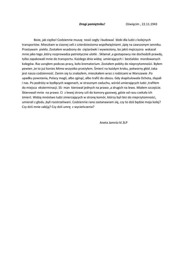 Drogi pamiętniku! Oświęcim , 22.11.1943 Boże, jak ciężko! Codziennie muszę nosić cegły i budować bloki dla ludzi z kolejnych transportów. Mieszkam w ciasnej celi z czterdziestoma współwięźniami ,śpię na zawszonym senniku. Przeżywam piekło. Zostałem wsadzony do ciężarówki i wywieziony, bo jakiś mężczyzna wskazał mnie jako tego ,który rozprowadza patriotyczne ulotki . Skłamał ,a gestapowcy nie dochodzili prawdy, tylko zapakowali mnie do transportu. Każdego dnia widzę umierających i bestialsko mordowanych kolegów. Raz usnąłem podczas pracy, koło krematorium. Zostałem pobity do nieprzytomności. Byłem pewien ,że to już koniec Mimo wszystko przeżyłem. Śmierć na każdym kroku, potworny głód ,taka jest nasza codzienność. Zanim się tu znalazłem, mieszkałem wraz z rodzicami w Warszawie .Po upadku powstania, Polacy mogli, albo zginąć, albo trafić do obozu. Gdy skapitulowała Ochota, złapali i nas. Po podróży w bydlęcych wagonach, w strasznym zaduchu, wśród umierających ludzi ,trafiłem do miejsca eksterminacji. SS- man kierował jednych na prawo ,a drugich na lewo. Miałem szczęście. Skierowali mnie na prawo. Ci z lewej strony szli do komory gazowej, gdzie od razu czekała ich śmierć. Widzę mnóstwo ludzi zmierzających w stronę komór, którzy byli bici do nieprzytomności, umierali z głodu ,byli rozstrzeliwani. Codziennie rano zastanawiam się, czy to dziś będzie moja kolej? Czy dziś mnie zabiją? Czy dziś umrę z wycieńczenia? Aneta Jamróz kl.3LP