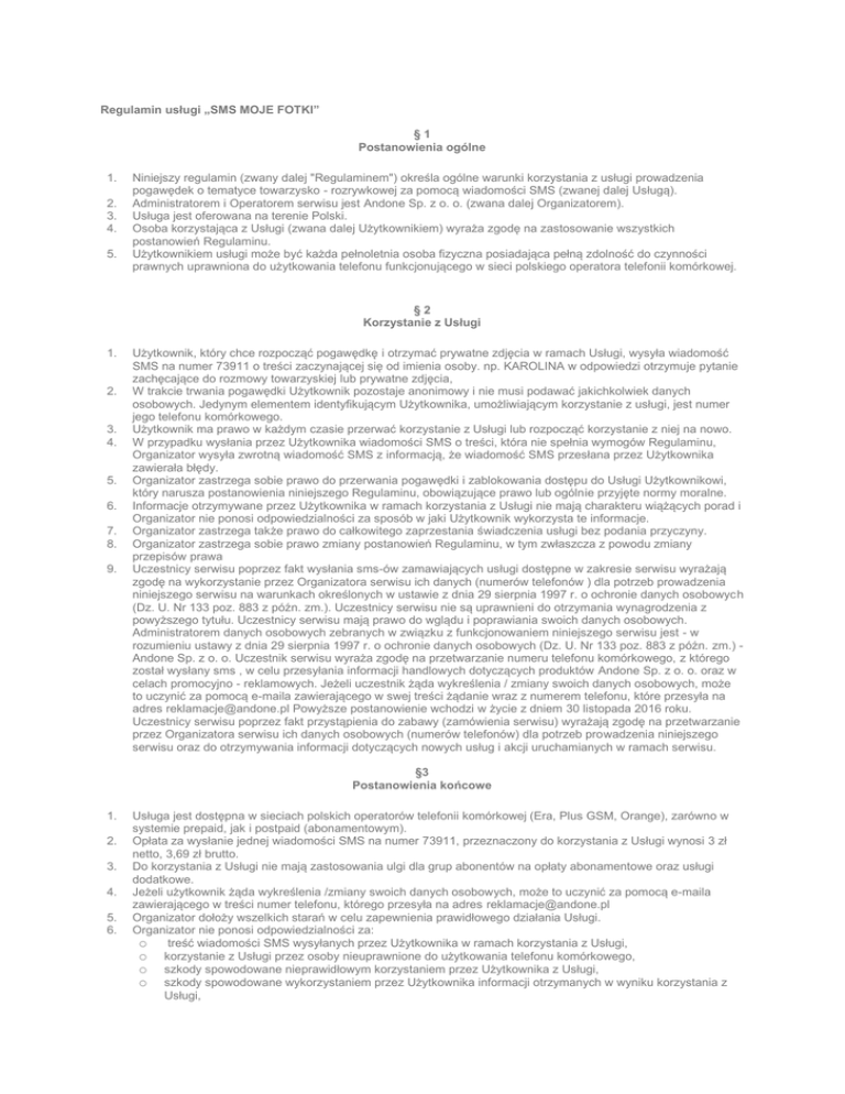 Regulamin usługi „SMS MOJE FOTKI” § 1 Postanowienia ogólne 1