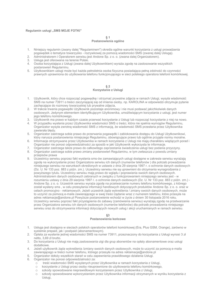 Regulamin usługi „SMS MOJE FOTKI” §1 Postanowienia ogólne 1. 2. 3. 4. 5. Niniejszy regulamin (zwany dalej "Regulaminem") określa ogólne warunki korzystania z usługi prowadzenia pogawędek o tematyce towarzysko - rozrywkowej za pomocą wiadomości SMS (zwanej dalej Usługą). Administratorem i Operatorem serwisu jest Andone Sp. z o. o. (zwana dalej Organizatorem). Usługa jest oferowana na terenie Polski. Osoba korzystająca z Usługi (zwana dalej Użytkownikiem) wyraża zgodę na zastosowanie wszystkich postanowień Regulaminu. Użytkownikiem usługi może być każda pełnoletnia osoba fizyczna posiadająca pełną zdolność do czynności prawnych uprawniona do użytkowania telefonu funkcjonującego w sieci polskiego operatora telefonii komórkowej. §2 Korzystanie z Usługi 1. 2. 3. 4. 5. 6. 7. 8. 9. Użytkownik, który chce rozpocząć pogawędkę i otrzymać prywatne zdjęcia w ramach Usługi, wysyła wiadomość SMS na numer 73911 o treści zaczynającej się od imienia osoby. np. KAROLINA w odpowiedzi otrzymuje pytanie zachęcające do rozmowy towarzyskiej lub prywatne zdjęcia, W trakcie trwania pogawędki Użytkownik pozostaje anonimowy i nie musi podawać jakichkolwiek danych osobowych. Jedynym elementem identyfikującym Użytkownika, umożliwiającym korzystanie z usługi, jest numer jego telefonu komórkowego. Użytkownik ma prawo w każdym czasie przerwać korzystanie z Usługi lub rozpocząć korzystanie z niej na nowo. W przypadku wysłania przez Użytkownika wiadomości SMS o treści, która nie spełnia wymogów Regulaminu, Organizator wysyła zwrotną wiadomość SMS z informacją, że wiadomość SMS przesłana przez Użytkownika zawierała błędy. Organizator zastrzega sobie prawo do przerwania pogawędki i zablokowania dostępu do Usługi Użytkownikowi, który narusza postanowienia niniejszego Regulaminu, obowiązujące prawo lub ogólnie przyjęte normy moralne. Informacje otrzymywane przez Użytkownika w ramach korzystania z Usługi nie mają charakteru wiążących porad i Organizator nie ponosi odpowiedzialności za sposób w jaki Użytkownik wykorzysta te informacje. Organizator zastrzega także prawo do całkowitego zaprzestania świadczenia usługi bez podania przyczyny. Organizator zastrzega sobie prawo zmiany postanowień Regulaminu, w tym zwłaszcza z powodu zmiany przepisów prawa Uczestnicy serwisu poprzez fakt wysłania sms-ów zamawiających usługi dostępne w zakresie serwisu wyrażają zgodę na wykorzystanie przez Organizatora serwisu ich danych (numerów telefonów ) dla potrzeb prowadzenia niniejszego serwisu na warunkach określonych w ustawie z dnia 29 sierpnia 1997 r. o ochronie danych osobowych (Dz. U. Nr 133 poz. 883 z późn. zm.). Uczestnicy serwisu nie są uprawnieni do otrzymania wynagrodzenia z powyższego tytułu. Uczestnicy serwisu mają prawo do wglądu i poprawiania swoich danych osobowych. Administratorem danych osobowych zebranych w związku z funkcjonowaniem niniejszego serwisu jest - w rozumieniu ustawy z dnia 29 sierpnia 1997 r. o ochronie danych osobowych (Dz. U. Nr 133 poz. 883 z późn. zm.) Andone Sp. z o. o. Uczestnik serwisu wyraża zgodę na przetwarzanie numeru telefonu komórkowego, z którego został wysłany sms , w celu przesyłania informacji handlowych dotyczących produktów Andone Sp. z o. o. oraz w celach promocyjno - reklamowych. Jeżeli uczestnik żąda wykreślenia / zmiany swoich danych osobowych, może to uczynić za pomocą e-maila zawierającego w swej treści żądanie wraz z numerem telefonu, które przesyła na adres [email protected] Powyższe postanowienie wchodzi w życie z dniem 30 listopada 2016 roku. Uczestnicy serwisu poprzez fakt przystąpienia do zabawy (zamówienia serwisu) wyrażają zgodę na przetwarzanie przez Organizatora serwisu ich danych osobowych (numerów telefonów) dla potrzeb prowadzenia niniejszego serwisu oraz do otrzymywania informacji dotyczących nowych usług i akcji uruchamianych w ramach serwisu. §3 Postanowienia końcowe 1. 2. 3. 4. 5. 6. Usługa jest dostępna w sieciach polskich operatorów telefonii komórkowej (Era, Plus GSM, Orange), zarówno w systemie prepaid, jak i postpaid (abonamentowym). Opłata za wysłanie jednej wiadomości SMS na numer 73911, przeznaczony do korzystania z Usługi wynosi 3 zł netto, 3,69 zł brutto. Do korzystania z Usługi nie mają zastosowania ulgi dla grup abonentów na opłaty abonamentowe oraz usługi dodatkowe. Jeżeli użytkownik żąda wykreślenia /zmiany swoich danych osobowych, może to uczynić za pomocą e-maila zawierającego w treści numer telefonu, którego przesyła na adres [email protected] Organizator dołoży wszelkich starań w celu zapewnienia prawidłowego działania Usługi. Organizator nie ponosi odpowiedzialności za: o treść wiadomości SMS wysyłanych przez Użytkownika w ramach korzystania z Usługi, o korzystanie z Usługi przez osoby nieuprawnione do użytkowania telefonu komórkowego, o szkody spowodowane nieprawidłowym korzystaniem przez Użytkownika z Usługi, o szkody spowodowane wykorzystaniem przez Użytkownika informacji otrzymanych w wyniku korzystania z Usługi, o 7. 8. 9. korzystanie z Usługi przez Użytkowników niezgodnie z postanowieniami niniejszego Regulaminu lub bez zapoznania się z Regulaminem, w tym zwłaszcza wynikające z niewłaściwego zrozumienia przez Użytkownika charakteru Usługi, Regulamin dostępny jest na stronie internetowej i-reg.pl oraz w siedzibie Organizatora. Reklamacje dotyczące Usługi SMS należy przesyłać mailowo na adres [email protected] Reklamacje Użytkowników dotyczące Usługi SMS będą załatwiane w formie pisemnej w terminie maksymalnie 30 dni od dnia przyjęcia reklamacji.