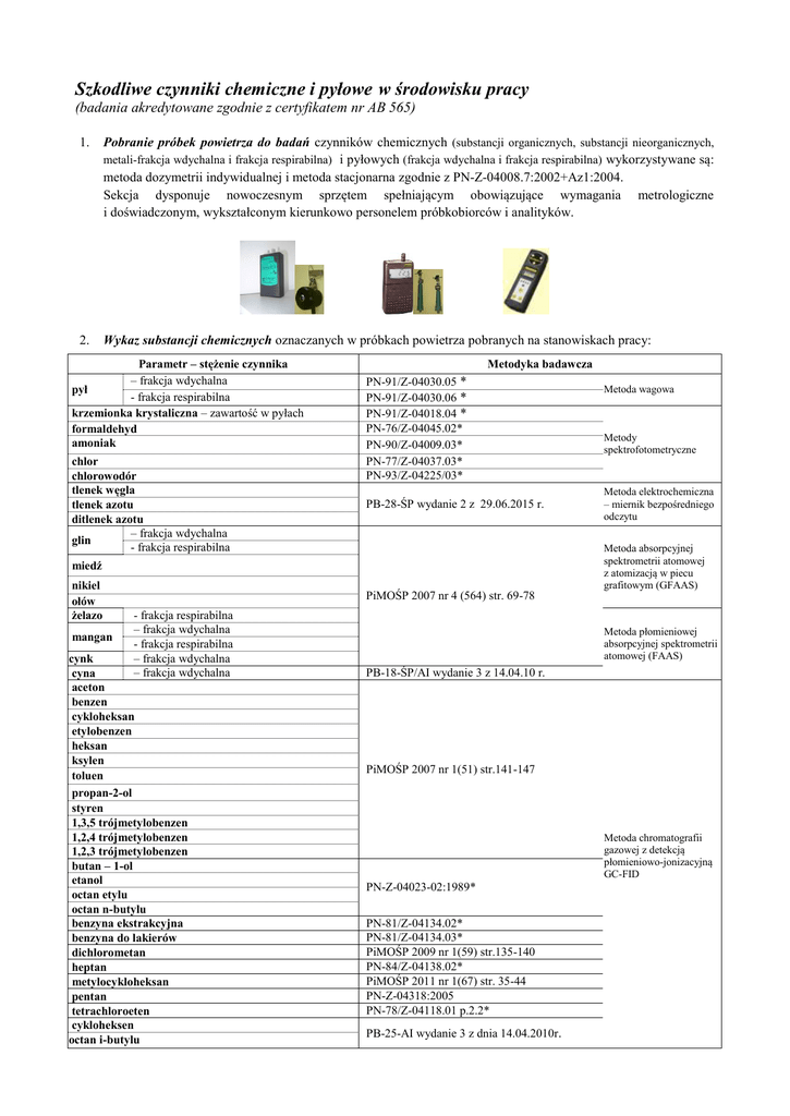 Szkodliwe czynniki chemiczne i pyłowe w środowisku pracy (badania akredytowane zgodnie z certyfikatem nr AB 565) 1. Pobranie próbek powietrza do badań czynników chemicznych (substancji organicznych, substancji nieorganicznych, metali-frakcja wdychalna i frakcja respirabilna) i pyłowych (frakcja wdychalna i frakcja respirabilna) wykorzystywane są: metoda dozymetrii indywidualnej i metoda stacjonarna zgodnie z PN-Z-04008.7:2002+Az1:2004. Sekcja dysponuje nowoczesnym sprzętem spełniającym obowiązujące wymagania metrologiczne i doświadczonym, wykształconym kierunkowo personelem próbkobiorców i analityków. 2. Wykaz substancji chemicznych oznaczanych w próbkach powietrza pobranych na stanowiskach pracy: Parametr – stężenie czynnika – frakcja wdychalna pył - frakcja respirabilna krzemionka krystaliczna – zawartość w pyłach formaldehyd amoniak chlor chlorowodór tlenek węgla tlenek azotu ditlenek azotu – frakcja wdychalna glin - frakcja respirabilna Metodyka badawcza PN-91/Z-04030.05 * PN-91/Z-04030.06 * PN-91/Z-04018.04 * PN-76/Z-04045.02* PN-90/Z-04009.03* PN-77/Z-04037.03* PN-93/Z-04225/03* PB-28-ŚP wydanie 2 z 29.06.2015 r. miedź nikiel ołów żelazo mangan PiMOŚP 2007 nr 4 (564) str. 69-78 - frakcja respirabilna – frakcja wdychalna - frakcja respirabilna – frakcja wdychalna – frakcja wdychalna cynk cyna aceton benzen cykloheksan etylobenzen heksan ksylen toluen propan-2-ol styren 1,3,5 trójmetylobenzen 1,2,4 trójmetylobenzen 1,2,3 trójmetylobenzen butan – 1-ol etanol octan etylu octan n-butylu benzyna ekstrakcyjna benzyna do lakierów dichlorometan heptan metylocykloheksan pentan tetrachloroeten cykloheksen octan i-butylu Metoda wagowa Metody spektrofotometryczne Metoda elektrochemiczna – miernik bezpośredniego odczytu Metoda absorpcyjnej spektrometrii atomowej z atomizacją w piecu grafitowym (GFAAS) Metoda płomieniowej absorpcyjnej spektrometrii atomowej (FAAS) PB-18-ŚP/AI wydanie 3 z 14.04.10 r. PiMOŚP 2007 nr 1(51) str.141-147 Metoda chromatografii gazowej z detekcją płomieniowo-jonizacyjną GC-FID PN-Z-04023-02:1989* PN-81/Z-04134.02* PN-81/Z-04134.03* PiMOŚP 2009 nr 1(59) str.135-140 PN-84/Z-04138.02* PiMOŚP 2011 nr 1(67) str. 35-44 PN-Z-04318:2005 PN-78/Z-04118.01 p.2.2* PB-25-AI wydanie 3 z dnia 14.04.2010r. *- norma wycofana ze zbioru Polskich Norm bez zastąpienia Aby prawidłowo określić zakres badań czynników toksycznych, należy oprzeć się na kartach charakterystyki wykorzystywanych preparatów lub określić zakres badań w porozumieniu z nadzorującym zakład Państwowym Powiatowym Inspektorem Sanitarnym. W celu odpowiedniego przygotowania laboratorium do badań prosimy o dostarczenie wraz ze zleceniem kart charakterystyki wykorzystywanych preparatów. W odniesieniu do stanowisk spawania prosimy o zawarcie w zleceniu informacji na temat: rodzaj spawania, materiał spawany, gaz osłonowy, wentylacja stanowiska, typ elektrody lub drutu (karta charakterystyki, środki ochrony, odzież ochronna). W przypadku braku możliwości oznaczeń przez PSSE Siedlce lub braku akredytacji na wymagane przez państwa oznaczenie, proponujemy korzystanie z usług akredytowanych podwykonawców oznaczeń, sami wówczas pobieramy próbki.