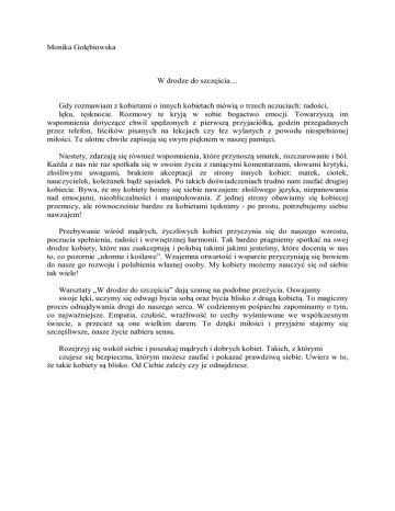 Monika Gołębiowska W drodze do szczęścia… Gdy rozmawiam z kobietami o innych kobietach mówią o trzech uczuciach: radości, lęku, tęsknocie. Rozmowy te kryją w sobie bogactwo emocji. Towarzyszą im wspomnienia dotyczące chwil spędzonych z pierwszą przyjaciółką, godzin przegadanych przez telefon, liścików pisanych na lekcjach czy łez wylanych z powodu niespełnionej miłości. Te ulotne chwile zapisują się swym pięknem w naszej pamięci. Niestety, zdarzają się również wspomnienia, które przynoszą smutek, rozczarowanie i ból. Każda z nas nie raz spotkała się w swoim życiu z raniącymi komentarzami, słowami krytyki, złośliwymi uwagami, brakiem akceptacji ze strony innych kobiet: matek, ciotek, nauczycielek, koleżanek bądź sąsiadek. Po takich doświadczeniach trudno nam zaufać drugiej kobiecie. Bywa, że my kobiety boimy się siebie nawzajem: złośliwego języka, niepanowania nad emocjami, nieobliczalności i manipulowania. Z jednej strony obawiamy się kobiecej przemocy, ale równocześnie bardzo za kobietami tęsknimy - po prostu, potrzebujemy siebie nawzajem! Przebywanie wśród mądrych, życzliwych kobiet przyczynia się do naszego wzrostu, poczucia spełnienia, radości i wewnętrznej harmonii. Tak bardzo pragniemy spotkać na swej drodze kobiety, które nas zaakceptują i polubią takimi jakimi jesteśmy, które docenią w nas to, co pozornie „ułomne i koślawe”. Wzajemna otwartość i wsparcie przyczyniają się bowiem do nasze go rozwoju i polubienia własnej osoby. My kobiety możemy nauczyć się od siebie tak wiele! Warsztaty „W drodze do szczęścia” dają szansę na podobne przeżycia. Oswajamy swoje lęki, uczymy się odwagi bycia sobą oraz bycia blisko z drugą kobietą. To magiczny proces odnajdywania drogi do naszego serca. W codziennym pośpiechu zapominamy o tym, co najważniejsze. Empatia, czułość, wrażliwość to cechy wyśmiewane we współczesnym świecie, a przecież są one wielkim darem. To dzięki miłości i przyjaźni stajemy się szczęśliwsze, nasze życie nabiera sensu. Rozejrzyj się wokół siebie i poszukaj mądrych i dobrych kobiet. Takich, z którymi czujesz się bezpieczna, którym możesz zaufać i pokazać prawdziwą siebie. Uwierz w to, że takie kobiety są blisko. Od Ciebie zależy czy je odnajdziesz.