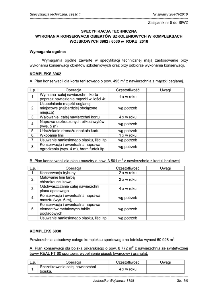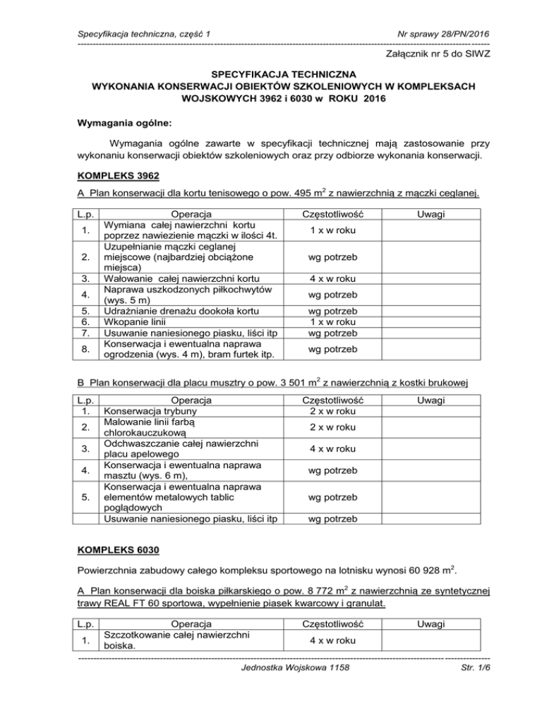 Specyfikacja techniczna, część 1 Nr sprawy 28/PN/2016 ---------------------------------------------------------------------------------------------------------------------------------------- Załącznik nr 5 do SIWZ SPECYFIKACJA TECHNICZNA WYKONANIA KONSERWACJI OBIEKTÓW SZKOLENIOWYCH W KOMPLEKSACH WOJSKOWYCH 3962 i 6030 w ROKU 2016 Wymagania ogólne: Wymagania ogólne zawarte w specyfikacji technicznej mają zastosowanie przy wykonaniu konserwacji obiektów szkoleniowych oraz przy odbiorze wykonania konserwacji. KOMPLEKS 3962 A Plan konserwacji dla kortu tenisowego o pow. 495 m2 z nawierzchnią z mączki ceglanej. L.p. 1. 2. 3. 4. 5. 6. 7. 8. Operacja Wymiana całej nawierzchni kortu poprzez nawiezienie mączki w ilości 4t. Uzupełnianie mączki ceglanej miejscowe (najbardziej obciążone miejsca) Wałowanie całej nawierzchni kortu Naprawa uszkodzonych piłkochwytów (wys. 5 m) Udrażnianie drenażu dookoła kortu Wkopanie linii Usuwanie naniesionego piasku, liści itp Konserwacja i ewentualna naprawa ogrodzenia (wys. 4 m), bram furtek itp. Częstotliwość Uwagi 1 x w roku wg potrzeb 4 x w roku wg potrzeb wg potrzeb 1 x w roku wg potrzeb wg potrzeb B Plan konserwacji dla placu musztry o pow. 3 501 m2 z nawierzchnią z kostki brukowej L.p. Operacja 1. Konserwacja trybuny Malowanie linii farbą 2. chlorokauczukową Odchwaszczanie całej nawierzchni 3. placu apelowego Konserwacja i ewentualna naprawa 4. masztu (wys. 6 m), Konserwacja i ewentualna naprawa 5. elementów metalowych tablic poglądowych Usuwanie naniesionego piasku, liści itp Częstotliwość 2 x w roku Uwagi 2 x w roku 4 x w roku wg potrzeb wg potrzeb wg potrzeb KOMPLEKS 6030 Powierzchnia zabudowy całego kompleksu sportowego na lotnisku wynosi 60 928 m2. A Plan konserwacji dla boiska piłkarskiego o pow. 8 772 m2 z nawierzchnią ze syntetycznej trawy REAL FT 60 sportowa, wypełnienie piasek kwarcowy i granulat. L.p. 1. Operacja Szczotkowanie całej nawierzchni boiska. Częstotliwość Uwagi 4 x w roku ------------------------------------------------------------------------------------------------------------------------- --------------Jednostka Wojskowa 1158 Str. 1/6 Specyfikacja techniczna, część 1 Nr sprawy 28/PN/2016 ---------------------------------------------------------------------------------------------------------------------------------------- 2. 3. 4. 5. 6. 7. 8. 9. Uzupełnianie granulatu miejscowe najbardziej obciążone miejsca: pole bramkowe, rzut karny, rzut rożny) Uzupełnianie granulatu na całej nawierzchni boiska Wymiana punktu bramkowego Wymiana obciążanych miejsc Naprawa uszkodzonych piłkochwytów (wys. 5 m) Udrażnianie drenażu dookoła boiska piłkarskiego Przewietrzanie dekompresja Czyszczenie całej powierzchni boiska specjalistycznymi maszynami min 1 x 2 tygodnie wg potrzeb wg potrzeb wg potrzeb wg potrzeb wg potrzeb 4 x w roku 4 x w roku B Plan konserwacji bieżni lekkoatletycznej o pow. 3 467m2 z nawierzchnią poliuretanową CONPIDUR (bezspoinowa, nieprzepuszczalna dla wody, kolor zielony, białe linie wklejone w nawierzchnię) L.p. Operacja 1. Wymiana obciążanych miejsc 2. Usuwanie naniesionego piasku, liści itp Konserwacja urządzeń do skoku w dal 3. (uzupełnianie piasku) i wzwyż Naprawa uszkodzonych siedzeń na 4. trybunie Konserwacja urządzeń do skoku w 5. wzwyż Czyszczenie całej powierzchni bieżni 6. specjalistycznymi maszynami Częstotliwość wg potrzeb wg potrzeb Uwagi wg potrzeb wg potrzeb 400 miejsc pow. 678 m2 wg potrzeb 4 x w roku C Plan konserwacji zespołu kortów tenisowych (3 szt.) o pow. 2 265 m2 z nawierzchnią z trawy syntetycznej w kolorze zielonym, wypełnienie piasek kwarcowy, linie wklejone w nawierzchnie w kolorze białym i żółtym. L.p. 1. 2. 3. 4. 5. 6. 7. 8. Operacja Szczotkowanie całej nawierzchni boiska. Uzupełnianie granulatu miejscowe najbardziej obciążone miejsca. Uzupełnianie granulatu na całej nawierzchni boiska Wymiana obciążanych miejsc Konserwacja i ewentualna naprawa ogrodzenia (wys. 4 m), bram furtek itp. Usprawnianie odwodnienia Przewietrzanie dekompresja Czyszczenie całej powierzchni boiska specjalistycznymi maszynami Częstotliwość Uwagi 4 x w roku min 1 x 2 tygodnie wg potrzeb wg potrzeb wg potrzeb wg potrzeb 4 x w roku 4 x w roku ------------------------------------------------------------------------------------------------------------------------- --------------Jednostka Wojskowa 1158 Str. 2/6 Specyfikacja techniczna, część 1 Nr sprawy 28/PN/2016 ---------------------------------------------------------------------------------------------------------------------------------------- D Plan konserwacji boiska wielofunkcyjnego (2 boiska do koszykówki + boisko do siatkówki) o pow. 1 512 m2 z nawierzchnią poliuretanową CONPIDUR (bezspoinowa, nieprzepuszczalna dla wody, jednolitej barwie, duża odporność na uderzenie. L.p. Operacja 1. Wymiana obciążanych miejsc 2. Usuwanie naniesionego piasku, liści itp Konserwacja i ewentualna naprawa 5. ogrodzenia (wys. 4 m), bram furtek itp. Czyszczenie całej powierzchni boisk 6. specjalistycznymi maszynami Częstotliwość wg potrzeb wg potrzeb Uwagi wg potrzeb 4 x w roku E Plan konserwacji toru wieloboju pilotów o pow. 1 091 m2 z nawierzchnią poliuretanową CONPIDUR (bezspoinowa, nieprzepuszczalna dla wody, jednolitej barwie, duża odporność na uderzenie. Elementy składowe toru: Podwójne płotki; Tor do przebiegania nad linami; Tor do czołgania się pod siatką z drutu; Przeprawa przez wodę na słupach; Palmeta przeszkoda pionowa; Równoważnia; Stół irlandzki; Tunel i dwie przeszkody poziome; Cztery przeszkody o czterech poziomach; Wspinanie i zeskok; Ściana; Dół; Równoważnia łamana; Labirynt; Trzy małe ścianki. L.p. Operacja 1. Wymiana obciążanych miejsc 2. Usuwanie naniesionego piasku, liści itp Naciąganie i konserwacja linek 3. stalowych w przeszkodach. Uzupełnianie piasku w poszczególnych 4. przeszkodach. 5. Uzupełnianie wody w przeszkodac