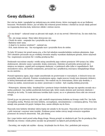 Geny dzikości Kor stał na skale i spoglądał na niekończącą się zieleń drzew, które rozciągały się aż po fiołkowy horyzont. Wschodziło słońce. Już od kilku dni wstawał przed świtem i chodził na szczyt skały patrzeć na wspaniałą złocistą kulę, kolorowe obłoki i zielone morze. - Co się dzieje? - usłyszał szept za plecami tak nagle, że aż się zerwał. Odwrócił się. Za nim stała Ina. - Nic, nie mogę zasnąć. Mam takie dziwaczne sny. - Chodź do mnie - szepnęła Ina i przytuliła się do niego. - Będziesz mieć syna. - A skąd ty to możesz wiedzieć? - zaśmiał się. - Ech, mam dziwne sny - Ina wyciągnęła ręce i przytuliła Kora do siebie. To było 30 tysięcy lat przed naszą erą, a Kor był młodym neandertalskim wodzem plemienia. Jego 350 członków poruszało się po wielkiej równinie między wysokimi skalistymi górami, które nazywali Tar, wapiennym szczytem Sir i wielką przełęczą Bor. Doskonale wyczulone zmysły i wielki mózg umożliwiły jego rodowi przeżycie 100 tysięcy lat, kilku zlodowaceń, okresów suszy i powodzi, braku zwierzyny. Zależnie od potrzeby przesuwali się z miejsca na miejsce, sypiali pod występami skalnymi, w jaskiniach albo tylko w zapadliskach. Byli stosunkowo niscy, ale bardzo umięśnieni, poruszali się z prędkością zwycięzcy olimpijskiego biegu na sto metrów. Poznali tajemnicę ognia. Jego ciepło umożliwiało im przetrwanie w warunkach, w których teraz nie przeżyłby żaden człowiek. Pomimo wynalezienia ognia, ciągle jeszcze trwały tam elementy dzikości, w której doświadczali miłości i nienawiści. Nie wadzili się ze zwierzętami, które żyły dookoła, z orłami na niebie, nosorożcami na ziemi i jesiotrami w wodzie - byli cząstką dzikiej przyrody. - Wstawajcie, idziemy dalej - krzyknął Kor i postacie leżące dookoła tlącego się ogniska zaczęły się z wolna podnosić. Ina szybko pozbierała kościane igły, które miała ułożone pod nawisem skalnym i włożyła je do torby. Ta mała skórzana torebka była czymś, na co w plemieniu Kora nikt nie zwracał uwagi. Ujrzeli ją po raz pierwszy obok Iny, gdy znaleźli nieprzytomną kobietę na brzegu rzeki Por. Ina była szczególną osobą. Wyższa niż inne kobiety, szczuplejsza, nieumięśniona i z mniejszą głową. Trzy lata minęły nim poznała ich język i kolejne dwa, zanim zbliżyła się do Kora. Nauczyła inne kobiety obrabiać skórę lepiej niż umiały to do tej pory. Nauczyła je też wytwarzać nici z jelit zwierząt i zszywać nimi torebki. Zrobione przez siebie rzeczy mogli wreszcie wygodnie przenosić do nowych obozowisk. Tak, jak dzisiaj. Kor i jego ludzie mieli przed sobą długą drogę. Muszą przejść ze skalistych gór Tar do przełęczy Bor. Zbliżała się wiosna i stada jeleni zaczęły się gromadzić na łąkach pod przełęczą Bor. - Zaczekaj, nie wejdę tak szybko - dysząc, krzyknęła Ina do Kora. Kor, podobnie jak wszyscy Geny dzikości 1 wodzowie przed nim, szedł na czele całej grupy i wyznaczał kierunek oraz tempo marszu. - Stop, przenocujemy tu, na skraju lasu - postanowił Kor. Wiedział, że znowu będzie przez trzy dni wysłuchiwać od mężczyzn, że Ina spowalnia całą grupę. Była słabsza od ich kobiet i od czasu do czasu były z tym problemy. - Nie pojmuję, jak twój ród mógł w ogóle egzystować - często mówił pół żartem, pół serio do Iny. - W naszym kraju nie ma lasów ani takich gór - zwykła odpowiadać Ina - po cóż by nam były wasze mięśnie? - Nie tylko mięśnie, mózg też macie mniejszy. - Przynajmniej nie żremy tyle, co wy. I było po dyskusji. Całą noc Kor przechadzał się tam i z powrotem i znów przed świtem stał na łące zwrócony na wschód, ku przełęczy Bor i czekał na słońce. - Znów te sny? - Ina objęła go od tyłu i wtuliła twarz w jego włosy. - Hm, nie wiem, o co chodzi - Kor nawet się nie odwrócił i wciąż spoglądał na pomarańczową kulę lepiej chodźmy obudzić naszych. Na trzeci dzień dotarli w okolice przełęczy Bor. Rozbili się pod górą Sir. Był to ulubiony szczyt Kora ze wszystkich między Tar a Bor. - Upiecz mi tego zająca - krzyknął do Iny - niedługo wrócę. - Dokąd idziesz? - W góry, na Sir. Przejdę się, może łatwiej będzie mi zasnąć - ostatnich słów Ina nie mogła już usłyszeć. Kor szybciej chodził niż mówił. Na górze Kor był na czas. Słońce nie zaszło jeszcze za skaliste szczyty Tar. Zwrócił się w kierunku Bor. Odgarnął czarne włosy i westchnął. - To piękne. I zaraz potem to ujrzał. Nad lasem koło rzeki Por, dym kroczył ku ciemniejącemu niebu. I słychać było jakiś głuchy huk. Kora zmroziło. Znał ten huk ze swych ostatnich snów. W tę noc Ina śniła o ich synu. Korowi nic się nie śniło. Nie spał. Bał się zasnąć. Rano zwołał dziesięć osób ze swojego plemienia. - Idziemy do Por. Kobiety i dzieci zostaną, jest tu co robić. - Uważaj na siebie - Ina nie zdawała sobie sprawy, że używa zwrotu typowego dla kobiet dziesiątki tysięcy lat przed nią i sto tysięcy lat po niej. Droga zajęła mężczyznom dziesięć godzin. Poruszać się w lesie pełnym bagien i mokradeł nie było łatwo, mimo że Kor i jego ludzie chodzili tą drogą już tysiące razy. Często spotykali tu Boga Lasu, jak nazywali wilka i Grubą Chmurę, jak nazywali niedźwiedzia. Tego typu spotkania kończyły się w zasadzie bez problemów. - Jeśli zachowasz spokój, będziesz miał spokój - zwykł mawiać Kor. Geny dzikości 2 - Jesteśmy już prawie na miejscu. Słyszycie ten hałas? Położyli się na ziemi i przez kilka minut czołgali w kierunku źródła hałasu. - Stójcie - Kor powoli rozchylił paprocie, które zasłaniały mu widok. Zdębiał. Przed oczami ukazała się polana, której tu przed miesiącem jeszcze nie było. Stały tam jakieś dziwne budynki zbudowane ze ściętych drzew. W drewnianych zagrodach kwiczały jakieś dziwaczne zwierzęta, podo