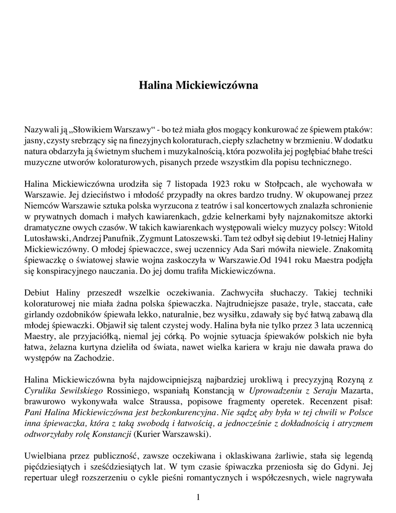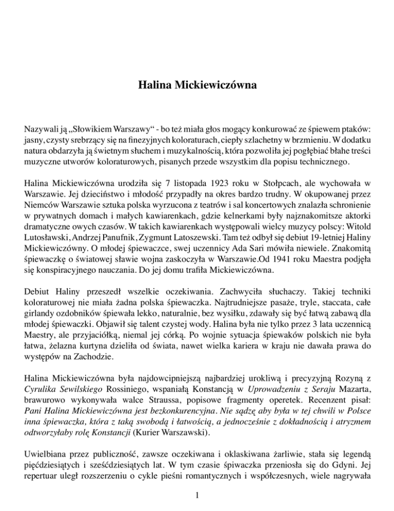 Halina Mickiewiczówna Nazywali ją „Słowikiem Warszawy“ - bo też miała głos mogący konkurować ze śpiewem ptaków: jasny, czysty srebrzący się na finezyjnych koloraturach, ciepły szlachetny w brzmieniu. W dodatku natura obdarzyła ją świetnym słuchem i muzykalnością, która pozwoliła jej pogłębiać błahe treści muzyczne utworów koloraturowych, pisanych przede wszystkim dla popisu technicznego. Halina Mickiewiczówna urodziła się 7 listopada 1923 roku w Stołpcach, ale wychowała w Warszawie. Jej dzieciństwo i młodość przypadły na okres bardzo trudny. W okupowanej przez Niemców Warszawie sztuka polska wyrzucona z teatrów i sal koncertowych znalazła schronienie w prywatnych domach i małych kawiarenkach, gdzie kelnerkami były najznakomitsze aktorki dramatyczne owych czasów. W takich kawiarenkach występowali wielcy muzycy polscy: Witold Lutosławski, Andrzej Panufnik, Zygmunt Latoszewski. Tam też odbył się debiut 19-letniej Haliny Mickiewiczówny. O młodej śpiewaczce, swej uczennicy Ada Sari mówiła niewiele. Znakomitą śpiewaczkę o światowej sławie wojna zaskoczyła w Warszawie.Od 1941 roku Maestra podjęła się konspiracyjnego nauczania. Do jej domu trafiła Mickiewiczówna. Debiut Haliny przeszedł wszelkie oczekiwania. Zachwyciła słuchaczy. Takiej techniki koloraturowej nie miała żadna polska śpiewaczka. Najtrudniejsze pasaże, tryle, staccata, całe girlandy ozdobników śpiewała lekko, naturalnie, bez wysiłku, zdawały się być łatwą zabawą dla młodej śpiewaczki. Objawił się talent czystej wody. Halina była nie tylko przez 3 lata uczennicą Maestry, ale przyjaciółką, niemal jej córką. Po wojnie sytuacja śpiewaków polskich nie była łatwa, żelazna kurtyna dzieliła od świata, nawet wielka kariera w kraju nie dawała prawa do występów na Zachodzie. Halina Mickiewiczówna była najdowcipniejszą najbardziej urokliwą i precyzyjną Rozyną z Cyrulika Sewilskiego Rossiniego, wspaniałą Konstancją w Uprowadzeniu z Seraju Mazarta, brawurowo wykonywała walce Straussa, popisowe fragmenty operetek. Recenzent pisał: Pani Halina Mickiewiczówna jest bezkonkurencyjna. Nie sądzę aby była w tej chwili w Polsce inna śpiewaczka, która z taką swobodą i łatwością, a jednocześnie z dokładnością i atryzmem odtworzyłaby rolę Konstancji (Kurier Warszawski). Uwielbiana przez publiczność, zawsze oczekiwana i oklaskiwana żarliwie, stała się legendą pięćdziesiątych i sześćdziesiątych lat. W tym czasie śpiwaczka przeniosła się do Gdyni. Jej repertuar uległ rozszerzeniu o cykle pieśni romantycznych i współczesnych, wiele nagrywała 1 2 dla radia, zwróciła się ku pracy pedagogicznej. Zaczęło się w Teatrze Muzycznym w Gdyni. Mickiewiczówna stała się nie tylko pedagogiem, ale i doradcą w dziedzinie obsady i doboru repertuaru. Później przyszła Średnia Szkoła Muzyczna, wreszcie Akademia Muzyczna. Po 25 latach pracy pedagogicznej Maestra podpisała 29 dyplomów, w tym 6 z wyróżnieniami . Jej absolwenci dosłużyli się operowych emerytur: Kazimierz Sergiel - bas Opery Bałtyckiej, tenor Ryszard Karczykowski, Jerzy Mahler - bas Opery Kameralnej w Warszawie. Obok nich najwybitniejsi to: Małgorzata Armanowska, Kira Boreczno i Jacek Labuda. Wszyscy wymienieni legitymują się znaczącym dorobkiem osiągnięć artystycznych, a także nagraniami płytowymi. Wśród wychowanków Mickiewiczówny jest wielu laureatów konkursow krajowych i międzynarodowych, występujących dziś w teatrach muzycznych Polski i zagranicy. (…) (1997 rok) Szczęście tak krótko trwa i rozwiewa się, jak mgła… ledwie z marzeń się wyłoni już zapomnieć trzeba o nim… Pełne nostalgicznej zadumy słowa, otulone ciepłą muzyką Tanga Isaaka Albeniza zamykają recitalową płytę CD Haliny Mickiewiczówny. Zawiera ona najwspanialsze zapisy fonograficzne dokonane przez Artystkę na przestrzeni lat 1952-1962. Nie bez powodu zatytuowano ją Maestrą koloratury - znajdujemy bowiem na niej zróżnicowany repertuar, pozwalający docenić niecodzienny kunszt wokalny, słodycz piękości głosu a nade wszystko prawdziwe mistrzostwo w operowaniu techniką koloraturową. Zamieszczone na końcu płyty wspomniane Tango Albeniza, pozostaje w swoistej opozycji do pozostałych utworów - wszystko się zatrzymuje, mamy czas na refleksję, jakieś wielopłaszczyznowe podsumowanie… To właśnie Tango rozbrzmiało w zabytkowych murach Bazyliki Katedralnej w Gdańsku Oliwie na zakończenie Mszy św. żałobnej za duszę Maestry, która odeszła cichutko, chociaż w cierpieniu… Tylko jej głos zabrzmiał na tej uroczystości, smutnej, ale jednocześnie przesyłającej jakieś promyki nadziei - szczególnie poprzez śpiew. Wszyscy obecni w katedrze, z trudnym do opisania wzruszeniem zatrzymali w sercach kochany głos i mądre słowa pieśni. Halina Mickiewiczówna odeszła 19 listopada 2001 roku, lecz wciąż żyje w pamięci tych, którzy mogli z Nią obcować. Do ostatnich dni pracowała ze swoimi studentami w nowym, imponującym rozmiarami gmachu Akademii Muzycznej w Gdańsku. Była bardzo szczęśkiwa i dumna z faktu, 3 4 że doczekała możliwości pracy we wspaniałych warunkach. Lecz…szczęście to trwało krótko… Gmach pozostał, niestety w dużej mierze pusty. Brakuje w nim Osoby, która wnosiła tak wiele radości, serdeczności, dowcipu, ciepłego słowa dla każdego, bez względu na to, jakie miejsce zajmował w strukturze pracowników uczelni. Brakuje jednego z najwspanialszych pedagogów przekazującego wiedzę i tradycję dawnego świata Wielkich Polskich Śpiewaków. Dzięki prezentowanym nagraniom zatrzymany został największy skarb, prawdziwy testament muzyczny Wspaniałej Artystki. Młode pokolenia śpiewaków będą miały szansę na wciąż żywe, jakże inspirujące i kształcące spotkanie z Haliną Mickiewiczówną - Maestrą koloratury. (2009 rok) 5