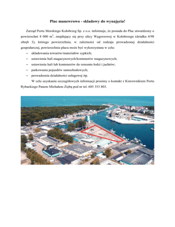 Plac manewrowo - składowy do wynajęcia! Zarząd Portu Morskiego Kołobrzeg Sp. z o.o. informuje, że posiada do Plac utwardzony o powierzchni 8 000 m2, znajdujący się przy ulicy Węgorzowej w Kołobrzegu (działka 4/98 obręb 3), którego powierzchnia, w zależności od rodzaju prowadzonej działalności gospodarczej, powierzchnia placu może być wykorzystana w celu: – składowania towarów/materiałów sypkich; – ustawienia hali magazynowych/kontenerów magazynowych; – ustawienia hali lub kontenerów do remontu łodzi i jachtów; – parkowania pojazdów samochodowych; – prowadzenia działalności usługowej itp. W celu uzyskania szczegółowych informacji prosimy o kontakt z Kierownikiem Portu Rybackiego Panem Michałem Ziębą pod nr tel. 605 353 803.