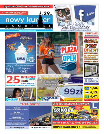 ZWIĘKSZONY NAKŁAD 10 000 + 5000 NA „GIEŁDZIE NA LOTNISKU W MOKREM” nr Wtorek 19 lipca 2016 r. Nakład 15 000 29 (49) ISSN 2450-5579 www.kurierzamojski.pl ▼REKLAMA ▲REKLAMA PLAŻA OPEN ▲REKLAMA 25 LAT fot: facebook.com/PlazaOpen INTERNET TELEWIZJA TELEFON zł ProgramTV ▼REKLAMA 600 028 620 Specjalna Promocja na 25-lecie ▲REKLAMA ▼REKLAMA ▲REKLAMA 2 www.kurierzamojski.pl Wydawca: Agnieszka Ciurysek Kurier Zamojski www.kurierzamojski.pl Adres do korespondencji: Nowy Kurier Zamojski skrytka pocztowa 206 22-400 Zamość e-mail: [email protected] JACEK I JANEK NA SZCZYCIE, PERŁA PLAŻÓWKI W PERLE RENESANSU Zamość to jedyny debiutant spośród miast goszczących siatkarzy zmagających się w Turnieju Plaża Open. Eliminacje Mistrzostw Polski odbędą się na Rynku Wielkim w dniach 22-24 lipca 2016 r. Zamość to czwarty po Gdańsku, Rybniku i Łodzi przystanek na tegorocznej mapie Plaży Open. W Zamościu zdecydowanie brakowało tego typu wydarzenia, a podobne projekty funkcjonują w Europie już od dawna. Dlatego też władze miasta postanowiły współorganizować jeden z turniejów Plaży Open, która jest nam dobrze znana z przekazów medialnych – mówi Marek Gajewski, Rzecznik Prasowy Prezydenta Miasta Zamość i dodaje: Nie brano pod uwagę żadnego innego miejsca, niż Rynek Wielki – ze względu na jego atrakcyjność i innowacyjność. N a f a n ów s i a t k ów k i p l a żowe j w województwie lubelsk im czek a turniej najwyższej rangi w Polsce, do tego w pięknej scenerii. Efektowne obrony i skuteczne ataki w sercu „Perły renesansu”, jak zwykło się nazywać Zamość, na pewno dodadzą uroku każdemu pojedynkowi, rozgrywanemu w ramach turnieju – czytamy na stronie organizatora. Wypada nam tylko potwierdzić, trzymać kciuki za pogodę i zaprosić na płytę Rynku Wielkiego oraz na fotorelację na https://www.facebook.com/ kurierzamojski/. Nowy Kurier Zamojski został patronem medialnym wydarzenia. Zapraszamy! ▲REKLAMA CZYLI O DWÓCH TAKICH, CO ZDOBYLI MONT BLANC Zamościanie - Jacek Podkościelny, nauczyciel geografii i Janek Cios, fotograf; obaj - podróżnicy, pasjonaci dalekich i bliskich wypraw, członkowie ZamojskiegoTowarzystwaTurystycznego, rankiem 9 lipca zdobyli Mont Blanc. Mont Blanc lub jak kto woli Monte Bianco to szczyt „obowiązkowy” dla każdego turysty wysokogórskiego w naszej części świata, nieodzowna pozycja na liście gór do „zaliczenia” każdego górskiego kolekcjonera. 9-dniowa wyprawa rozpoczęła się 5 lipca w Krakowie, skąd uczestnicy udali się do włoskiego Courmayeur u podnóża masywu Mont Blanc. Całą wyprawę stanowiły cztery dwuosobowe zespoły, które prowadzili przewodnicy z krakowskiego biura wypraw BluEmu. Jacek Podkościelny i Janek Cios zdobyli „Białą Górę” wraz z przewodniczką Aleksandrą Dzik - specjalizującą się w wyjazdach alpinistycznych w góry Europy i Azji, od Alp poprzez Kaukaz, Ałtaj, Pamir, Tien-Szan, Hindukusz aż po Himalaje i Karakorum. Wejście na Mont Blanc (4810,45 m n.p.m.) od strony włoskiej, tzw.„Drogą Papieską” jest to nie lada wyczyn, zwłaszcza biorąc pod uwagę znakomity czas: 6 godzin w górę i niecałe 5 godzin w dół. Nazwa trasy wzięła się stąd, że wytyczył ją w 1890 roku Achille Ratti, późniejszy Papież Pius XI. Już rok później w miejscu obecnego schroniska Gonella, powstał pierwszy schron. Tą trasą dokonuje się tylko 5% wejść na Mont Blanc i są to wejścia „ambitniejsze” niż te klasyczną drogą od strony Francji. Wyprawa ruszyła 7 lipca„szlakiem papieskim”. Trasa z pięknymi widokami wiodła do lodowca Miage i dalej do schroniska Gonella 3071m. n.p.m. Mało uczęszczana trasa dostarczała uczestnikom wyprawy bajkowych widoków i wymagała niesamowitego wysiłku. Powyżej schroniska Gonella uczestnicy założyli obóz na wysokości około 3800 m, skąd 9 lipca o godzinie 2.20 w nocy ruszyli na atak szczytowy. Szczyt przez schron Vallot został osiągnięty o godzinie 8.21 w sobotę 9 lipca. Jacek Podkościelny i Janek Cios bezpiecznie wrócili do Zamościa. O wprawie będą opowiadać w trakcie festiwalu podróżniczego „Eskapady Kresowe”, który odbędzie się jesienią w Zamościu (30.09 - 02.10.2016). cag. Biuro ogłoszeń i reklamy: Tomasz Krywionek Plac Stefanidesa 6 [email protected] tel.: 730 210 777 Za treść ogłoszeń i reklam Redakcja nie ponosi odpowiedzialności. Zastrzegamy sobie prawo do publikowania danych osobowych laureatów konkursów i krzyżówek. Druk: ZPR Media SA, ul. Jubilerska 10, 04-190 Warszawa ▲REKLAMA 3 www.kurierzamojski.pl ▲REKLAMA ▼REKLAMA W ZAMOŚCIU NIC SIĘ NIE DZIEJE? 19.07. - 26.07.2016 ●● 19.07.2016, godz. 13.00 - 19.00: „Mistrzowie w pasach” - Stacja Paliw Lotos, ul. Legionów 4, wstęp wolny, ●● 20.07.2016, godz. 19.00: Muza na Kwadracie - Rynek Wielki, wstęp wolny, ●● 21.07.2016, godz. 9.00: Msza dla uczestników Światowych Dni Młodzieży w Zamościu Katedra Zamojska, ●● 21.07.2016, godz. 11.00: Plaża Open, Turniej Otwarty - ogólnodostępny turniej amatorów - Rynek Wielki/OSIR, wstęp wolny, ●● 21.07.2016, godz. 16.00: Wernisaż wystawy Absolwenci„Plastyka” i Przyjaciele - Książnica Zamojska, ul. Kamienna 20, Galeria Exlibris, wstęp wolny, ●● 21.07.2016, godz. 17.00: Wystawa Poplenerowa Zamojskiej Grupy Fotograficznej, Zamojski Dom Kultury, ul. Partyzantów 13, wstęp wolny, ●● 21.07.2016, godz. 19.00; Muza na Kwadracie Namysłowiacy koncert„Bonum Voces”- Rynek Wielki, wstęp wolny, ●● 22.07.2016, godz. 10.00-18.00: Plaża Open, kwalifikacje do turnieju głównego - Mistrzostwa Polski Kobiet i Mężczyzn - Rynek Wielki/OSIR, wstęp wolny, ●● 22.07.2016, godz. 11.00: Dzień kultury i sportu ŚDM, otwarcie zawodów sportowych - stadion OSIR, wstęp wolny, ●● 22.07.2016, godz. 13.00: Dzień kultury i sportu ŚDM, bieg główny - OSIR, wstęp wolny, ●● 22.07.2016, godz. 18.30: Legenda Stołu Szwed
