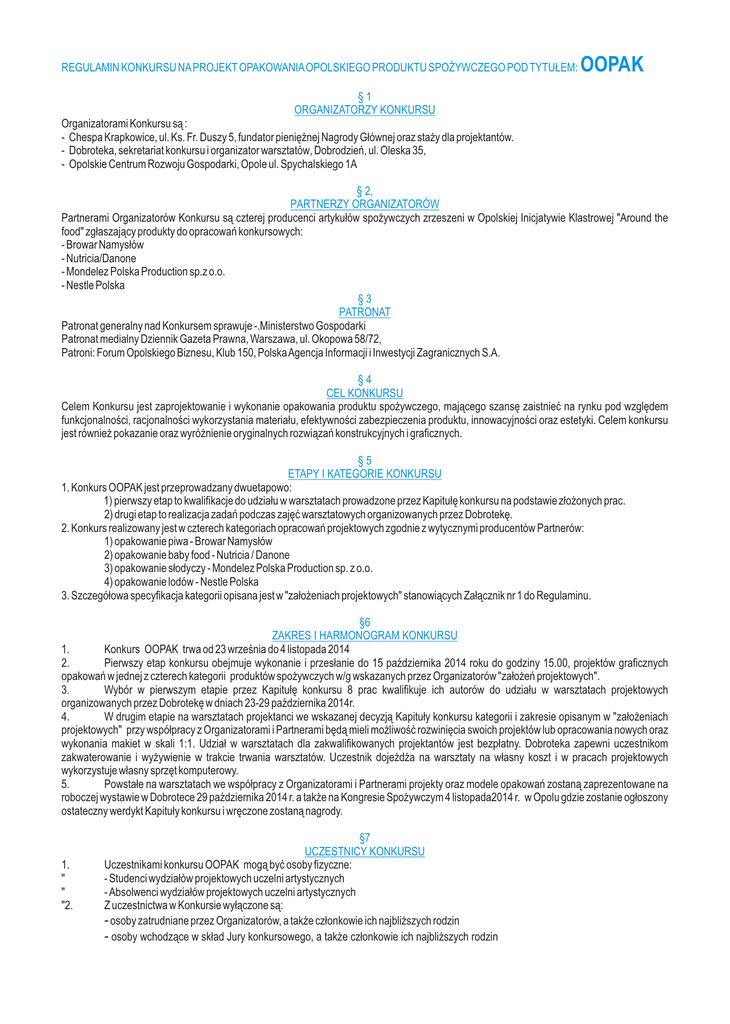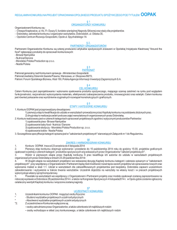 REGULAMIN KONKURSU NA PROJEKT OPAKOWANIA OPOLSKIEGO PRODUKTU SPOŻYWCZEGO POD TYTUŁEM: OOPAK §1 ORGANIZATORZY KONKURSU Organizatorami Konkursu są : - Chespa Krapkowice, ul. Ks. Fr. Duszy 5, fundator pieniężnej Nagrody Głównej oraz staży dla projektantów. - Dobroteka, sekretariat konkursu i organizator warsztatów, Dobrodzień, ul. Oleska 35, - Opolskie Centrum Rozwoju Gospodarki, Opole ul. Spychalskiego 1A § 2, PARTNERZY ORGANIZATORÓW Partnerami Organizatorów Konkursu są czterej producenci artykułów spożywczych zrzeszeni w Opolskiej Inicjatywie Klastrowej "Around the food" zgłaszający produkty do opracowań konkursowych: - Browar Namysłów - Nutricia/Danone - Mondelez Polska Production sp.z o.o. - Nestle Polska §3 PATRONAT Patronat generalny nad Konkursem sprawuje -.Ministerstwo Gospodarki Patronat medialny Dziennik Gazeta Prawna, Warszawa, ul. Okopowa 58/72, Patroni: Forum Opolskiego Biznesu, Klub 150, Polska Agencja Informacji i Inwestycji Zagranicznych S.A. §4 CEL KONKURSU Celem Konkursu jest zaprojektowanie i wykonanie opakowania produktu spożywczego, mającego szansę zaistnieć na rynku pod względem funkcjonalności, racjonalności wykorzystania materiału, efektywności zabezpieczenia produktu, innowacyjności oraz estetyki. Celem konkursu jest również pokazanie oraz wyróżnienie oryginalnych rozwiązań konstrukcyjnych i graficznych. §5 ETAPY I KATEGORIE KONKURSU 1. Konkurs OOPAK jest przeprowadzany dwuetapowo: 1) pierwszy etap to kwalifikacje do udziału w warsztatach prowadzone przez Kapitułę konkursu na podstawie złożonych prac. 2) drugi etap to realizacja zadań podczas zajęć warsztatowych organizowanych przez Dobrotekę. 2. Konkurs realizowany jest w czterech kategoriach opracowań projektowych zgodnie z wytycznymi producentów Partnerów: 1) opakowanie piwa - Browar Namysłów 2) opakowanie baby food - Nutricia / Danone 3) opakowanie słodyczy - Mondelez Polska Production sp. z o.o. 4) opakowanie lodów - Nestle Polska 3. Szczegółowa specyfikacja kategorii opisana jest w "założeniach projektowych" stanowiących Załącznik nr 1 do Regulaminu. §6 ZAKRES I HARMONOGRAM KONKURSU 1. Konkurs OOPAK trwa od 23 września do 4 listopada 2014 2. Pierwszy etap konkursu obejmuje wykonanie i przesłanie do 15 października 2014 roku do godziny 15.00, projektów graficznych opakowań w jednej z czterech kategorii produktów spożywczych w/g wskazanych przez Organizatorów "założeń projektowych". 3. Wybór w pierwszym etapie przez Kapitułę konkursu 8 prac kwalifikuje ich autorów do udziału w warsztatach projektowych organizowanych przez Dobrotekę w dniach 23-29 października 2014r. 4. W drugim etapie na warsztatach projektanci we wskazanej decyzją Kapituły konkursu kategorii i zakresie opisanym w "założeniach projektowych" przy współpracy z Organizatorami i Partnerami będą mieli możliwość rozwinięcia swoich projektów lub opracowania nowych oraz wykonania makiet w skali 1:1. Udział w warsztatach dla zakwalifikowanych projektantów jest bezpłatny. Dobroteka zapewni uczestnikom zakwaterowanie i wyżywienie w trakcie trwania warsztatów. Uczestnik dojeżdża na warsztaty na własny koszt i w pracach projektowych wykorzystuje własny sprzęt komputerowy. 5. Powstałe na warsztatach we współpracy z Organizatorami i Partnerami projekty oraz modele opakowań zostaną zaprezentowane na roboczej wystawie w Dobrotece 29 października 2014 r. a także na Kongresie Spożywczym 4 listopada2014 r. w Opolu gdzie zostanie ogłoszony ostateczny werdykt Kapituły konkursu i wręczone zostaną nagrody. 1. " " "2. §7 UCZESTNICY KONKURSU Uczestnikami konkursu OOPAK mogą być osoby fizyczne: - Studenci wydziałów projektowych uczelni artystycznych - Absolwenci wydziałów projektowych uczelni artystycznych Z uczestnictwa w Konkursie wyłączone są: - osoby zatrudniane przez Organizatorów, a także członkowie ich najbliższych rodzin - osoby wchodzące w skład Jury konkursowego, a także członkowie ich najbliższych rodzin §8 WARUNKI UDZIAŁU W KONKURSIE 1. Warunkiem przystąpienia do Konkursu jest przedstawienie (w terminie najpóźniej do 15 października 2014 roku) dowolnej ilości projektów graficznych opakowań, przygotowanych zgodnie z "założeniami projektowymi", stanowiącymi Załącznik nr 1 do Regulaminu oraz formularza zgłoszeniowego (patrz §9). 2. Projekt musi być wynikiem indywidualnej pracy twórczej osoby zgłaszającej oraz musi być wolny od wad prawnych, w tym nie może naruszać praw osób trzecich. 3. Udział w Konkursie jest bezpłatny. §9 WNIOSEK KONKURSOWY 1. Wniosek konkursowy obejmuje: Formularz zgłoszeniowy (stanowiący Załącznik nr 2 do Regulaminu) należy przesłać do na adres: [email protected]. Każdy zgłaszany do konkursu projekt powinien mieć własne godło i formularz zgłoszeniowy. Projekt sporządzony w formie elektronicznej, zawierający opracowanie graficzne i wizualizację przestrzennego rozwiązania opakowania zapisane jako CMYK w formacie JPG lub PDF w rozdzielczości 150 dpi oraz opis projektu. W sumie jeden projekt powinien być zapisany na minimum 2 a maximum 4 planszch w formacie A3. Praca powinna być opatrzona, godłem uniemożliwiającym identyfikację autora i przesłana pocztą elektroniczną na adres: [email protected]. 2. Kompletny wniosek konkursowy można także złożyć osobiście w sekretariacie konkursu lub wysłać na adres: 46-380 Dobrodzień, ul. Oleska 35 na nazwisko Jan Cegiełka. 3. W opakowaniu zawierającym wniosek konkursowy należy umieścić kopertę zawierającą formularz zgłoszeniowy, opatrzoną wyłącznie Godłem oraz dopiskiem konkurs OOPAK. 4. Godło powinno składać się z ciągu liter i cyfr, uniemożliwiających identyfikację Uczestnika konkursu. § 10 TERMIN NADSYŁANIA ZGŁOSZEŃ 1. Termin przyjmowania i nadsyłania kompletnych prac i formularzy zgłoszeniowych obowiązuje do dnia 15 października 2014 roku do godziny 15.00. 2. Za datę złożenia p