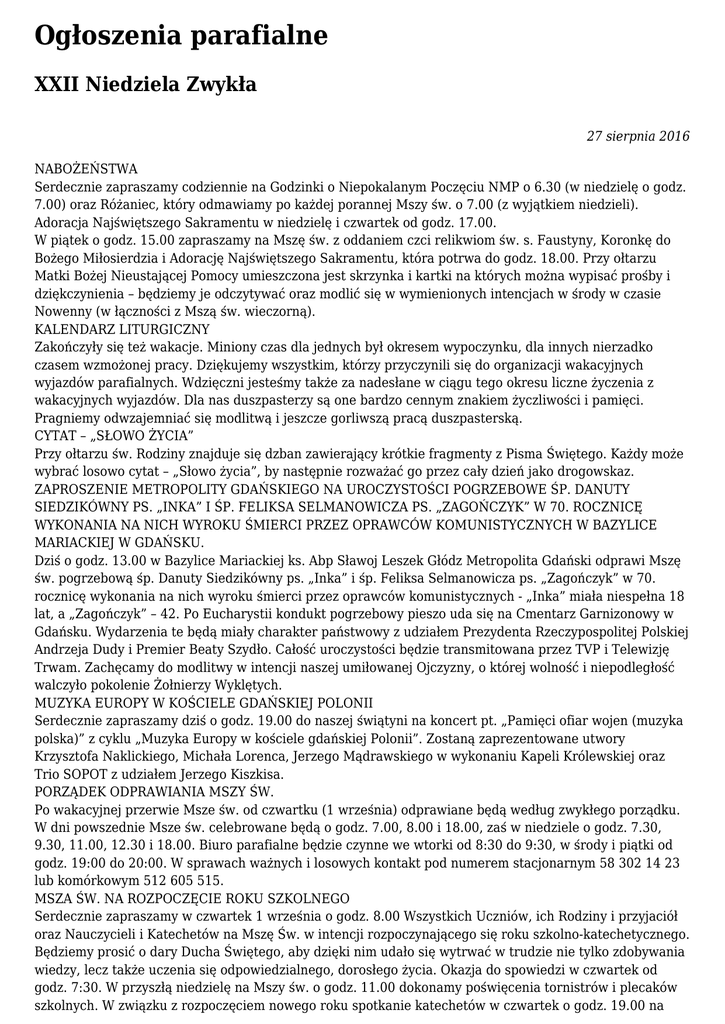 Ogłoszenia parafialne XXII Niedziela Zwykła 27 sierpnia 2016 NABOŻEŃSTWA Serdecznie zapraszamy codziennie na Godzinki o Niepokalanym Poczęciu NMP o 6.30 (w niedzielę o godz. 7.00) oraz Różaniec, który odmawiamy po każdej porannej Mszy św. o 7.00 (z wyjątkiem niedzieli). Adoracja Najświętszego Sakramentu w niedzielę i czwartek od godz. 17.00. W piątek o godz. 15.00 zapraszamy na Mszę św. z oddaniem czci relikwiom św. s. Faustyny, Koronkę do Bożego Miłosierdzia i Adorację Najświętszego Sakramentu, która potrwa do godz. 18.00. Przy ołtarzu Matki Bożej Nieustającej Pomocy umieszczona jest skrzynka i kartki na których można wypisać prośby i dziękczynienia – będziemy je odczytywać oraz modlić się w wymienionych intencjach w środy w czasie Nowenny (w łączności z Mszą św. wieczorną). KALENDARZ LITURGICZNY Zakończyły się też wakacje. Miniony czas dla jednych był okresem wypoczynku, dla innych nierzadko czasem wzmożonej pracy. Dziękujemy wszystkim, którzy przyczynili się do organizacji wakacyjnych wyjazdów parafialnych. Wdzięczni jesteśmy także za nadesłane w ciągu tego okresu liczne życzenia z wakacyjnych wyjazdów. Dla nas duszpasterzy są one bardzo cennym znakiem życzliwości i pamięci. Pragniemy odwzajemniać się modlitwą i jeszcze gorliwszą pracą duszpasterską. CYTAT – „SŁOWO ŻYCIA” Przy ołtarzu św. Rodziny znajduje się dzban zawierający krótkie fragmenty z Pisma Świętego. Każdy może wybrać losowo cytat – „Słowo życia”, by następnie rozważać go przez cały dzień jako drogowskaz. ZAPROSZENIE METROPOLITY GDAŃSKIEGO NA UROCZYSTOŚCI POGRZEBOWE ŚP. DANUTY SIEDZIKÓWNY PS. „INKA” I ŚP. FELIKSA SELMANOWICZA PS. „ZAGOŃCZYK” W 70. ROCZNICĘ WYKONANIA NA NICH WYROKU ŚMIERCI PRZEZ OPRAWCÓW KOMUNISTYCZNYCH W BAZYLICE MARIACKIEJ W GDAŃSKU. Dziś o godz. 13.00 w Bazylice Mariackiej ks. Abp Sławoj Leszek Głódz Metropolita Gdański odprawi Mszę św. pogrzebową śp. Danuty Siedzikówny ps. „Inka” i śp. Feliksa Selmanowicza ps. „Zagończyk” w 70. rocznicę wykonania na nich wyroku śmierci przez oprawców komunistycznych - „Inka” miała niespełna 18 lat, a „Zagończyk” – 42. Po Eucharystii kondukt pogrzebowy pieszo uda się na Cmentarz Garnizonowy w Gdańsku. Wydarzenia te będą miały charakter państwowy z udziałem Prezydenta Rzeczypospolitej Polskiej Andrzeja Dudy i Premier Beaty Szydło. Całość uroczystości będzie transmitowana przez TVP i Telewizję Trwam. Zachęcamy do modlitwy w intencji naszej umiłowanej Ojczyzny, o której wolność i niepodległość walczyło pokolenie Żołnierzy Wyklętych. MUZYKA EUROPY W KOŚCIELE GDAŃSKIEJ POLONII Serdecznie zapraszamy dziś o godz. 19.00 do naszej świątyni na koncert pt. „Pamięci ofiar wojen (muzyka polska)” z cyklu „Muzyka Europy w kościele gdańskiej Polonii”. Zostaną zaprezentowane utwory Krzysztofa Naklickiego, Michała Lorenca, Jerzego Mądrawskiego w wykonaniu Kapeli Królewskiej oraz Trio SOPOT z udziałem Jerzego Kiszkisa. PORZĄDEK ODPRAWIANIA MSZY ŚW. Po wakacyjnej przerwie Msze św. od czwartku (1 września) odprawiane będą według zwykłego porządku. W dni powszednie Msze św. celebrowane będą o godz. 7.00, 8.00 i 18.00, zaś w niedziele o godz. 7.30, 9.30, 11.00, 12.30 i 18.00. Biuro parafialne będzie czynne we wtorki od 8:30 do 9:30, w środy i piątki od godz. 19:00 do 20:00. W sprawach ważnych i losowych kontakt pod numerem stacjonarnym 58 302 14 23 lub komórkowym 512 605 515. MSZA ŚW. NA ROZPOCZĘCIE ROKU SZKOLNEGO Serdecznie zapraszamy w czwartek 1 września o godz. 8.00 Wszystkich Uczniów, ich Rodziny i przyjaciół oraz Nauczycieli i Katechetów na Mszę Św. w intencji rozpoczynającego się roku szkolno-katechetycznego. Będziemy prosić o dary Ducha Świętego, aby dzięki nim udało się wytrwać w trudzie nie tylko zdobywania wiedzy, lecz także uczenia się odpowiedzialnego, dorosłego życia. Okazja do spowiedzi w czwartek od godz. 7:30. W przyszłą niedzielę na Mszy św. o godz. 11.00 dokonamy poświęcenia tornistrów i plecaków szkolnych. W związku z rozpoczęciem nowego roku spotkanie katechetów w czwartek o godz. 19.00 na plebanii. Z kolei obchody 77. rocznicy wybuchu II Wojny Światowej, rozpoczną się 1 września o godz. 4.45 uroczystym apelem, modlitwą i złożeniem wieńców u stóp Pomnika Obrońców Wybrzeża na Westerplatte. O godz. 12.00 odprawiona zostanie przy Pomniku Obrońców Poczty Polskiej w Gdańsku Msza św. w intencji bohaterów Kampanii Wrześniowej. MSZA ŚW. Z OKAZJI 36 ROCZNICY ZAKOŃCZENIA STRAJKU W STOCZNI GDAŃSKIEJ I PODPISANIA UMÓW SIERPNIOWYCH W środę 31 sierpnia br. o godz. 17.00, w Bazylice św. Brygidy w Gdańsku sprawowana będzie uroczysta Msza św. z okazji 36 rocznicy zakończenia strajku w Stoczni Gdańskiej i podpisania Umów Sierpniowych, której przewodniczyć będzie Ks. Arcybiskup Sławoj Leszek Głódź. We Mszy św. uczestniczył będzie Prezydent RP Andrzej Duda. Serdecznie zapraszamy do udziału wszystkich, którym drogi i bliski jest etos „Solidarności”. DNI EUCHARYSTYCZNE W tym tygodniu przypadają dni eucharystyczne: W pierwszy czwartek miesiąca modlić się będziemy za kapłanów i o nowe powołania kapłańskie i zakonne szczególnie z naszej parafii. W pierwszy piątek miesiąca wynagradzać będziemy Boskiemu Sercu za grzechy nasze i całego świata. Okazja do spowiedzi św. będzie od godz. 17.00. W godzinach przedpołudniowych ks. Błażej odwiedzi chorych. W pierwszą sobotę miesiąca uczcimy Niepokalane Serce Maryi odmawiając różaniec (zmiana tajemnic Żywego Różańca nastąpi po Mszy św. o godz. 7.00). W godzinach przedpołudniowych ks. Grzegorz i ks. Proboszcz odwiedzą chorych. Serdecznie zapraszamy wszystkie Małżeństwa, a szczególnie te, które we wrześniu obchodzą swoją rocznicę ślubu w sobotę o godz. 18.00 na Mszę świętą połączoną z odnowieniem przyrzecze