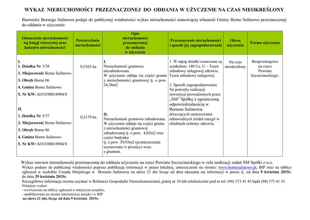 WYKAZ NIERUCHOMOŚCI PRZEZNACZONEJ DO ODDANIA W UŻYCZENIE NA CZAS NIEOKREŚLONY Burmistrz Bornego Sulinowa podaje do publicznej wiadomości wykaz nieruchomości stanowiącej własność Gminy Borne Sulinowo przeznaczonej do oddania w użyczenie: Oznaczenie nieruchomości wg księgi wieczystej oraz katastru nieruchomości I. 1. Działka Nr 3/38 Opis nieruchomości przeznaczonej do oddania w użyczenie Powierzchnia nieruchomości 0,5363 ha 2. Miejscowość Borne Sulinowo 3. Obręb Borne 06 I. Nieruchomość gruntowa niezabudowana. W użyczenie oddaje się części gruntu z nieruchomości gruntowej tj. o pow. 24,38m2 Przeznaczenie nieruchomości i sposób jej zagospodarowania 1. W mpzp działki oznaczone są Na czas symbolem: 140 Uz, U – Teren nieokreślony zabudowy usługowej zdrowia. Teren zabudowy usługowej. 5. Nr KW: KO1I/00018904/8 2. Sposób zagospodarowania: Na potrzeby realizacji inwestycji prowadzonych przez II. „SM” Spółkę z ograniczoną odpowiedzialnością w Bornem Sulinowie 4. Gmina Borne Sulinowo 1. Działka Nr 3/37 2. Miejscowość Borne Sulinowo 3. Obręb Borne 06 4. Gmina Borne Sulinowo 5. Nr KW: KO1I/00018904/8 0,2179 ha Okres użyczenia Forma użyczenia Bezprzetargowo na rzecz Powiatu Szczecineckiego. dotyczących zastosowania II. Nieruchomość gruntowa zabudowana. odnawialnych źródeł energii w W użyczenie oddaje się części gruntu obiektach ochrony zdrowia. z nieruchomości gruntowej zabudowanej tj. o pow. 4,62m2 oraz części budynku tj. o pow. 39,93m2 (pomieszczenia usytuowane w piwnicy) wraz z gruntem. Wykaz zawiera nieruchomość przeznaczoną do oddania użyczenie na rzecz Powiatu Szczecineckiego w celu realizacji zadań SM Spółki z o.o. Wykaz podano do publicznej wiadomości poprzez publikację informacji w prasie lokalnej, umieszczenie na stronie: www.bornesulinowo.pl, BIP oraz na tablicy ogłoszeń w siedzibie Urzędu Miejskiego w Bornem Sulinowie na okres 21 dni licząc od dnia ukazania się informacji w prasie tj. od dnia 9 kwietnia 2015r. do dnia 29 kwietnia 2015r. Szczegółowe informacje można uzyskać w Referacie Gospodarki Nieruchomościami, pokój nr 10 lub telefonicznie pod nr tel: (94) 373 41 45 bądź (94) 373 41 51. Niniejszy wykaz: - wywieszono na tablicy ogłoszeń w tutejszym urzędzie, - opublikowano na stronie internetowej urzędu i w BIP na okres 21 dni, licząc od dnia 9 kwietnia 2015r.
