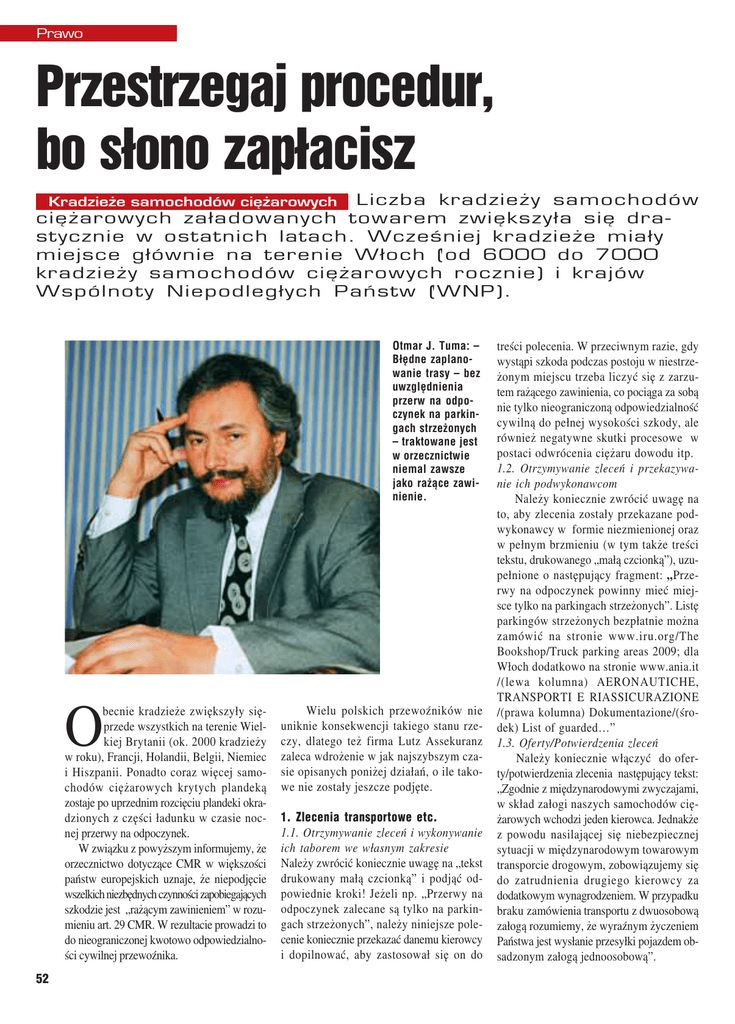 Prawo Przestrzegaj procedur, bo słono zapłacisz Kradzieże samochodów ciężarowych Liczba kradzieży samochodów ciężarowych załadowanych towarem zwiększyła się dra− stycznie w ostatnich latach. Wcześniej kradzieże miały miejsce głównie na terenie Włoch (od 6000 do 7000 kradzieży samochodów ciężarowych rocznie) i krajów Wspólnoty Niepodległych Państw (WNP). Otmar J. Tuma: – Błędne zaplano− wanie trasy – bez uwzględnienia przerw na odpo− czynek na parkin− gach strzeżonych – traktowane jest w orzecznictwie niemal zawsze jako rażące zawi− nienie. O becnie kradzieże zwiększyły się− przede wszystkich na terenie Wiel− kiej Brytanii (ok. 2000 kradzieży w roku), Francji, Holandii, Belgii, Niemiec i Hiszpanii. Ponadto coraz więcej samo− chodów ciężarowych krytych plandeką zostaje po uprzednim rozcięciu plandeki okra− dzionych z części ładunku w czasie noc− nej przerwy na odpoczynek. W związku z powyższym informujemy, że orzecznictwo dotyczące CMR w większości państw europejskich uznaje, że niepodjęcie wszelkich niezbędnych czynności zapobiegających szkodzie jest „rażącym zawinieniem” w rozu− mieniu art. 29 CMR. W rezultacie prowadzi to do nieograniczonej kwotowo odpowiedzialno− ści cywilnej przewoźnika. 52 Wielu polskich przewoźników nie uniknie konsekwencji takiego stanu rze− czy, dlatego też firma Lutz Assekuranz zaleca wdrożenie w jak najszybszym cza− sie opisanych poniżej działań, o ile tako− we nie zostały jeszcze podjęte. 1. Zlecenia transportowe etc. 1.1. Otrzymywanie zleceń i wykonywanie ich taborem we własnym zakresie Należy zwrócić koniecznie uwagę na „tekst drukowany małą czcionką” i podjąć od− powiednie kroki! Jeżeli np. „Przerwy na odpoczynek zalecane są tylko na parkin− gach strzeżonych”, należy niniejsze pole− cenie koniecznie przekazać danemu kierowcy i dopilnować, aby zastosował się on do treści polecenia. W przeciwnym razie, gdy wystąpi szkoda podczas postoju w niestrze− żonym miejscu trzeba liczyć się z zarzu− tem rażącego zawinienia, co pociąga za sobą nie tylko nieograniczoną odpowiedzialność cywilną do pełnej wysokości szkody, ale również negatywne skutki procesowe w postaci odwrócenia ciężaru dowodu itp. 1.2. Otrzymywanie zleceń i przekazywa− nie ich podwykonawcom Należy koniecznie zwrócić uwagę na to, aby zlecenia zostały przekazane pod− wykonawcy w formie niezmienionej oraz w pełnym brzmieniu (w tym także treści tekstu, drukowanego „małą czcionką”), uzu− pełnione o następujący fragment: „Prze− rwy na odpoczynek powinny mieć miej− sce tylko na parkingach strzeżonych”. Listę parkingów strzeżonych bezpłatnie można zamówić na stronie www.iru.org/The Bookshop/Truck parking areas 2009; dla Włoch dodatkowo na stronie www.ania.it /(lewa kolumna) AERONAUTICHE, TRANSPORTI E RIASSICURAZIONE /(prawa kolumna) Dokumentazione/(śro− dek) List of guarded…” 1.3. Oferty/Potwierdzenia zleceń Należy koniecznie włączyć do ofer− ty/potwierdzenia zlecenia następujący tekst: „Zgodnie z międzynarodowymi zwyczajami, w skład załogi naszych samochodów cię− żarowych wchodzi jeden kierowca. Jednakże z powodu nasilającej się niebezpiecznej sytuacji w międzynarodowym towarowym transporcie drogowym, zobowiązujemy się do zatrudnienia drugiego kierowcy za dodatkowym wynagrodzeniem. W przypadku braku zamówienia transportu z dwuosobową załogą rozumiemy, że wyraźnym życzeniem Państwa jest wysłanie przesyłki pojazdem ob− sadzonym załogą jednoosobową”. 2. Parkingi strzeżone Trasy przejazdu należy zaplanować w taki sposób, aby przerwy na odpoczynek miały miejsce na parkingach strzeżonych oraz dopilnować, aby Państwa dysponenci udzielili kierowcom (a w przypadku wy− konywania transportu przez podwykonaw− ców – podwykonawcom) wskazówek i poleceń w formie pisemnej. Poniżej zamieszczono powtórnie dwie strony internetowe, na których zostały wy− szczególnione parkingi strzeżone. Zaleca się wydrukowanie lub zamówienie niniej− szych list (dla Włoch „Pocket edition”) i wydanie ich kierowcom za pisemnym potwierdzeniem. www.iru.org / The Bookshop / Track parking areas in Europe; www.ania.it / (lewa kolumna) AERONAU− TICHE, TRANSPORTI E RIASSICURA− ZIONE / (prawa kolumna) Dokumentatione /(środek) List of guarded …” Lutz Assekuranz informuje, iż błęd− ne zaplanowanie trasy – bez uwzględnie− nia przerw na odpoczynek na parkingach strzeżonych – traktowane jest w orzecz− nictwie niemal zawsze jako rażące zawi− nienie. 3. Zabezpieczenia przed kradzieżą samo− chodów ciężarowych Wartość jednego samochodu ciężaro− wego wraz z ładunkiem jest nieproporcjo− nalnie duża w porównaniu z kosztami za− instalowania zabezpieczenia przed kradzieżą. W przypadku, gdy niniejsze zabezpiecze− nie nie przyczyni się do zapobieżenia kra− dzieży, należy wyjść z założenia, że dzię− ki temu udało się uniknąć zakwalifikowania działania przewoźnika jako „rażącego za− winienia”. Niektórzy producenci samocho− dów ciężarowych oferują fabryczne zabez− pieczenia przed kradzieżą. Dodatkowe in− formacje na temat zabezpieczeń przed kra− dzieżą można uzyskać w internecie. Zain− stalowanie zabezpieczeń przed kradzieżą i korzystanie z nich jest pomocne w pro− cesie likwidacji szkody. Świadczy to o dbałości ubezpieczonego, co jest dobrze widziane przez ubezpieczycieli. 4. Zamknięta skrzynia ładunkowa O ile to możliwe, należy użyć – szczegól− nie w przypadku podróży do wymienio− nych na wstępie krajów – samochody cię− żarowe ze skrzynią ładunkową zamkniętą i dopilnować, aby były one zabezpieczo− ne masywnymi zamkami bezpieczeństwa. Na pewno można w ten sposób uniemoż− liwić nasilające się kradzieże części ładunku, dokonywane poprz
