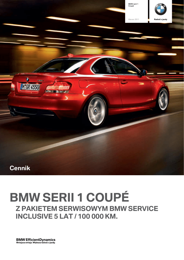 BMW serii 1 Coupé Marzec 2011 Radość z jazdy Cennik BMW SERII 1 COUPÉ Z PAKIETEM SERWISOWYM BMW SERVICE INCLUSIVE 5 LAT / 100 000 KM. Ceny BMW serii 1 Coupé Silnik benzynowy Układ / cylindry Pojemność cm3 Moc kW (KM) Zużycie paliwa wg normy ECE l/100 km Emisja CO2 g/km Cena netto Cena brutto w PLN* (bez VAT) w PLN cykl miejski cykl pozamiejski cykl mieszany 120i R/4 1995 125 (170) 8,6 / 5,4 / 6,6 153 100 407 123 500 125i R/6 2996 160 (218) 11,9 / 6,0 / 8,2 190 127 154 156 400 135i R/6 2979 225 (306) 12,1 / 6,4 / 8,5 197 155 447 191 200 Silnik wysokoprężny Układ / cylindry Pojemność cm3 Moc kW (KM) Zużycie paliwa wg normy ECE l/100 km Emisja CO2 g/km Cena netto Cena brutto w PLN* 118d R/4 1995 105 (143) 5,4 / 4,0 / 4,5 119 98 780 121 500 120d R/4 1995 130 (177) 5,9 / 4,1 / 4,7 125 108 049 132 900 123d R/4 1995 150 (204) 6,4 / 4,4 / 5,1 135 117 317 144 300 (bez VAT) w PLN cykl miejski cykl pozamiejski cykl mieszany *Powyższe ceny zawierają pakiet serwisowy BMW Service Inclusive 5 lat / 100 000 km pokrywający koszty serwisowania samochodu oraz przeglądów, wliczając w to oryginalne części BMW, olej oraz robociznę. Pakiet obejmuje następujące czynności: wymiana oleju (bez uzupełniania), serwis/wymiana filtra powietrza, filtra przeciwpyłkowego, świec zapłonowych, płynu hamulcowego, konrola pojazdu i przegląd standardowy zgodnie z książką serwisową. Więciej informacji na temat BMW Service Inclusive oraz dodatkowych pakietów znajdą Państwo u Dealera BMW. W przypadku rezygnacji z pakietu cena samochodu będzie niższa o 1000 PLN brutto dla modeli z silnikiem 4-cylindrowym i 1300 PLN brutto dla modeli z silnikiem 6-cylindrowym. Podane ceny są zalecanymi cenami detalicznymi, zawierającymi podatek VAT oraz podatek akcyzowy. Zalecane ceny detaliczne dotyczące wyposażenia dodatkowego są ważne jedynie, jeśli wyposażenie to zostanie zamówione jednocześnie z danym modelem pojazdu. Podane ceny samochodów obowiązują dla modeli w kolorach podstawowych, a lakiery metalizowane są dostępne za dopłatą. Powyższe ceny mogą ulec zmianom bez uprzedzenia w zależności od zmiany cen wprowadzonych przez producenta, jak również zmian w podatkach, opłatach i przepisach celnych. Przedstawione informacje są aktualne w chwili ukazania się niniejszej publikacji. BMW Polska zastrzega sobie prawo do zmian w ofercie w każdej chwili i to zarówno w zakresie oferowanych modeli jak i ich budowy oraz wyposażenia. Niniejszy cennik nie stanowi oferty w rozumieniu prawa i publikowany jest jedynie dla celów informacyjnych bez żadnej odpowiedzialności. Informacji dotyczących dostępności prezentowanych modeli i wyposażenia, jak również aktualnych cen detalicznych prosimy zasięgnąć u Dealera BMW. Data wydania cennika: 31.01.2011. Wyjaśnienie oznaczeń: l wyposażenie standardowe l wyposażenie dodatkowe za dopłatą (000) kod opcji 2 Koła Opony z funkcją jazdy awaryjnej Runflat z czujnikiem uszkodzenia opony Obręcze kół ze stopu lekkiego Double Spoke 222, 16 cali Obręcze kół ze stopu lekkiego V Spoke 141, 17 cali Obręcze kół ze stopu lekkiego V Spoke 229, 16 cali Obręcze kół ze stopu lekkiego Star Spoke 256, 17 cali Obręcze kół ze stopu lekkiego Star Spoke 264 z ogumieniem mieszanym, 18 cali Śruby zabezpieczające przed kradzieżą Tapicerka i stylistyka wnętrza Tkanina Network Tkanina Elektra Listwy ozdobne aluminium ze szlifowanymi akcentami Listwy ozdobne satynowo srebrne mat Czarne progi drzwiowe z chromowaną wstawką i emblematem BMW Czarne progi drzwiowe z chromowanym emblematem BMW ze wstawką na wysoki połysk Drążek zmiany biegów i hamulec ręczny obszyty skórą ekologiczną 118d 120d 123d Lakier i stylistyka zewnętrzna Lakier niemetalizowany Elementy zewnętrzne w kolorze karoserii Wykończenia zewnętrzne Chrome Line Exterior Atrapa chłodnicy z czarnym grillem Atrapa chłodnicy z grillem chromowana Zderzaki w kolorze karoserii Elementy aerodynamiczne M w kolorze nadwozia (niedostępne w połączeniu ze światłami przeciwmgielnymi) Lusterka zewnętrzne w kolorze karoserii 135i Bezpieczeństwo Poduszki powietrzne dla kierowcy i pasażera Antilock Braking System (ABS) including Brake Assist and Cornering Brake Control Czujnik zderzenia, automatycznie odryglowuje drzwi w celu ułatwienia ewakuacji z pojazdu lub zapewnienia dostępu pomocy z zewnątrz Dwutonowy klakson Układ dynamicznej kontroli stabilności (DSC) z systemem automatycznej kontroli trakcji (ASC+T) Układ dynamicznej kontroli stabilności (DSC) o rozszerzonym zakresie z asystentem ruszania i hamowania oraz osuszaniem hamulców Tryb kontroli trakcji (DTC) Poduszki powietrzne chroniące głowę z przodu i z tyłu, system kurtyn powietrznych Boczne poduszki powietrzne dla kierowcy i pasażera z przodu, w oparciach siedzeń (chroniące klatkę piersiową) Strefy zgniotu z przodu i z tyłu, zderzaki odzyskujące swój pierwotny kształt po uderzeniu z prędkością do 15 km/h Trójkąt ostrzegawczy i apteczka 125i Pakiet serwisowy BMW Service Inclusive Pakiet serwisowy BMW Service Inclusive 5 lat / 100 000 km, pokrywa koszty serwisowania oraz robociznę 120i Wyposażenie standardowe BMW serii 1 Coupé l l l l l l l l l l l l l l l l l l l l l l l l l l l l l l l l l l l l l l l l l l l l l l l l l l l l l l l l l l l l l l l l l l l l l l l l l l l l l l l l l l l l l l l l l l l l l l l l l l l l l l l l l l l l l l l l l l l l l l l l l l l l l l l l l l l l l l l l l l l l l l l l 3 120d 123d 135i 118d Technologia Sportowe zawieszenie M Wentylowane hamulce tarczowe z przodu i z tyłu 16-calowy układ hamulcowy, 16 cali z przodu i z tyłu 17-calowy układ hamulcowy, 17 cali z przodu i z tyłu, wysoko wydajny system hamowania 16-calowy układ hamulcowy, 16 cali z tyłu 17-calowy układ hamulcowy, 17 cali z przodu Wskaźnik zużycia klocków hamulcowych Filtr cząsteczek stałych Double VANOS Bezpośredni wtrysk benzyny High Precision Injection Valvetronic, zmienny