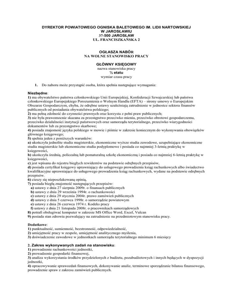 DYREKTOR POWIATOWEGO OGNISKA BALETOWEGO IM. LIDII NARTOWSKIEJ W JAROSŁAWIU 37-500 JAROSŁAW UL. FRANCISZKAŃSKA 2 OGŁASZA NABÓR NA WOLNE STANOWISKO PRACY GŁÓWNY KSIĘGOWY nazwa stanowiska pracy ½ etatu wymiar czasu pracy 1. Do naboru może przystąpić osoba, która spełnia następujące wymagania: Niezbędne: 1) ma obywatelstwo państwa członkowskiego Unii Europejskiej, Konfederacji Szwajcarskiej lub państwa członkowskiego Europejskiego Porozumienia o Wolnym Handlu (EFTA) – strony umowy o Europejskim Obszarze Gospodarczym, chyba, że odrębne ustawy uzależniają zatrudnienie w jednostce sektora finansów publicznych od posiadania obywatelstwa polskiego; 2) ma pełną zdolność do czynności prawnych oraz korzysta z pełni praw publicznych; 3) nie była prawomocnie skazana za przestępstwo przeciwko mieniu, przeciwko obrotowi gospodarczemu, przeciwko działalności instytucji państwowych oraz samorządu terytorialnego, przeciwko wiarygodności dokumentów lub za przestępstwo skarbowe; 4) posiada znajomość języka polskiego w mowie i piśmie w zakresie koniecznym do wykonywania obowiązków głównego księgowego; 5) spełnia jeden z poniższych warunków: a) ukończyła jednolite studia magisterskie, ekonomiczne wyższe studia zawodowe, uzupełniające ekonomiczne studia magisterskie lub ekonomiczne studia podyplomowe i posiada co najmniej 3-letnią praktykę w księgowości, b) ukończyła średnią, policealną lub pomaturalną szkołę ekonomiczną i posiada co najmniej 6-letnią praktykę w księgowości, c) jest wpisana do rejestru biegłych rewidentów na podstawie odrębnych przepisów, d) posiada certyfikat księgowy uprawniający do usługowego prowadzenia ksiąg rachunkowych albo świadectwo kwalifikacyjne uprawniające do usługowego prowadzenia ksiąg rachunkowych, wydane na podstawie odrębnych przepisów. 6) cieszy się nieposzlakowaną opinią, 7) posiada biegłą znajomość następujących przepisów: a) ustawy z dnia 27 sierpnia 2009r. o finansach publicznych b) ustawy z dnia 29 września 1994r. o rachunkowości c) ustawy z dnia 29 stycznia 2004r. prawo zamówień publicznych d) ustawy z dnia 5 czerwca 1998r. o samorządzie powiatowym e) ustawy z dnia 26 czerwca 1974 r. Kodeks pracy f) ustawy z dnia 21 listopada 2008r. o pracownikach samorządowych 8) potrafi obsługiwać komputer w zakresie MS Office Word, Excel, Vulcan 9) posiada stan zdrowia pozwalający na zatrudnienie na przedmiotowym stanowisku pracy. Dodatkowe: 1) punktualność, sumienność, bezstronność, odpowiedzialność, 2) umiejętność pracy w zespole, umiejętność analitycznego myślenia, 3) doświadczenie zawodowe w jednostkach samorządu terytorialnego minimum 6 miesięcy 2. Zakres wykonywanych zadań na stanowisku: 1) prowadzenie rachunkowości jednostki, 2) prowadzenie gospodarki finansowej, 3) analiza wykorzystania środków przydzielonych z budżetu, pozabudżetowych i innych będących w dyspozycji jednostki, 4) opracowywanie sprawozdań finansowych, dokonywanie analiz, terminowe sporządzanie bilansu finansowego, prowadzenie spraw z zakresu zamówień publicznych. 5) odprowadzanie podatku od osób fizycznych 6) odprowadzanie składek ZUS 7) Sporządzanie informacji i deklaracji o zatrudnieniu, kształceniu lub działalności na rzecz osób niepełnosprawnych - PFRON 8) wprowadzanie, uaktualnienie danych dotyczących planów finansowych do programu SIGMA sporządzanie deklaracji 9) księgowanie i wykonywanie dyspozycji płacowych i innych pieniężnych z Zakładowego Funduszu Świadczeń Socjalnych 10 dokonywanie wstępnej kontroli kompletności i rzetelności dokumentów dotyczących operacji gospodarczych i finansowych 11) dekretowanie dowodów księgowych zgodnie z obowiązującym planem kont jednostki budżetowej i klasyfikacji budżetowej 12) coroczne uzgodnienie wartości księgozbioru 13) kontrola dokumentów finansowo- księgowych pod względem formalno - rachunkowym 14) kontrola wewnętrzna w zakresie spraw bezpośrednio podległych 15) sporządzanie list płac i kart wynagrodzeń pracowników 16) naliczanie i sporządzanie list zasiłków ZUS 17) sporządzanie dokumentów rozliczeniowych i sprawozdań do ZUS i US 18) rozliczenie podatku od towaru i usług VAT 3. Warunki pracy na stanowisku: 1) praca w budynku POB w Jarosławiu, 37-500 Jarosław, ul. Franciszkańska 2 2) praca przy komputerze o charakterze administracyjno-biurowym, 3) praca w godzinach: od poniedziałku do piątku: od 730 do 1230, 4) praca na przedmiotowym stanowisku pracy nie jest narażona na występowanie uciążliwych i szkodliwych warunków pracy. 4. Informacja, czy w miesiącu poprzedzającym datę upublicznienia ogłoszenia wskaźnik zatrudnienia osób niepełnosprawnych w jednostce, w rozumieniu przepisów o rehabilitacji zawodowej i społecznej oraz zatrudnianiu osób niepełnosprawnych, wynosi co najmniej 6% - nie dotyczy. 5. Wymagane dokumenty: 1) podpisany własnoręcznie list motywacyjny, 2) podpisany własnoręcznie życiorys – CV, 3) wypełniony kwestionariusz osobowy dla osoby ubiegającej się o zatrudnienie, 4) kopie dokumentów potwierdzających kwalifikacje zawodowe, wymagane do wykonywania oferowanej pracy, 5) kopie świadectw pracy z poprzednich miejsc pracy lub zaświadczenia potwierdzające okresy zatrudnienia, obejmujące okresy pracy przypadające w roku kalendarzowym, w którym kandydat ubiega się o zatrudnienie, 6) osoba ubiegająca się o zatrudnienie może dodatkowo przedłożyć kopie dokumentów potwierdzających jej umiejętności i osiągnięcia zawodowe, świadectw pracy z poprzednich miejsc pracy lub zaświadczenia potwierdzające okresy zatrudnienia, obejmujące okresy pracy przypadające w innym roku kalendarzowym niż rok, w którym kandydat ubiega się o zatrudnienie oraz dokumenty stanowiące podstawę do korzystania ze szczególnych uprawnień w zakresie stosunku pracy, Uwaga: W przypadku przedstawienia przez kandydata dokumentów potwierdzających wykszt