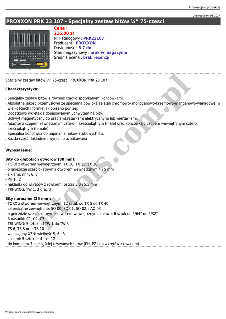 Informacje o produkcie Utworzono 04-03-2017 PROXXON PRK 23 107 - Specjalny zestaw bitów ¼” 75-części Cena : 216,00 zł Nr katalogowy : PRK23107 Producent : PROXXON Dostępność : 5-7 dni Stan magazynowy : brak w magazynie Średnia ocena : brak recenzji Specjalny zestaw bitów ¼” 75-części PROXXON PRK 23 107 ● ● ● ● ● ● Specjalny zestaw bitów z również rzadko spotykanymi końcówkami. Absolutna jakość przemysłowa ze specjalną powłokà ze stali chromowo- molibdenowo-krzemowo-manganowo-wanadowej w wielkościach i formie jak opisano poniżej. Dodatkowo wkrętak z dopasowanym uchwytem na bity. Uchwyt magnetyczny do prac z wkrętarkami elektrycznymi lub wiertarkami. Adapter z czopem zewnętrznym cztero- i sześciokątnym (male) oraz końcówką z czopem wewnętrznym cztero sześciokątnym (female). Specjalna końcówka do napinania haków śrubowych itp. Każda część dokładnie i wyraźnie oznakowana co ● m .p l Charakterystyka: Wyposażenie: to ol s. Bity do głębokich otworów (80 mm): - TORX z otworem wewnętrznym: TX 10, TX 15, TX 20. - o gnieździe sześciokątnym z otworem wewnętrznym 4 i 5 mm - z kłami: nr 4, 6, 8 - PH 1 i 2 - nakładki do wkrętów z rowkiem: ostrza 3,0 i 5,5 mm - TRI-WING: TW 1, 2 oraz 3 i- Bity normalne (25 mm): - TORX z otworem wewnętrznym: 12 sztuk od TX 5 do TX 40 - czterokątne zewnętrzne: SQ 00, SQ 01, SQ 02, i AQ 03 - o gnieździe sześciokątnym z otworem wewnętrznym, calowe: 6 sztuk od 5/64” do 5/32” - 3 nasadki: C1, C2, C3 - TRI-WING: 5 sztuk od TW 1 do TW 5 - TS 6, TS 8 oraz TS 10 - wielozębny XZN: wielkość 5, 6 i 8 - z kłami: 5 sztuk nr 4 – nr 12 - do kompletu 7 najczęściej używanych bitów (PH, PZ i do wkrętów z rowkiem). Wygenerowano w programie www.oscGold.com