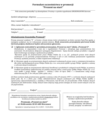 Formularz uczestnictwa w promocji "Prezent na start" Pola oznaczone gwiazdką* są obowiązkowe. Prosimy o czytelne wypełnianie DRUKOWANYMI literami. Symbol zakupionego ekspresu _____________________ Imię i nazwisko*: ______________________________________________________________ Rok urodzenia: ______________ Ulica, numer budynku i mieszkania*: ________________________________________________________________________ Kod pocztowy*: ____________ Miejscowość*: __________________________________________________________________ Telefon*: ________________________ E-mail: ____________________________________________________________________ Oświadczenia Uczestnika Promocji* Proszę oznaczyć znakiem "X" w kratce z lewej strony treści oświadczeń, na które wyraża Pani/Pan zgodę, a następnie podpisać się we wskazanym poniżej miejscu. Brak oznaczenia przynajmniej pierwszej kratki lub brak podpisu skutkować będzie odrzuceniem zgłoszenia. 1. Zgłaszam swój udział w sprzedaży promocyjnej „Prezent na start” (dalej: „Promocja”)* Oświadczam, iż zapoznałam (-em) się z regulaminem Promocji i akceptuję jego postanowienia bez zastrzeżeń. Do formularza dołączam wymagane Regulaminem: kopię dowodu zakupu produktu i oryginał kodu kreskowego wyciętego z opakowania produktu. Wyrażam zgodę na przetwarzanie przez Philips Polska Sp. z o.o. [1] podanych przeze mnie danych osobowych w na potrzeby przeprowadzenia Promocji w tym w celu realizacji postanowień regulaminu Promocji, wysłania prezentu, a także rozpatrzenia reklamacji. 2. Wyrażam zgodę na przetwarzanie danych osobowych wskazanych przeze mnie w niniejszym formularzu dla celów marketingowych przez Philips Polska Sp. z o.o. oraz przez spółki z grupy Philips zgodnie z ustawą o ochronie danych osobowych. 3. Wyrażam zgodę na otrzymywanie informacji handlowej o produktach i usługach marki Philips, za pomocą środków komunikacji elektronicznej na podany powyżej adres e-mail przez spółkę Philips Polska Sp. z o.o. oraz spółki z grupy Philips zgodnie z ustawą z dnia 18 lipca 2002 r. o świadczeniu usług drogą elektroniczną (Dz. U. Nr 144 poz.1204 z późn. zm.). [1] Dane osobowe będą przetwarzane zgodnie z ustawą z dnia 29 sierpnia 1997 r. o ochronie danych osobowych (tekst jedn. Dz. U. z 2014, poz. 1182). Administratorem danych osobowych jest Philips Polska Spółka z ograniczoną odpowiedzialnością z siedzibą w Warszawie, kod 02-222, Al. Jerozolimskie 195B. Podanie danych osobowych jest dobrowolne. Osoby, których dane dotyczą mają prawo dostępu do treści swoich danych oraz do ich poprawiania. Data* _______________ Podpis* ______________________________ Wypełniony formularz uczestnictwa wraz z kopią dowodu zakupu produktu oraz wyciętym z opakowania produktu oryginalnym kodem kreskowym należy wysłać na adres: Promocja „Prezent na start" ul. Wolbromska 38 03-680 Warszawa Sprzedaż w ramach promocji: 01.11.2015 – 31.01.2016 Miejsce na oryginalny kod kreskowy wycięty z opakowania produktu. Kopię dowodu zakupu (paragon fiskalny lub faktura) proszę przypiąć na odwrocie.