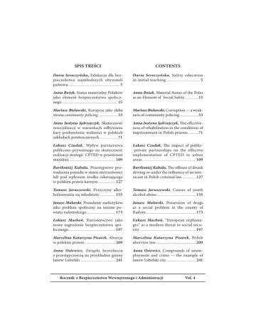 SPIS TREŚCI CONTENTS Daria Seroczyńska, Edukacja dla bezpieczeństwa najmłodszych obywateli państwa .................................................................. 5 Daria Seroczyńska, Safety education in initial teaching ....................................... 5 Anna Bożek, Status materialny Polaków jako element bezpieczeństwa społecznego .................................................................... 15 Anna Bożek, Material Status of the Poles as an Element of Social Safety .................15 Mariusz Bielawski, Korupcja jako słaba strona community policing .........................53 Mariusz Bielawski, Corruption — a weakness of community policing .........................53 Anna Justyna Jędrzejczyk, Skuteczność resocjalizacji w warunkach odbywania kary pozbawienia wolności w polskich zakładach penitencjarnych ........................71 Anna Justyna Jędrzejczyk, The effectiveness of rehabilitation in the conditions of imprisonment in Polish prisons ............. 71 Łukasz Czudak, Wpływ partnerstwa publiczno-prywatnego na skuteczność realizacji strategii CPTED w przestrzeni miejskiej ............................................................ 109 Łukasz Czudak, The impact of public-private partnerships on the effective implementation of CPTED in urban areas ............................................................... 109 Bartłomiej Kubala, Przestępstwo prowadzenia pojazdu w stanie nietrzeźwości lub pod wpływem środka odurzającego w polskim prawie karnym ...................... 127 Bartłomiej Kubala, The offense of drunk driving or under the influence of an intoxicant in Polish criminal law .................. 127 Tomasz Jaruszewski, Przyczyny alkoholizowania się młodzieży ................... 155 Tomasz Jaruszewski, Causes of youth alcohol abuse................................................ 155 Janusz Mularski, Posiadanie narkotyków jako problem społeczny na terenie powiatu radomskiego ................................... 173 Janusz Mularski, Possession of drugs as a social problem in the county of Radom ............................................................. 173 Łukasz Machoń, Eurosieroctwo jako nowe zagrożenie bezpieczeństwa społecznego ......................................................... 197 Łukasz Machoń, “European orphanages” as a modern threat to social security ............................................................... 197 Marcelina Katarzyna Pisarek, Aborcja w polskim prawie...................................... 209 Marcelina Katarzyna Pisarek, Polish abortion law .................................... 209 Anna Osiewicz, Związki bezrobocia z przestępczością na przykładzie gminy Janów Lubelski ........................................... 241 Anna Osiewicz, Compounds of unemployment and crime — the example of Janow Lubelski city ...................................... 241 Rocznik z Bezpieczeństwa Wewnętrznego i Administracji Vol. 4 Marta Stefania Brejnak, Stalking jako nowy typ czynu zabronionego w polskim ustawodawstwie karnym ......................... 257 Marta Stefania Brejnak, Stalking as a new type of offense under Polish penal legislation ......................................................... 257 Mariusz Pokropski, CPTED — strategia znana czy nieznana? ................................ 293 Mariusz Pokropski, CPTED — known or unknown strategy? ............................. 293 Tomasz Aleksander Foltyn, Prawnokarna ochrona instrumentów finansowych obrotu gospodarczego na przykładzie przepisów art. 297 k.k. oszustwa kredytowego, subwencyjnego i w zakresie zamówień publicznych ..................................................... 313 Tomasz Aleksander Foltyn, Criminal Law protection of business transactions in financial instruments on the example of provisions of Art. 297 of the Polish Penal Code on credit fraud, the grant and procurement ........................................................... 313 Igor Rumianowski, CPTED a realia polskie — analiza na przykładzie osiedla Rodziewiczówny w Nysie ..................... 337 Igor Rumianowski, CPTED in Polish reality — the problem analysis based on Rodziewiczówna housing located in Nysa city ........................................................ 337 Zbigniew Wielgosz, Przestępstwo rozboju na przykładzie działania KMP w Gliwicach ............................................... 359 Zbigniew Wielgosz, The crime of robbery on the example of the Metropolitan Police Headquarters activities in Gliwice .......... 359 Rocznik z Bezpieczeństwa Wewnętrznego i Administracji Vol. 4