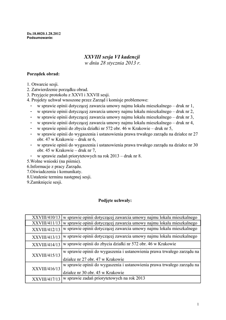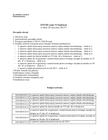 Dz.18.0020.1.28.2012 Podsumowanie: XXVIII sesja VI kadencji w dniu 28 stycznia 2013 r. Porządek obrad: 1. Otwarcie sesji. 2. Zatwierdzenie porządku obrad. 3. Przyjęcie protokołu z XXVI i XXVII sesji. 4. Projekty uchwał wnoszone przez Zarząd i komisje problemowe: - w sprawie opinii dotyczącej zawarcia umowy najmu lokalu mieszkalnego – druk nr 1, - w sprawie opinii dotyczącej zawarcia umowy najmu lokalu mieszkalnego – druk nr 2, - w sprawie opinii dotyczącej zawarcia umowy najmu lokalu mieszkalnego – druk nr 3, - w sprawie opinii dotyczącej zawarcia umowy najmu lokalu mieszkalnego – druk nr 4, - w sprawie opinii do zbycia działki nr 572 obr. 46 w Krakowie – druk nr 5, - w sprawie opinii do wygaszenia i ustanowienia prawa trwałego zarządu na działce nr 27 obr. 47 w Krakowie – druk nr 6, - w sprawie opinii do wygaszenia i ustanowienia prawa trwałego zarządu na działce nr 30 obr. 45 w Krakowie – druk nr 7, - w sprawie zadań priorytetowych na rok 2013 – druk nr 8. 5.Wolne wnioski (na piśmie). 6.Informacje z pracy Zarządu. 7.Oświadczenia i komunikaty. 8.Ustalenie terminu następnej sesji. 9.Zamknięcie sesji. Podjęte uchwały: XXVIII/410/13 w sprawie opinii dotyczącej zawarcia umowy najmu lokalu mieszkalnego XXVIII/411/13 w sprawie opinii dotyczącej zawarcia umowy najmu lokalu mieszkalnego XXVIII/412/13 w sprawie opinii dotyczącej zawarcia umowy najmu lokalu mieszkalnego XXVIII/413/13 w sprawie opinii dotyczącej zawarcia umowy najmu lokalu mieszkalnego XXVIII/414/13 w sprawie opinii do zbycia działki nr 572 obr. 46 w Krakowie w sprawie opinii do wygaszenia i ustanowienia prawa trwałego zarządu na XXVIII/415/13 działce nr 27 obr. 47 w Krakowie w sprawie opinii do wygaszenia i ustanowienia prawa trwałego zarządu na XXVIII/416/13 działce nr 30 obr. 45 w Krakowie XXVIII/417/13 w sprawie zadań priorytetowych na rok 2013 1 Dz.18.0020.1.28.2012 PROTOKÓŁ XXVIII SESJI RADY DZIELNICY XVIII Nowa Huta XXVIII sesja Rady Dzielnicy XVIII Nowa Huta odbyła się 28 stycznia 2013 r. w siedzibie Dzielnicy XVIII os. Centrum B 6. W załączeniu: 1) Lista obecności radnych– zał. nr 1. 2) Oryginały uchwał - zał. nr 2. 3) Wolne wniosek radnej Anny Stabryły – zał. nr 3. 4) Wolny wniosek radnej Stanisława Rusinowska – zał. nr 4. 5) Wolny wniosek radnej Marii Sajdak – zał. nr 5. 6) Wolny wniosek radnej Miłosławy Ciężak – zał. nr 6. 7) Wolny wniosek radnej Krystyna Frankiewicz – zał. nr 7, 8. _________________________________ XXVIII sesję Rady Dzielnicy XVIII Nowa Huta otworzył o godz. 18.00 Przewodniczący Rady i Zarządu Dzielnicy XVIII, Pan Stanisław Moryc, który serdecznie przywitał obecnych na sali i stwierdził quorum. 2. Zatwierdzenie porządku obrad. Przewodniczący przystąpił do zatwierdzenia porządku obrad. Projekt porządku został doręczony do skrytek wraz z zaproszeniem na sesję. 1. Otwarcie sesji. 2. Zatwierdzenie porządku obrad. 3. Przyjęcie protokołu z XXVI i XXVII sesji. 4. Projekty uchwał wnoszone przez Zarząd i komisje problemowe: - w sprawie opinii dotyczącej zawarcia umowy najmu lokalu mieszkalnego – druk nr 1, - w sprawie opinii dotyczącej zawarcia umowy najmu lokalu mieszkalnego – druk nr 2, - w sprawie opinii dotyczącej zawarcia umowy najmu lokalu mieszkalnego – druk nr 3, - w sprawie opinii dotyczącej zawarcia umowy najmu lokalu mieszkalnego – druk nr 4, - w sprawie opinii do zbycia działki nr 572 obr. 46 w Krakowie – druk nr 5, - w sprawie opinii do wygaszenia i ustanowienia prawa trwałego zarządu na działce nr 27 obr. 47 w Krakowie – druk nr 6, - w sprawie opinii do wygaszenia i ustanowienia prawa trwałego zarządu na działce nr 30 obr. 45 w Krakowie – druk nr 7, - w sprawie zadań priorytetowych na rok 2013 – druk nr 8. 5.Wolne wnioski (na piśmie). 6.Informacje z pracy Zarządu. 7.Oświadczenia i komunikaty. 8.Ustalenie terminu następnej sesji. 9.Zamknięcie sesji. 2 Prowadzący poddał pod głosowanie przyjęcie porządku obrad. Wyniki głosowania: Głosowało: 16 radnych Za głosowało – 16 radnych Przeciw 0 Wstrzymało się 0 Porządek obrad XXVIII sesji został przyjęty. 3. Przyjęcie protokołu z XXVI i XXVII sesji nadzwyczajnej. Przewodniczący Stanisław Moryc poinformował radnych, że protokół z XXVI sesji i protokół z XXVII sesji nadzwyczajnej Rady Dzielnicy XVIII był do wglądu w Biurze Rady – nikt nie wniósł zastrzeżeń i uwag. Przewodniczący stwierdził, że protokół z XXVI i XXVII sesji nadzwyczajnej został przyjęty. 4. Projekty uchwał wnoszone przez Zarząd i komisje problemowe: Przystąpiono do procedowania uchwał. Prowadzący obrady Stanisław Moryc przedstawił projekty uchwał przygotowane przez Zarząd Dzielnicy XVIII Nowa Huta i komisje problemowe. Druk nr 1 – projekt Zarządu – referent Małgorzata Bąk, pozytywna opinia Komisji Mieszkalnictwa, Rodziny i Osób Niepełnosprawnych - w sprawie opinii dotyczącej zawarcia umowy najmu lokalu mieszkalnego. Przewodniczący poinformował radnych o nowej procedurze opiniowania przedłużeń umów najmu lokali socjalnych oraz pomieszczeń tymczasowych w oparciu o protokół z wizji przeprowadzonej przez przedstawicieli Dzielnicy. W świetle przepisów radni nie są władni przeprowadzić wizji w mieszkaniu wnioskodawcy ani zasięgać opinii sąsiadów. Projekty uchwał zostały przygotowane na dotychczasowych zasadach. Powyższy problem ma być omawiany na spotkaniu Przewodniczących Dzielnic z Przewodniczącym RMK w dniu 31 stycznia 2013. Radny Stanisław Maranda odniósł się krytycznie do opiniowania przez Rady Dzielnic wniosków o przedłużenie umowy najmu lokali socjalnych i zgłosił wniosek, żeby nie opiniować wniosków do czasu zmiany procedury. W dyskusji na temat reperkusji nie podjęcia przez Radę opinii głos zabrali radni: Mariusz Woda, Stanisław Maranda, Mariusz Woda, Stanisław Maranda, Krystyna Frankiewicz, Krystyna Jastrzębska, Stanisław Maranda, Krystyna Jastrzę