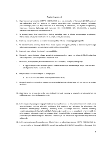 Regulamin promocji 1. Organizatorem promocji jest EMPIK E-COMMERCE Sp. z o.o. z siedzibą w Warszawie (00-017), przy ul. Marszałkowskiej 104/122, wpisana do rejestru przedsiębiorców Krajowego Rejestru Sądowego prowadzonego przez Sąd Rejonowy dla m.st. Warszawy w Warszawie, XII Wydział Gospodarczy Krajowego Rejestru Sądowego pod numerem KRS 0000490483, NIP: 5213662673, o kapitale zakładowym w wysokości 163 499 000,00 zł. 2. W promocji mogą brad udział klienci, którzy posiadają konto w sklepie internetowym empik.com, którzy zrobią zakupy na empik.com lub m.empik.com („Uczestnicy”). 3. Promocja jest prowadzona na terenie Rzeczpospolitej Polskiej i ma zasięg ogólnopolski. 4. W trakcie trwania promocji każdy Klient może uzyskad tylko jedną eKartę za dokonanie pierwszego zakupu promocyjnego z wykorzystaniem płatności mobilnych BLIK. 5. Promocja trwa od dnia 9 maja do 9 czerwca 2016 r. 6. Uczestnicy muszą dokonad zakupu w czasie trwania promocji na kwotę nie niższą niż 50 zł i zapłacid za zakup za pomocą systemu płatności mobilnych BLIK. 7. Uczestnicy, którzy spełnią warunki określone w pkt 6 otrzymają następujące nagrody: a. W ciągu maksymalnie 3 dni roboczych na ich koncie w sklepie internetowym empik.com zostanie udostępniona eKarta o wartości 20 zł. 8. Daty ważności i wartości nagród są następujące: a. dla eKart – ważne rok od dnia wygenerowania eKart; 9. Uczestnikom nie przysługuje prawo do otrzymania ekwiwalentu pieniężnego lub rzeczowego w zamian za eKarty. 10. Organizator ma prawo nie wydad Uczestnikowi Promocji nagrody w przypadku anulowania lub nie odebrania przez Uczestnika zamówienia. 11. Reklamacje dotyczące przebiegu płatności za towary oferowane w sklepie internetowym empik.com z wykorzystaniem systemu płatności mobilnych BLIK powinny byd zgłaszane do właściwego dla Uczestnika dokonującego transakcji płatniczej banku będącego wydawcą aplikacji mobilnej umożliwiającej Uczestnikowi płatnośd BLIK. Reklamacje rozpatrywane są przez banki w terminie 30 dni od otrzymania zgłoszenia zgodnie z ustawą z dnia 5 sierpnia 2015 r. o rozpatrywaniu reklamacji przez podmioty rynku finansowego i o Rzeczniku Finansowym lub właściwym regulaminem rozpatrywania reklamacji. 12. Reklamacje dotyczące Promocji można składad listem na adres Organizatora - EMPIK E-COMMERCE Sp. z o.o. z siedzibą w Warszawie (00-017), przy ul. Marszałkowskiej 104/122 z dopiskiem „Promocja BLIK 1 w empik.com” nie później niż w terminie 7 dni od zakooczenia Promocji (dla reklamacji przesłanej listem poleconym decydująca się data stempla pocztowego). Niedochowanie ww. terminu nie wstrzymuje możliwości dochodzenia stosownych roszczeo na drodze postępowania sądowego lub pozasądowego. Reklamacja powinna zawierad dane osoby wnoszącej reklamację (tj. imię, nazwisko i adres korespondencyjny w przypadku reklamacji listownej lub adres e-mail), powód reklamacji oraz żądanie określonego zachowania się przez Organizatora. Organizator rozpatrzy reklamację w ciągu 7 dni od momentu wpłynięcia jej do Organizatora i powiadomi Uczestnika o sposobie jej rozpatrzenia za pośrednictwem poczty na adres podany w liście lub za pośrednictwem e-maila (w zależności od tego w jaki sposób reklamacja wpłynęła do Organizatora). 13. Dane osobowe Uczestników Promocji będą wykorzystywane zgodnie z ustawą o ochronie danych osobowych z dnia 29 sierpnia 1997 r. (t. jedn. w Dz. U. z 2014 r. poz. 1182 ze. zm.), wyłącznie w celach związanych przedmiotowo z przeprowadzeniem Promocji lub z rozpoznaniem reklamacji. Administratorem danych osobowych Uczestników Promocji jest Organizator. Wszystkie dane osobowe Uczestników Promocji składających reklamacje lub skargi będą przechowywane i zabezpieczone zgodnie z zasadami określonymi w Ustawie z dnia 29.08.1997 r. o ochronie danych osobowych. Podanie danych osobowych ma charakter dobrowolny, jednakże ich niepodanie uniemożliwi rozpatrzenie reklamacji. Uczestnikom Promocji udostępniającym dane osobowe przysługują prawa do: dostępu do swoich danych, możliwości ich poprawiania, żądania zaprzestania ich przetwarzania lub sprzeciwu wobec ich przetwarzania. 14. W sprawach nieuregulowanych niniejszym regulaminem będą miały zastosowanie odpowiednie przepisy kodeksu cywilnego. 2
