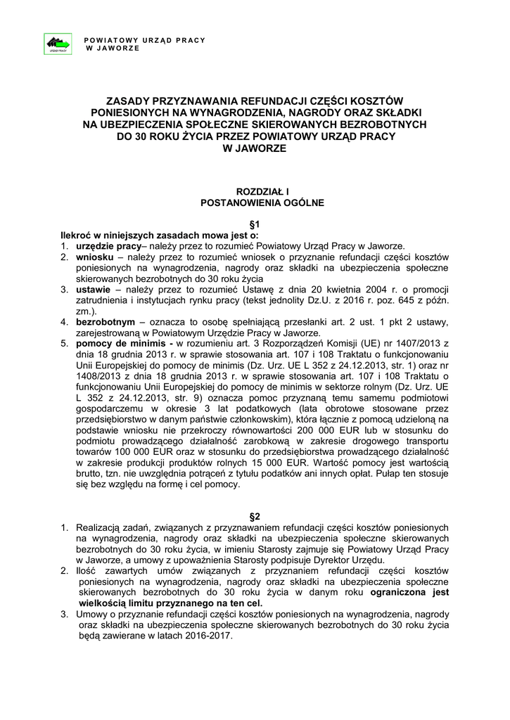 POW I AT OWY URZ ĄD PR ACY W JAWORZE ZASADY PRZYZNAWANIA REFUNDACJI CZĘŚCI KOSZTÓW PONIESIONYCH NA WYNAGRODZENIA, NAGRODY ORAZ SKŁADKI NA UBEZPIECZENIA SPOŁECZNE SKIEROWANYCH BEZROBOTNYCH DO 30 ROKU ŻYCIA PRZEZ POWIATOWY URZĄD PRACY W JAWORZE ROZDZIAŁ I POSTANOWIENIA OGÓLNE §1 Ilekroć w niniejszych zasadach mowa jest o: 1. urzędzie pracy– należy przez to rozumieć Powiatowy Urząd Pracy w Jaworze. 2. wniosku – należy przez to rozumieć wniosek o przyznanie refundacji części kosztów poniesionych na wynagrodzenia, nagrody oraz składki na ubezpieczenia społeczne skierowanych bezrobotnych do 30 roku życia 3. ustawie – należy przez to rozumieć Ustawę z dnia 20 kwietnia 2004 r. o promocji zatrudnienia i instytucjach rynku pracy (tekst jednolity Dz.U. z 2016 r. poz. 645 z późn. zm.). 4. bezrobotnym – oznacza to osobę spełniającą przesłanki art. 2 ust. 1 pkt 2 ustawy, zarejestrowaną w Powiatowym Urzędzie Pracy w Jaworze. 5. pomocy de minimis - w rozumieniu art. 3 Rozporządzeń Komisji (UE) nr 1407/2013 z dnia 18 grudnia 2013 r. w sprawie stosowania art. 107 i 108 Traktatu o funkcjonowaniu Unii Europejskiej do pomocy de minimis (Dz. Urz. UE L 352 z 24.12.2013, str. 1) oraz nr 1408/2013 z dnia 18 grudnia 2013 r. w sprawie stosowania art. 107 i 108 Traktatu o funkcjonowaniu Unii Europejskiej do pomocy de minimis w sektorze rolnym (Dz. Urz. UE L 352 z 24.12.2013, str. 9) oznacza pomoc przyznaną temu samemu podmiotowi gospodarczemu w okresie 3 lat podatkowych (lata obrotowe stosowane przez przedsiębiorstwo w danym państwie członkowskim), która łącznie z pomocą udzieloną na podstawie wniosku nie przekroczy równowartości 200 000 EUR lub w stosunku do podmiotu prowadzącego działalność zarobkową w zakresie drogowego transportu towarów 100 000 EUR oraz w stosunku do przedsiębiorstwa prowadzącego działalność w zakresie produkcji produktów rolnych 15 000 EUR. Wartość pomocy jest wartością brutto, tzn. nie uwzględnia potrąceń z tytułu podatków ani innych opłat. Pułap ten stosuje się bez względu na formę i cel pomocy. §2 1. Realizacją zadań, związanych z przyznawaniem refundacji części kosztów poniesionych na wynagrodzenia, nagrody oraz składki na ubezpieczenia społeczne skierowanych bezrobotnych do 30 roku życia, w imieniu Starosty zajmuje się Powiatowy Urząd Pracy w Jaworze, a umowy z upoważnienia Starosty podpisuje Dyrektor Urzędu. 2. Ilość zawartych umów związanych z przyznaniem refundacji części kosztów poniesionych na wynagrodzenia, nagrody oraz składki na ubezpieczenia społeczne skierowanych bezrobotnych do 30 roku życia w danym roku ograniczona jest wielkością limitu przyznanego na ten cel. 3. Umowy o przyznanie refundacji części kosztów poniesionych na wynagrodzenia, nagrody oraz składki na ubezpieczenia społeczne skierowanych bezrobotnych do 30 roku życia będą zawierane w latach 2016-2017. 4. Pracodawca lub Przedsiębiorca aby móc otrzymać refundację części kosztów poniesionych na wynagrodzenia, nagrody oraz składki na ubezpieczenia społeczne skierowanych bezrobotnych do 30 roku życia zobowiązany jest do zawarcia umowy o pracę w pełnym wymiarze czasu pracy na okres 24 miesięcy, w tym: a) przez okres 12 miesięcy Urząd Pracy refunduje pracodawcy lub przedsiębiorcy części kosztów poniesionych na wynagrodzenia, nagrody oraz składki na ubezpieczenia społeczne skierowanych bezrobotnych do 30 roku życia w wysokości nieprzekraczającej minimalnego wynagrodzenia za pracę miesięcznie i składek na ubezpieczenie społeczne od refundowanego wynagrodzenia za każdego skierowanego bezrobotnego oraz b) przez okres 12 miesięcy pracodawca lub przedsiębiorca zatrudnia skierowanego bezrobotnego po zakończeniu okresu refundacji. 5. Nie dopuszcza się umów: na okres próbny i umów na czas określony krótszy niż 24 miesiące. §3 Wykluczenia podmiotowe 1. Ze wsparcia wykluczeni są Pracodawcy lub Przedsiębiorcy: a) u których w okresie ostatnich 6 miesięcy przed złożeniem wniosku nastąpiło zmniejszenie zatrudnienia z przyczyn dotyczących zakładu pracy. b) w przypadku których udzielenie wsparcia byłoby niezgodne z warunkami dopuszczalności pomocy de minimis. c) którzy prowadzą działalność przez okres krótszy niż 6 miesięcy przed dniem złożenia wniosku. Działalność w okresie 6 miesięcy przed dniem złożenia wniosku nie może być zawieszona. 2. Ze wsparcia wyklucza się osoby bezrobotne do 30 roku życia: a) które w okresie ostatnich 6 miesięcy były zatrudnione u Wnioskodawcy (niezależnie od formy i długości zatrudnienia) b) pozostające w najbliższym stosunku pokrewieństwa z Pracodawcą lub Przedsiębiorcą (rodzic – dziecko, dziecko – rodzic, rodzeństwo, małżonkowie). §4 Osoby uprawnione do zatrudnienia w ramach refundacji 1. Do zatrudnienia w ramach tej formy wsparcia mogą być kierowane osoby bezrobotne, które nie ukończyły 30 roku życia oraz dla których ustalono II profil pomocy (zgodnie z art. 33 ust. 2b Ustawy z dnia 20 kwietnia 2004 r. o promocji zatrudnienia i instytucjach rynku pracy (tekst jednolity Dz. U. z 2016 r. poz. 645 z późn. zm.). 2. Urząd Pracy ustala dla bezrobotnego profil pomocy oznaczający właściwy ze względu na potrzeby bezrobotnego zakres form pomocy określonych w ustawie. 3. Osoby bezrobotne, uprawione do zatrudnienia w ramach refundacji części kosztów poniesionych na wynagrodzenia, nagrody oraz składki na ubezpieczenia społeczne skierowanych bezrobotnych do 30 roku życia, kierowane są do Pracodawców lub Przedsiębiorców na podstawie skierowań Urzędu Pracy. 4. Pracodawca lub Przedsiębiorca, z którym zostanie zawarta umowa zobowiązany jest do utrzymania w zatrudnieniu w ramach umowy o pracę w pełnym wymiarze czasu pracy skierowanego bezrobotnego przez okres 12 miesięcy, za który dokonywana jest refundacja oraz przez okres 12 miesięcy po zakończeniu tej refundacji. Strona 2 z 7 ROZ