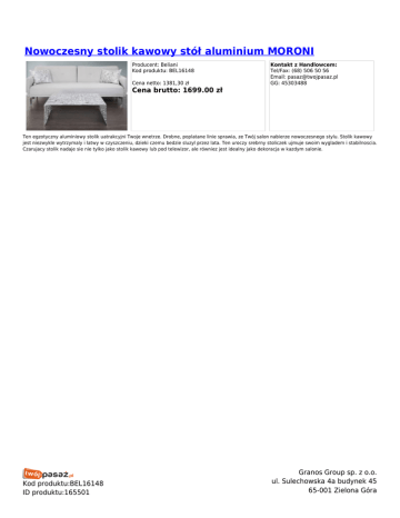 Nowoczesny stolik kawowy stół aluminium MORONI Producent: Beliani Kod produktu: BEL16148 Cena netto: 1381,30 zł Kontakt z Handlowcem: Tel/Fax: (68) 506 50 56 Email: [email protected] GG: 45303488 Cena brutto: 1699.00 zł Ten egzotyczny aluminiowy stolik uatrakcyjni Twoje wnetrze. Drobne, poplatane linie sprawia, ze Twój salon nabierze nowoczesnego stylu. Stolik kawowy jest niezwykle wytrzymaly i latwy w czyszczeniu, dzieki czemu bedzie sluzyl przez lata. Ten uroczy srebrny stoliczek ujmuje swoim wygladem i stabilnoscia. Czarujacy stolik nadaje sie nie tylko jako stolik kawowy lub pod telewizor, ale równiez jest idealny jako dekoracja w kazdym salonie. Kod produktu:BEL16148 ID produktu:165501 Granos Group sp. z o.o. ul. Sulechowska 4a budynek 45 65-001 Zielona Góra