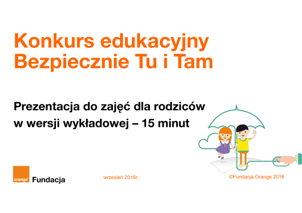 Konkurs edukacyjny Bezpiecznie Tu i Tam Prezentacja do zajęć dla rodziców w wersji wykładowej – 15 minut wrzesień 2016r. ©Fundacja Orange 2016 Agenda spotkania 1. Internet w naszej codzienności. Rola rodzica w edukacji cyfrowej dziecka. 2. Kurs internetowy Bezpiecznie Tu i Tam. Jak chronić dziecko w sieci? 3. Konkurs edukacyjny Bezpiecznie Tu i Tam. Dbajmy o bezpieczeństwo dzieci w internecie. 4. Fundacja Orange - 11 lat działań na rzecz edukacji cyfrowej w Polsce. ©Fundacja Orange 2016 Internet w naszej codzienności. Rola rodzica w edukacji cyfrowej dziecka. ©Fundacja Orange 2016 Internet w naszej codzienności. Rola rodzica w edukacji cyfrowej dziecka. Nowe technologie i internet stały się nieodłączną częścią współczesnego świata, a ich rozwój wyraźnie oddziałuje na społeczeństwo. ©Fundacja Orange 2016 Internet w naszej codzienności. Rola rodzica w edukacji cyfrowej dziecka. Pomimo że dzieci biegle obsługują urządzenia elektroniczne z dostępem do internetu, to jednak nie mają świadomości konsekwencji, jakie niesie ich aktywność w sieci, a także zagrożeń, które mogą się z tym wiązać. ©Fundacja Orange 2016 Internet w naszej codzienności. Rola rodzica w edukacji cyfrowej dziecka. Dzieci potrzebują Was, rodziców, jako cyfrowych przewodników. ©Fundacja Orange 2016 Internet w naszej codzienności. Rola rodzica w edukacji cyfrowej dziecka. Nie trzeba być ekspertem od nowych technologii, by odpowiednio przygotować dziecko do bezpiecznych podróży w internecie. Warto poświęcić czas i uwagę, by opowiedzieć dzieciom o uniwersalnych zasadach bezpieczeństwa i odpowiedzialności. ©Fundacja Orange 2016 Internet w naszej codzienności. Rola rodzica w edukacji cyfrowej dziecka. W realizacji wyzwań związanych z przygotowaniem dziecka do przygody w cyfrowym świecie pomoże Kurs internetowy Bezpiecznie Tu i Tam. ©Fundacja Orange 2016 Kurs internetowy Bezpiecznie Tu i Tam. Jak chronić dziecko w sieci? ©Fundacja Orange 2016 Kurs internetowy Bezpiecznie Tu i Tam. Jak chronić dziecko w sieci? Kurs Bezpiecznie Tu i Tam jest dostępny online na fundacja.orange.pl/kurs Korzystane z kursu jest nieodpłatne. ©Fundacja Orange 2016 Kurs internetowy Bezpiecznie Tu i Tam. Jak chronić dziecko w sieci? O tym, jak korzystać z kursu opowiada animacja instruktażowa dostępna na: fundacja.orange.pl/kurs - menu - ikonka „Przewodnik” ©Fundacja Orange 2016 Kurs internetowy Bezpiecznie Tu i Tam. Jak chronić dziecko w sieci? Rodzice, którzy zrealizują kurs, włączają się w Konkurs edukacyjny Bezpiecznie Tu i Tam, w którym udział bierze nasza szkoła. Punkty za zdobyte certyfikaty mogą przekazać na rzecz szkoły. ©Fundacja Orange 2016 Kurs internetowy Bezpiecznie Tu i Tam. Jak chronić dziecko w sieci? Wystarczy w formularzu rejestracyjnym wybrać z listy szkołę, na której konto zbierane będą punkty. ©Fundacja Orange 2016 Konkurs edukacyjny Bezpiecznie Tu i Tam. Dbajmy o bezpieczeństwo dzieci w internecie. ©Fundacja Orange 2016 Konkurs edukacyjny Bezpiecznie Tu i Tam. Dbajmy o bezpieczeństwo dzieci w internecie. Konkurs edukacyjny Bezpiecznie Tu i Tam jest akcją skierowaną do szkół podstawowych i ma na celu podniesienie kompetencji dzieci oraz wsparcie rodziców w edukacji cyfrowej dziecka o bezpieczeństwie w internecie. ©Fundacja Orange 2016 Konkurs edukacyjny Bezpiecznie Tu i Tam. Dbajmy o bezpieczeństwo dzieci w internecie. Rozpoczęcie akcji: 1 września 2016r. Ogłoszenie wyników: 15 kwietnia 2017r. ©Fundacja Orange 2016 Konkurs edukacyjny Bezpiecznie Tu i Tam. Dbajmy o bezpieczeństwo dzieci w internecie. Nagrodą główną w międzyszkolnej rywalizacji jest 30 tysięcy złotych na wyposażenie pracowni multimedialnej. Dla kolejnych 10 najlepszych szkół przewidziane są nagrody wyróżnienia w postaci sprzętu dydaktycznego wartego 5 000 zł. ©Fundacja Orange 2016 Konkurs edukacyjny Bezpiecznie Tu i Tam. Dbajmy o bezpieczeństwo dzieci w internecie. Uczniowie mogą także wygrać nagrody indywidualne, wykonując prace w ramach trzech zadań konkursowych. Nagrodami będą tablety, gadżety elektroniczne oraz gry edukacyjne. ©Fundacja Orange 2016 Konkurs edukacyjny Bezpiecznie Tu i Tam. Dbajmy o bezpieczeństwo dzieci w internecie Punkty na konto szkoły zdobywają: • nauczyciele – organizując aktywności w szkole, • dzieci – uczestnicząc w lekcjach i konkursach, • rodzice – zdobywając certyfikaty kursu. ©Fundacja Orange 2016 Konkurs edukacyjny Bezpiecznie Tu i Tam. Dbajmy o bezpieczeństwo dzieci w internecie Każdy rodzic, zdobywając 5 certyfikatów w kursie Bezpiecznie Tu i Tam, dodaje punkty na konto szkoły. ©Fundacja Orange 2016 Konkurs edukacyjny Bezpiecznie Tu i Tam. Dbajmy o bezpieczeństwo dzieci w internecie. Więcej informacji o Konkursie na fundacja.orange.pl/kurs/konkurs oraz u Koordynatora na terenie szkoły. ©Fundacja Orange 2016 Fundacja Orange - 11 lat działań na rzecz edukacji cyfrowej w Polsce. ©Fundacja Orange 2016 Fundacja Orange - 11 lat działań na rzecz edukacji cyfrowej w Polsce. Akcja organizowana jest w ramach programu społecznego Bezpiecznie Tu i Tam. Jego celem jest zwiększenie bezpieczeństwa dzieci online oraz edukacja młodych internautów, ich rodziców i opiekunów w zakresie odpowiedzialnego korzystania z sieci. ©Fundacja Orange 2016 Fundacja Orange - 11 lat działań na rzecz edukacji cyfrowej w Polsce. Misją Fundacji Orange jest edukacja dzieci oraz osób dorosłych w zakresie kompetencji cyfrowych. Wspieramy energię i kreatywność ludzi, by wspólnie z nimi zmieniać świat na lepsze. ©Fundacja Orange 2016 Fundacja Orange - 11 lat działań na rzecz edukacji cyfrowej w Polsce. Więcej informacji na temat działalności Fundacji Orange znajdziecie Państwo na stronie fundacja.orange.pl oraz fanpage’u /FundacjaOrange. ©Fundacja Orange 2016 Dziękujemy za uwagę. Fundacja Orange łączy, uczy, inspiruje. ©Fundacja Orange 2016