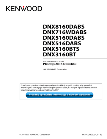 DNX8160DABS DNX716WDABS DNX5160DABS DNX516DABS DNX5160BTS DNX3160BT SYSTEM NAWIGACJI GPS PODRĘCZNIK OBSŁUGI Przed przeczytaniem niniejszego podręcznika kliknij przycisk poniżej, aby sprawdzić informacje na temat jego najnowszego wydania i stron, na których wprowadzono zmiany. http://manual.kenwood.com/edition/im391/ Prosimy sprawdzić informacje o nowym wydaniu © 2016 JVC KENWOOD Corporation im391_Ref_E_Pl_01 (E) Co chcesz zrobić? Co chcesz zrobić? Dziękujemy za zakup SYSTEMU NAWIGACJI GPS KENWOOD. W niniejszym podręczniku podano różne wygodne funkcje systemu. Kliknąć ikonę nośnika, który ma być odtworzony. Jedno kliknięcie umożliwia przejście do części poświęconej każdemu z nośników! iPod USB VCD Radio Płyta z mediami CD z muzyką DVD VIDEO BT Audio Apple CarPlay Android Mirroring Auto Spotify DAB 1 Spis treści Spis treści 4 Radio52 #OSTRZEŻENIE_____________________4 Podstawowa obsługa radia____________52 Opis korzystania z instrukcji obsługi5 Podstawowa obsługa cyfrowego radia___54 Przed użyciem Podstawowe operacje 6 Obsługa pamięci____________________56 Operacja wybierania_________________57 Funkcje przycisków na panelu przednim_ 6 Informacje o ruchu (tylko tuner FM i radio cyfrowe)_________58 Włączanie urządzenia_________________14 Powtarzanie (tylko radio cyfrowe)_______59 Sposób odtwarzania mediów__________17 Konfiguracja radia___________________60 Odłączanie panelu przedniego_________21 Ustawienia Radia Cyfrowego___________61 Operacje za pomocą ekranu HOME (Dom)________________________22 Sterowanie Bluetooth Najczęściej używane operacje__________24 Obsługa nawigacji___________________26 DVD/Video CD (VCD) 28 Podstawowa obsługa DVD/VCD________28 Obsługa menu płyty DVD_____________31 64 Rejestracja i podłączenie urządzenia Bluetooth__________________________64 Odtwarzanie z urządzenia audio Bluetooth__________________________68 Korzystanie z zestawu głośnomówiącego___________________70 Konfiguracja DVD____________________32 Programowanie urządzenia głośnomówiącego___________________74 CD/Pliki audio i wideo/iPod/ APLIKACJE34 Konfiguracja76 Ustawienia APLIKACJI/iPoda___________35 Ustawienie kąta monitora _____________77 Podstawowa obsługa plików muzycznych/video___________________36 Operacja wyszukiwania_______________40 Obsługa serwisu Spotify______________44 Obsługa funkcji Mirroring_____________46 Obsługa funkcji Apple CarPlay__________48 Obsługa Android Auto™_______________50 Konfiguracja ekranu monitora__________76 Sterowanie widokiem z kamery________77 Konfiguracja systemu_________________78 Konfiguracja interfejsu użytkownika_____78 Konfiguracja funkcji specjalnych________81 Konfiguracja zabezpieczeń____________82 Konfiguracja wyświetlacza_____________83 Konfiguracja kamery_________________85 Nawigacja PROGRAMOWANIE__________86 Konfiguracja AV_____________________87 2 Spis treści Sterowanie dźwiękiem 88 Konfiguracja głośników/zwrotnicy______88 Sterowanie dźwiękiem ogólnym________91 Sterowanie korektorem dźwięku________92 Dopasowanie głośności_______________93 Sterowanie strefą____________________94 Sound Effect________________________95 Pozycja odsłuchu/ DTA________________96 Pilot zdalnego sterowania 100 Wkładanie baterii____________________100 Funkcje przycisków pilota zdalnego sterowania_________________________101 Rozwiązywanie problemów 104 Problemy i rozwiązania_______________104 Komunikaty o błędach________________105 Dodatek108 Media i pliki, które można odtwarzać____108 Elementy wskaźnika paska statusu______112 Kody obszarów świata________________114 Kody językowe płyt DVD______________115 Dane techniczne_____________________116 Informacje o urządzeniu______________119 3 Przed użyciem Przed użyciem #OSTRZEŻENIE Aby zapobiec zranieniom czy zagrożeniu pożarem, należy stosować następujące środki ostrożności: • Aby nie dopuścić do zwarć, nigdy nie wkładaj ani nie wrzucaj do środka urządzenia żadnych przedmiotów metalowych (np. monet czy narzędzi metalowych). • Nie patrz na ekran urządzenia przez dłuższy czas podczas prowadzenia pojazdu. • W przypadku napotkania trudności podczas instalacji, zasięgnij porady u sprzedawcy produktów firmy KENWOOD. Środki ostrożności związane z eksploatacją urządzenia • W przypadku zakupu wyposażenia dodatkowego, skorzystaj z pomocy sprzedawcy produktów firmy KENWOOD, aby dowiedzieć się, czy będzie ono współpracować z Twoim modelem, w Twoim regionie. • Można wybrać język, w którym wyświetlane będą menu, znaczniki plików dźwiękowych, itp. Patrz Konfiguracja interfejsu użytkownika (str.78). • Funkcje Radio Data System lub Radio Broadcast Data System nie są dostępne na obszarze, gdzie żadna stacja nadawcza nie używa tych funkcji. Zaparowanie soczewek Po włączeniu ogrzewania w samochodzie przy zimnej temperaturze, na soczewce odtwarzacza urządzenia może zbierać się para. Jest to tak zwane zamglenie soczewki, a skroplona woda na soczewce może uniemożliwiać odtwarzanie płyt. W takim przypadku należy wyjąć płytę i poczekać, aż skondensowana woda wyparuje. Jeśli urządzenie nadal działa nieprawidłowo, skontaktuj się ze sprzedawcą sprzętu KENWOOD. Środki ostrożności dotyczące płyt • Nie dotykaj zapisanej strony płyty. • Nie przyklejaj taśmy itp. do płyty ani nie używaj płyty z przyklejoną taśmą. • Nie korzystaj z akcesoriów podobnych do płyt. • Czyść płytę od środka do zewnątrz. • Płyty należy wyciągać z urządzenia poziomo. • Jeśli wokół środkowego otworu płyty lub na jej krawędzi znajdują się włókna, należy je usunąć np. długopisem przed włożeniem płyty do urządzenia. • Nie można odtwarzać płyt, które nie są okrągłe. Ochrona monitora Aby nie uszkodzić monitora, nie należy dotykać go długopisem lub podobnym przedmiotem z ostrym końcem. Czyszczenie urządzenia Jeśli panel czołowy je