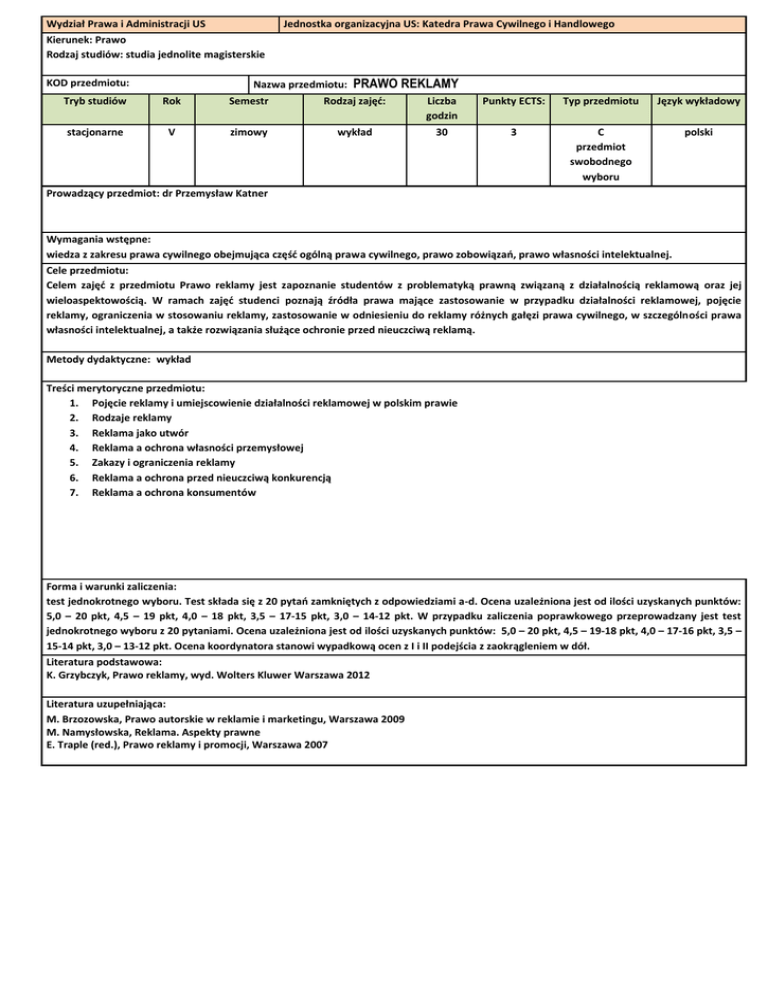Wydział Prawa i Administracji US Jednostka organizacyjna US: Katedra Prawa Cywilnego i Handlowego Kierunek: Prawo Rodzaj studiów: studia jednolite magisterskie KOD przedmiotu: Nazwa przedmiotu: PRAWO REKLAMY Tryb studiów Rok Semestr Rodzaj zajęć: Liczba godzin Punkty ECTS: Typ przedmiotu Język wykładowy stacjonarne V zimowy wykład 30 3 C przedmiot swobodnego wyboru polski Prowadzący przedmiot: dr Przemysław Katner Wymagania wstępne: wiedza z zakresu prawa cywilnego obejmująca część ogólną prawa cywilnego, prawo zobowiązań, prawo własności intelektualnej. Cele przedmiotu: Celem zajęć z przedmiotu Prawo reklamy jest zapoznanie studentów z problematyką prawną związaną z działalnością reklamową oraz jej wieloaspektowością. W ramach zajęć studenci poznają źródła prawa mające zastosowanie w przypadku działalności reklamowej, pojęcie reklamy, ograniczenia w stosowaniu reklamy, zastosowanie w odniesieniu do reklamy różnych gałęzi prawa cywilnego, w szczególności prawa własności intelektualnej, a także rozwiązania służące ochronie przed nieuczciwą reklamą. Metody dydaktyczne: wykład Treści merytoryczne przedmiotu: 1. Pojęcie reklamy i umiejscowienie działalności reklamowej w polskim prawie 2. Rodzaje reklamy 3. Reklama jako utwór 4. Reklama a ochrona własności przemysłowej 5. Zakazy i ograniczenia reklamy 6. Reklama a ochrona przed nieuczciwą konkurencją 7. Reklama a ochrona konsumentów Forma i warunki zaliczenia: test jednokrotnego wyboru. Test składa się z 20 pytań zamkniętych z odpowiedziami a-d. Ocena uzależniona jest od ilości uzyskanych punktów: 5,0 – 20 pkt, 4,5 – 19 pkt, 4,0 – 18 pkt, 3,5 – 17-15 pkt, 3,0 – 14-12 pkt. W przypadku zaliczenia poprawkowego przeprowadzany jest test jednokrotnego wyboru z 20 pytaniami. Ocena uzależniona jest od ilości uzyskanych punktów: 5,0 – 20 pkt, 4,5 – 19-18 pkt, 4,0 – 17-16 pkt, 3,5 – 15-14 pkt, 3,0 – 13-12 pkt. Ocena koordynatora stanowi wypadkową ocen z I i II podejścia z zaokrągleniem w dół. Literatura podstawowa: K. Grzybczyk, Prawo reklamy, wyd. Wolters Kluwer Warszawa 2012 Literatura uzupełniająca: M. Brzozowska, Prawo autorskie w reklamie i marketingu, Warszawa 2009 M. Namysłowska, Reklama. Aspekty prawne E. Traple (red.), Prawo reklamy i promocji, Warszawa 2007
