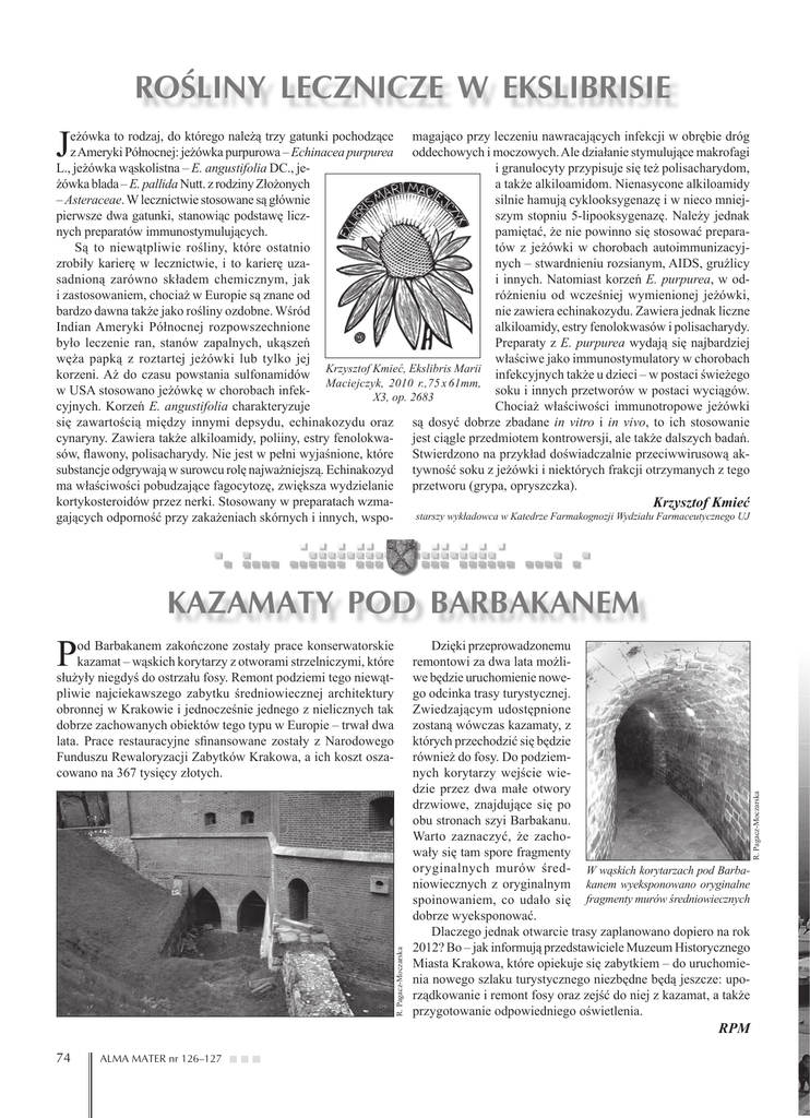 ROŚLINY LECZNICZE W EKSLIBRISIE J eżówka to rodzaj, do którego należą trzy gatunki pochodzące magająco przy leczeniu nawracających infekcji w obrębie dróg z Ameryki Północnej: jeżówka purpurowa – Echinacea purpurea oddechowych i moczowych. Ale działanie stymulujące makrofagi L., jeżówka wąskolistna – E. angustifolia DC., jei granulocyty przypisuje się też polisacharydom, żówka blada – E. pallida Nutt. z rodziny Złożonych a także alkiloamidom. Nienasycone alkiloamidy – Asteraceae. W lecznictwie stosowane są głównie silnie hamują cyklooksygenazę i w nieco mniejpierwsze dwa gatunki, stanowiąc podstawę liczszym stopniu 5-lipooksygenazę. Należy jednak nych preparatów immunostymulujących. pamiętać, że nie powinno się stosować preparaSą to niewątpliwie rośliny, które ostatnio tów z jeżówki w chorobach autoimmunizacyjzrobiły karierę w lecznictwie, i to karierę uzanych – stwardnieniu rozsianym, AIDS, gruźlicy sadnioną zarówno składem chemicznym, jak i innych. Natomiast korzeń E. purpurea, w odi zastosowaniem, chociaż w Europie są znane od różnieniu od wcześniej wymienionej jeżówki, bardzo dawna także jako rośliny ozdobne. Wśród nie zawiera echinakozydu. Zawiera jednak liczne Indian Ameryki Północnej rozpowszechnione alkiloamidy, estry fenolokwasów i polisacharydy. było leczenie ran, stanów zapalnych, ukąszeń Preparaty z E. purpurea wydają się najbardziej węża papką z roztartej jeżówki lub tylko jej właściwe jako immunostymulatory w chorobach korzeni. Aż do czasu powstania sulfonamidów Krzysztof Kmieć, Ekslibris Marii infekcyjnych także u dzieci – w postaci świeżego Maciejczyk, 2010 r.,75 x 61mm, w USA stosowano jeżówkę w chorobach infeksoku i innych przetworów w postaci wyciągów. X3, op. 2683 cyjnych. Korzeń E. angustifolia charakteryzuje Chociaż właściwości immunotropowe jeżówki się zawartością między innymi depsydu, echinakozydu oraz są dosyć dobrze zbadane in vitro i in vivo, to ich stosowanie cynaryny. Zawiera także alkiloamidy, poliiny, estry fenolokwa- jest ciągle przedmiotem kontrowersji, ale także dalszych badań. sów, flawony, polisacharydy. Nie jest w pełni wyjaśnione, które Stwierdzono na przykład doświadczalnie przeciwwirusową aksubstancje odgrywają w surowcu rolę najważniejszą. Echinakozyd tywność soku z jeżówki i niektórych frakcji otrzymanych z tego ma właściwości pobudzające fagocytozę, zwiększa wydzielanie przetworu (grypa, opryszczka). kortykosteroidów przez nerki. Stosowany w preparatach wzmaKrzysztof Kmieć starszy wykładowca w Katedrze Farmakognozji Wydziału Farmaceutycznego UJ gających odporność przy zakażeniach skórnych i innych, wspo- P R. Pagacz-Moczarska od Barbakanem zakończone zostały prace konserwatorskie kazamat – wąskich korytarzy z otworami strzelniczymi, które służyły niegdyś do ostrzału fosy. Remont podziemi tego niewątpliwie najciekawszego zabytku średniowiecznej architektury obronnej w Krakowie i jednocześnie jednego z nielicznych tak dobrze zachowanych obiektów tego typu w Europie – trwał dwa lata. Prace restauracyjne sfinansowane zostały z Narodowego Funduszu Rewaloryzacji Zabytków Krakowa, a ich koszt oszacowano na 367 tysięcy złotych. Dzięki przeprowadzonemu remontowi za dwa lata możliwe będzie uruchomienie nowego odcinka trasy turystycznej. Zwiedzającym udostępnione zostaną wówczas kazamaty, z których przechodzić się będzie również do fosy. Do podziemnych korytarzy wejście wiedzie przez dwa małe otwory drzwiowe, znajdujące się po obu stronach szyi Barbakanu. Warto zaznaczyć, że zachowały się tam spore fragmenty oryginalnych murów śred- W wąskich korytarzach pod Barbaniowiecznych z oryginalnym kanem wyeksponowano oryginalne spoinowaniem, co udało się fragmenty murów średniowiecznych dobrze wyeksponować. Dlaczego jednak otwarcie trasy zaplanowano dopiero na rok 2012? Bo – jak informują przedstawiciele Muzeum Historycznego Miasta Krakowa, które opiekuje się zabytkiem – do uruchomienia nowego szlaku turystycznego niezbędne będą jeszcze: uporządkowanie i remont fosy oraz zejść do niej z kazamat, a także przygotowanie odpowiedniego oświetlenia. RPM 74 ALMA MATER nr 126–127 R. Pagacz-Moczarska KAZAMATY POD BARBAKANEM