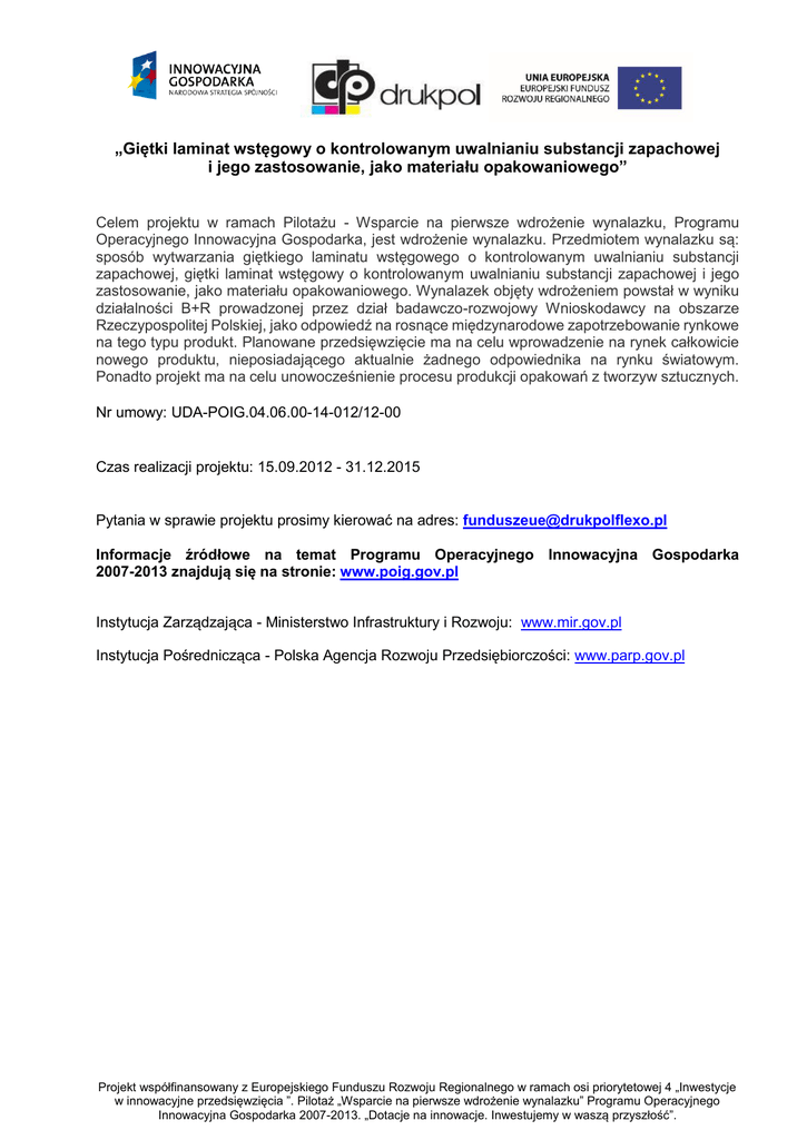 „Giętki laminat wstęgowy o kontrolowanym uwalnianiu substancji zapachowej i jego zastosowanie, jako materiału opakowaniowego” Celem projektu w ramach Pilotażu - Wsparcie na pierwsze wdrożenie wynalazku, Programu Operacyjnego Innowacyjna Gospodarka, jest wdrożenie wynalazku. Przedmiotem wynalazku są: sposób wytwarzania giętkiego laminatu wstęgowego o kontrolowanym uwalnianiu substancji zapachowej, giętki laminat wstęgowy o kontrolowanym uwalnianiu substancji zapachowej i jego zastosowanie, jako materiału opakowaniowego. Wynalazek objęty wdrożeniem powstał w wyniku działalności B+R prowadzonej przez dział badawczo-rozwojowy Wnioskodawcy na obszarze Rzeczypospolitej Polskiej, jako odpowiedź na rosnące międzynarodowe zapotrzebowanie rynkowe na tego typu produkt. Planowane przedsięwzięcie ma na celu wprowadzenie na rynek całkowicie nowego produktu, nieposiadającego aktualnie żadnego odpowiednika na rynku światowym. Ponadto projekt ma na celu unowocześnienie procesu produkcji opakowań z tworzyw sztucznych. Nr umowy: UDA-POIG.04.06.00-14-012/12-00 Czas realizacji projektu: 15.09.2012 - 31.12.2015 Pytania w sprawie projektu prosimy kierować na adres: [email protected] Informacje źródłowe na temat Programu Operacyjnego Innowacyjna Gospodarka 2007-2013 znajdują się na stronie: www.poig.gov.pl Instytucja Zarządzająca - Ministerstwo Infrastruktury i Rozwoju: www.mir.gov.pl Instytucja Pośrednicząca - Polska Agencja Rozwoju Przedsiębiorczości: www.parp.gov.pl Projekt współfinansowany z Europejskiego Funduszu Rozwoju Regionalnego w ramach osi priorytetowej 4 „Inwestycje w innowacyjne przedsięwzięcia ”. Pilotaż „Wsparcie na pierwsze wdrożenie wynalazku” Programu Operacyjnego Innowacyjna Gospodarka 2007-2013. „Dotacje na innowacje. Inwestujemy w waszą przyszłość”.