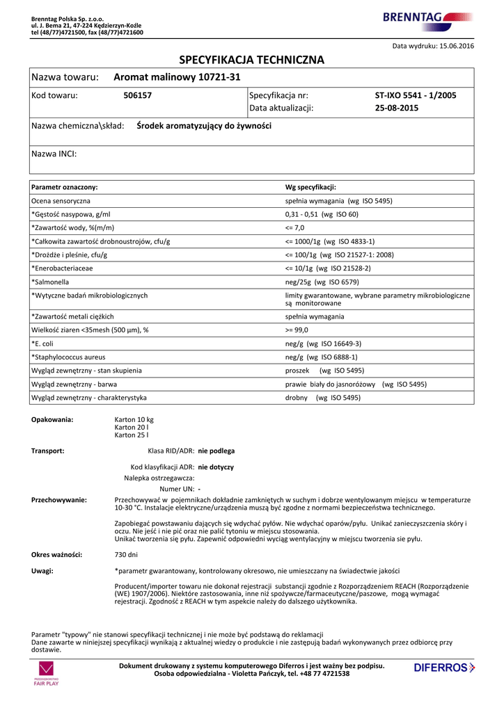 Brenntag Polska Sp. z.o.o. ul. J. Bema 21, 47-224 Kędzierzyn-Koźle tel (48/77)4721500, fax (48/77)4721600 Data wydruku: 15.06.2016 SPECYFIKACJA TECHNICZNA Nazwa towaru: Aromat malinowy 10721-31 Kod towaru: 506157 Nazwa chemiczna\skład: Specyfikacja nr: Data aktualizacji: ST-IXO 5541 - 1/2005 25-08-2015 Środek aromatyzujący do żywności Nazwa INCI: Parametr oznaczony: Wg specyfikacji: Ocena sensoryczna spełnia wymagania (wg ISO 5495) *Gęstość nasypowa, g/ml 0,31 - 0,51 (wg ISO 60) *Zawartość wody, %(m/m) <= 7,0 *Całkowita zawartość drobnoustrojów, cfu/g <= 1000/1g (wg ISO 4833-1) *Drożdże i pleśnie, cfu/g <= 100/1g (wg ISO 21527-1: 2008) *Enerobacteriaceae <= 10/1g (wg ISO 21528-2) *Salmonella neg/25g (wg ISO 6579) *Wytyczne badań mikrobiologicznych limity gwarantowane, wybrane parametry mikrobiologiczne są monitorowane *Zawartość metali ciężkich spełnia wymagania Wielkość ziaren <35mesh (500 µm), % >= 99,0 *E. coli neg/g (wg ISO 16649-3) *Staphylococcus aureus neg/g (wg ISO 6888-1) Wygląd zewnętrzny - stan skupienia proszek Wygląd zewnętrzny - barwa prawie biały do jasnoróżowy (wg ISO 5495) Wygląd zewnętrzny - charakterystyka drobny Opakowania: (wg ISO 5495) Karton 10 kg Karton 20 l Karton 25 l Transport: Przechowywanie: (wg ISO 5495) Klasa RID/ADR: nie podlega Kod klasyfikacji ADR: nie dotyczy Nalepka ostrzegawcza: Numer UN: Przechowywać w pojemnikach dokładnie zamkniętych w suchym i dobrze wentylowanym miejscu w temperaturze 10-30 °C. Instalacje elektryczne/urządzenia muszą być zgodne z normami bezpieczeństwa technicznego. Zapobiegać powstawaniu dających się wdychać pyłów. Nie wdychać oparów/pyłu. Unikać zanieczyszczenia skóry i oczu. Nie jeść i nie pić oraz nie palić tytoniu w miejscu stosowania. Unikać tworzenia się pyłu. Zapewnić odpowiedni wyciąg wentylacyjny w miejscu tworzenia sie pyłu. Okres ważności: 730 dni Uwagi: *parametr gwarantowany, kontrolowany okresowo, nie umieszczany na świadectwie jakości Producent/importer towaru nie dokonał rejestracji substancji zgodnie z Rozporządzeniem REACH (Rozporządzenie (WE) 1907/2006). Niektóre zastosowania, inne niż spożywcze/farmaceutyczne/paszowe, mogą wymagać rejestracji. Zgodność z REACH w tym aspekcie należy do dalszego użytkownika. Parametr "typowy" nie stanowi specyfikacji technicznej i nie może być podstawą do reklamacji Dane zawarte w niniejszej specyfikacji wynikają z aktualnej wiedzy o produkcie i nie zastępują badań wykonywanych przez odbiorcę przy dostawie. Dokument drukowany z systemu komputerowego Diferros i jest ważny bez podpisu. Osoba odpowiedzialna - Violetta Pańczyk, tel. +48 77 4721538