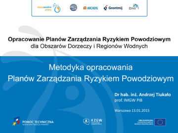 Metodyka opracowania Planów Zarządzania Ryzykiem Powodziowym Dr hab. inż. Andrzej Tiukało prof. IMGW PIB Warszawa 13.01.2015 Założenia metodyczne opracowania PZRP Celem zarządzania ryzykiem powodziowym jest ograniczenie potencjalnych negatywnych skutków powodzi dla życia i zdrowia ludzi, środowiska, dziedzictwa kulturowego oraz działalności gospodarczej. (Dział 1 art. 9, ustawa Prawo wodne). 2 Założenia metodyczne opracowania PZRP Plany zarządzania ryzykiem powodziowym (PZRP) to dokumenty przewidujące działania, które mają realizować główne cele zarządzania ryzykiem powodziowym obejmujące m. in. ograniczanie zagrożenia (zasięgu powodzi), ograniczenie wrażliwości terenów zagrożonych i podnoszenie zdolności radzenia sobie z zagrożeniem powodziowym. 3 Założenia metodyczne opracowania PZRP Plany zarządzania ryzykiem powodziowym powinny uwzględniać perspektywę długoterminową i niepewność odnośnie przyszłości, związaną zarówno ze zmianami klimatu jak i zmianami zagospodarowania obszarów zagrożonych powodzią. 4 Założenia metodyczne opracowania PZRP Plany zarządzania ryzykiem powodziowym bazują na zasadzie dekomponowania działań ograniczających ryzyka powodziowego do następujących grup: • wyznaczanie obszarów zagrożenia powodziowego i przygotowanie informacji o ryzykach związanych z zamieszkiwaniem i prowadzeniem działalności gospodarczej na takich obszarach, • budowa systemu prognozowania i ostrzegania przed niebezpieczeństwem • wdrażania instrumentów prawnych i ekonomicznych wzmacniających system ochrony przeciwpowodziowej, w tym określenie odpowiednich przepisów regulujących warunki zabudowy obszarów zagrożenia powodziowego, 5 Założenia metodyczne opracowania PZRP Plany zarządzania ryzykiem powodziowym bazują na zasadzie dekomponowania działań ograniczających ryzyka powodziowego do następujących grup: • plany zarządzania kryzysowego, w tym plany ewakuacji ludności, • działania zwiększające naturalną ochronę przeciwpowodziową – oddanie rzece przestrzeni, • działania techniczne – budowa, przebudowa i remonty infrastruktury biernej i czynnej ochrony przed powodzią. 6 RYZYKO POWODZIOWE, METODY JEGO OGRANICZANIA DZIAŁANIA TECHNICZNE – BUDOWA, PRZEBUDOWA, REMONTY INFRASTRUKTURY • BIERNEJ OCHRONY PRZECIWPOWODZIOWEJ • CZYNNEJ OCHRONY PRZECIWPOWODZIOWEJ RYZYKO REZYDUALNE SYSTEM ZARZĄDZANIA KRYZYSOWEGO • PLANY ZARZĄDZANIA KRYZYSOWEGO • PLANY EWAKUACJI PRZEPISY BUDOWLANE (UREGULOWANIA PRAWNE I EKONOMICZNE) • WARUNKI ZABUDOWY • ODPORNOŚĆ BUDYNKÓW NA TERENACH ZALEWOWYCH DZIAŁANIA NIETECHNICZNE OGRANICZAJĄCE NIEBEZPIECZEŃSTWO POWODZI (NATURALNE ŚRODKI OCHRONY PRZECIWPOWODZIOWEJ) WIELKOŚĆ RYZYKA REDUKCJA RYZYKA POWODZIOWEGO REDUKCJA ZAGROŻENIA REDUKCJA WRAŻLIWOŚCI ŚRODKI OGRANICZAJĄCE RYZYKO SYSTEM PROGNOZOWANIA I OSTRZEGANIA 7 Założenia metodyczne opracowania PZRP Katalog głównych celów zarządzania ryzykiem powodziowym dla obszaru dorzecza 1. ZAHAMOWANIE WZROSTU RYZYKA POWODZIOWEGO 2. MINIMALIZACJA ISTNIEJĄCEGO RYZYKA POWODZIOWEGO 3. POPRAWA SYSTEMU ZARZĄDZANIA RYZYKIEM POWODZIOWYM 8 Założenia metodyczne opracowania PZRP 1. ZAHAMOWANIE WZROSTU RYZYKA POWODZIOWEGO 1.1. Utrzymanie oraz zwiększanie istniejącej zdolności retencyjnej zlewni w regionie wodnym 1.2. Wyeliminowanie, unikanie wzrostu zagospodarowania na obszarach szczególnego zagrożenia powodzią 1.3. Określenie warunków możliwego zagospodarowywania obszarów chronionych obwałowaniami 1.4. Unikanie wzrostu oraz określenie warunków zagospodarowania na obszarach o niskim (p= 0,2%) prawdopodobieństwie wystąpienia powodzi 9 Założenia metodyczne opracowania PZRP 2. MINIMALIZACJA ISTNIEJĄCEGO RYZYKA POWODZIOWEGO 2.1. Ograniczanie istniejącego zagrożenia powodziowego 2.2. Ograniczanie istniejącego zagospodarowania 2.3. Ograniczanie wrażliwości obiektów i społeczności. 10 Założenia metodyczne opracowania PZRP 3. POPRAWA SYSTEMU ZARZĄDZANIA RYZYKIEM POWODZIOWYM 3.1. Doskonalenie prognozowania i ostrzegania o zagrożeniach meteorologicznych i hydrologicznych 3.2. Doskonalenie skuteczności reagowania ludzi, firm i instytucji publicznych. 3.3. Doskonalenie skuteczności odbudowy i powrotu do stanu sprzed powodzi 3.4. Wdrożenie i doskonalenie skuteczności analiz popowodziowych. 11 Założenia metodyczne opracowania PZRP 3. POPRAWA SYSTEMU ZARZĄDZANIA RYZYKIEM POWODZIOWYM 3.5. Budowa instrumentów prawnych i finansowych zniechęcających lub skłaniających do określonych zachowań zwiększających bezpieczeństwo powodziowe 3.6. Budowa programów edukacyjnych poprawiających świadomość i wiedzę na temat źródeł zagrożenia powodziowego i ryzyka powodziowego 12 PROCES TWORZENIA PZRP ROZKŁAD PRZESTRZENNY ZAGROŻENIA POWODZIOWEGO WYZNACZENIE OBSZARÓW O SZCZEGÓLNYM (EKSTREMALNYM) RYZYKU POWODZIOWYM WYZNACZENIE CELÓW ZARZĄDZANIA RYZYKIEM POWODZIOWYM OKREŚLENIE WSKAŹNIKÓW REDUKCJI RYZYKA POWODZIOWEGO DLA OBSZARÓW SZCZEGÓLNEGO RYZYKA POWODZIOWEGO ANALIZA GRUP DZIAŁAŃ SŁUŻĄCYCH REDUKCJI ZAGROŻENIA, RYZYKA POWODZIOWEGO, ORAZ WSKAZANIE INSTRUMENTÓW WDROŻENIA PZRP ANALIZA PROGÓW ŚRODOWISKOWYCH SPOŁECZNYCH I GOSPODARCZYCH OGRANICZAJĄCYCH STOSOWANIE GRUP DZIAŁAŃ ANALIZA SKUTECZNOŚCI REDUKCJI RYZYKA POWODZIOWEGO POPRZEZ ZASTOSOWANIE ZBIORU (KOMPOZYCJI) GRUP DZIAŁAŃ NATURALNEJ OCHRONY PRZECIWPOWODZIOWEJ (OKREŚLENIE WSKAŹNIKA REDUKCJI RYZYKA POWODZIOWEGO) SELEKCJA DZIAŁAŃ TECHNICZNYCH (BUDOWA LIST INWESTYCJI STRATEGICZNYCH) REDUKUJĄCYCH RYZYKO POWODZIOWE DLA OBSZARÓW SZCZEGÓLNEGO RYZYKA POWODZIOWEGO Z UWZGLĘDNIENIEM ALTERNATYWNYCH ROZWIĄZAŃ TECHNICZNYCH ANALIZA SKUTECZNOŚCI ZAPLANOWANYCH INWESTYCJI STRATEGICZNYCH REDUKUJĄCYCH RYZYKO POWODZIOWE ANALIZA EFEKTYWNOŚCI PZRP, PORÓWNANIE ALTERNATYWNYCH DZIAŁAŃ TECHNICZNYCH UZUPEŁNIAJĄCYCH KOMPOZYCJE DZIAŁAŃ NIETECHNICZNYCH. ANALIZA CBA I MA WYBÓR WARIANTU PROJEKTU PZRP 13 PROCES TWORZENIA PZRP PLANOWAN