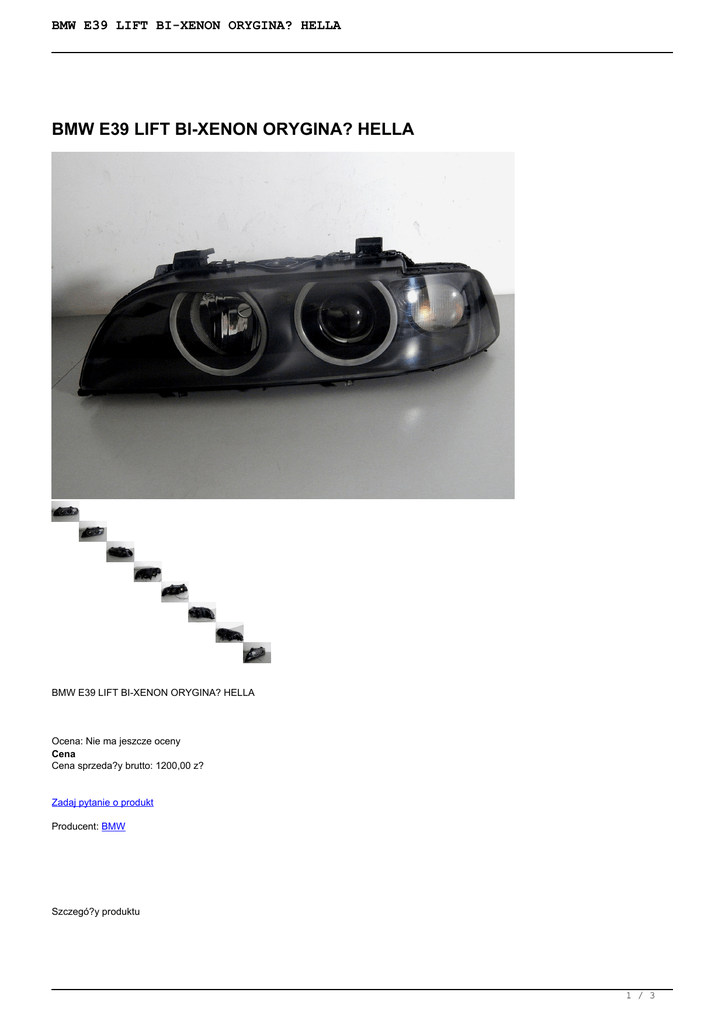 BMW E39 LIFT BI-XENON ORYGINA? HELLA BMW E39 LIFT BI-XENON ORYGINA? HELLA BMW E39 LIFT BI-XENON ORYGINA? HELLA Ocena: Nie ma jeszcze oceny Cena Cena sprzeda?y brutto: 1200,00 z? Zadaj pytanie o produkt Producent: BMW Szczegó?y produktu 1 / 3 BMW E39 LIFT BI-XENON ORYGINA? HELLA O NAS Od wielu lat zajmujemy si? skupem i sprzeda?? lamp samochodowych. Posiadamy bogaty asortyment zarówno lamp u?ywanych pochodz?cych z demonta?u, jak i nowych cz??ci. Kupuj?c u nas masz pewno?? i gwarancj? rozruchow? towaru (14 dni od momentu odbioru). Istnieje mo?liwo?? zamówienia cz??ci, gdy? 2 razy w tygodniu realizowana jest nowa dostawa towaru. WYSY?KA Towar wysy?amy w tym samym dniu je?eli zamówienie zostanie z?o?one do godz.13:00 kurierem In Post lub Poczt? Polsk?. Po godz. 13:00 przesy?ka zostanie wys?ana w nast?pnym dniu roboczym. Istnieje mo?liwo?? wysy?ki paczek (forma p?atno?ci): - za pobraniem - przedp?ata na konto Przesy?ka z regu?y dociera na nast?pny dzie? roboczy. Paczki nadawane s? tylko w dni powszednie. Istnieje mo?liwo?? osobistego odbioru reflektorów po wcze?niejszej konsultacji. Maj? Pa?stwo prawo zwrotu zakupionego towaru w ci?gu 14 dni (ustawowo) wraz z dowodem zakupu i formularzem odst?pienia od umowy zawartym na naszej stronie : http://lampy-samochodowe.pl/media/files/Formularz_Odstapienia_OU.pdf bez podania przyczyny. Nie odbieramy przesy?ek za pobraniem. ZAKUP PRZEDMIOTU BMW E39 LIFT BI-XENON ORYGINA? HELLA 1. Wybierz produkt i dodaj go do koszyka. 2. Wybierz sposób zap?aty/ odbioru, uzupe?nij dane do wysy?ki 3. Ewentualne sugestie prosz? wpisa? w polu wiadomo??. 4. Oczekuj na kuriera- sprawd? zawarto?? przesy?ki przy odbiorze (wszystkie paczki s? ubezpieczone) . MODEL STRON OPIS STAN CENA /MARK A CZ??CI MAGA A ZYNO WY BMW LEWA PRZÓD , D5-48 1200,00 E39 BIPLN LIFT XENON ORYGIN A? HELLA, POSIAD AMY KO MPLET PRAWA + LEWA 1 SZTUKA 1200 Z? PARAGON/FAKTURA Do ka?dej zakupionej cz??ci do??czamy paragon . Je?li ?ycz? Pa?stwo sobie faktur?, prosimy o informacj? wraz z danymi niezb?dnymi do jej wystawienia. KONTAKT: 2 / 3 BMW E39 LIFT BI-XENON ORYGINA? HELLA Wszelkie zapytania prosimy kierowa? na e-mail: [email protected] Wszystkie przedmioty s? dok?adnie opisane i skatalogowane. Je?li masz dodatkowe pytania prosimy o kontakt pod nr tel.: 798-986-497 GODZINY OTWARCIA: Pracujemy od poniedzia?ku do pi?tku w godz. 8:00- 16:00. STRONA WWW: www.lampy-samochodowe.pl ZAMIENNIKI: Nie kupuj zamienników na innych aukcjach. S? to cz??ci o krótkiej ?ywotno?ci i s?abej jako?ci wykonania. Pos?u?? na zdecydowanie krótszy czas ni? cz??ci oryginalne, mimo, ?e s? nowe. Zakup na naszych aukcjach jest jednoznaczny z akceptacj? regulaminu dost?pnego na naszej stronie. DZI?KUJEMY ZA ZAINTERESOWANIE 3 / 3 Powered by TCPDF (www.tcpdf.org)