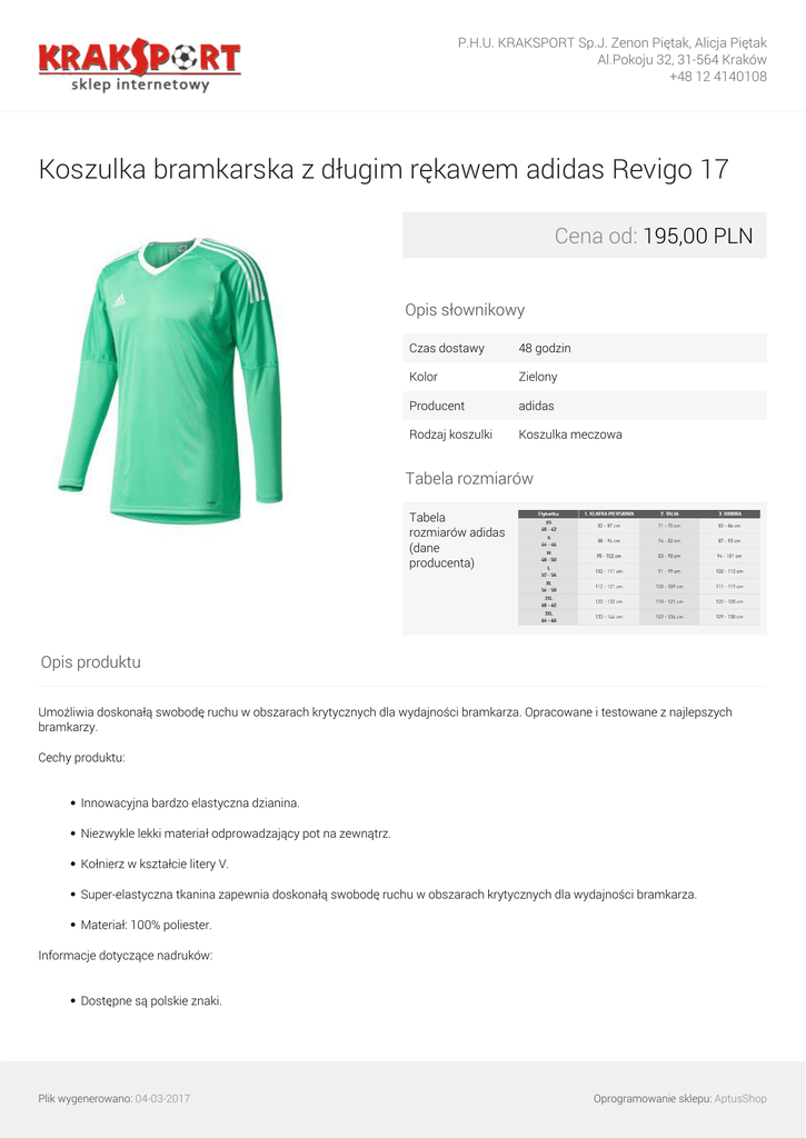 P.H.U. KRAKSPORT Sp.J. Zenon Piętak, Alicja Piętak Al.Pokoju 32, 31-564 Kraków +48 12 4140108 Koszulka bramkarska z długim rękawem adidas Revigo 17 Cena od: 195,00 PLN Opis słownikowy Czas dostawy 48 godzin Kolor Zielony Producent adidas Rodzaj koszulki Koszulka meczowa Tabela rozmiarów Tabela rozmiarów adidas (dane producenta) Opis produktu Umożliwia doskonałą swobodę ruchu w obszarach krytycznych dla wydajności bramkarza. Opracowane i testowane z najlepszych bramkarzy. Cechy produktu: Innowacyjna bardzo elastyczna dzianina. Niezwykle lekki materiał odprowadzający pot na zewnątrz. Kołnierz w kształcie litery V. Super-elastyczna tkanina zapewnia doskonałą swobodę ruchu w obszarach krytycznych dla wydajności bramkarza. Materiał: 100% poliester. Informacje dotyczące nadruków: Dostępne są polskie znaki. Plik wygenerowano: 04-03-2017 Oprogramowanie sklepu: AptusShop P.H.U. KRAKSPORT Sp.J. Zenon Piętak, Alicja Piętak Al.Pokoju 32, 31-564 Kraków +48 12 4140108 Zamówienie nadruku możliwe jest tylko i wyłącznie z opcją płatności z góry (przelew lub karta kredytowa). Nie wysyłamy koszulek z nadrukiem za pobraniem (płatnością przy odbiorze). Wykonanie nadruku trwa od 1-5 dni roboczych, liczone od momentu otrzymania wpłaty. Z uwagi na indywidualny charakter zamówienia, koszulka z nadrukiem nie podlega zwrotowi ani wymianie. Warianty produktu M 195,00 PLN L 195,00 PLN Galeria Plik wygenerowano: 04-03-2017 Powered by TCPDF (www.tcpdf.org) Oprogramowanie sklepu: AptusShop