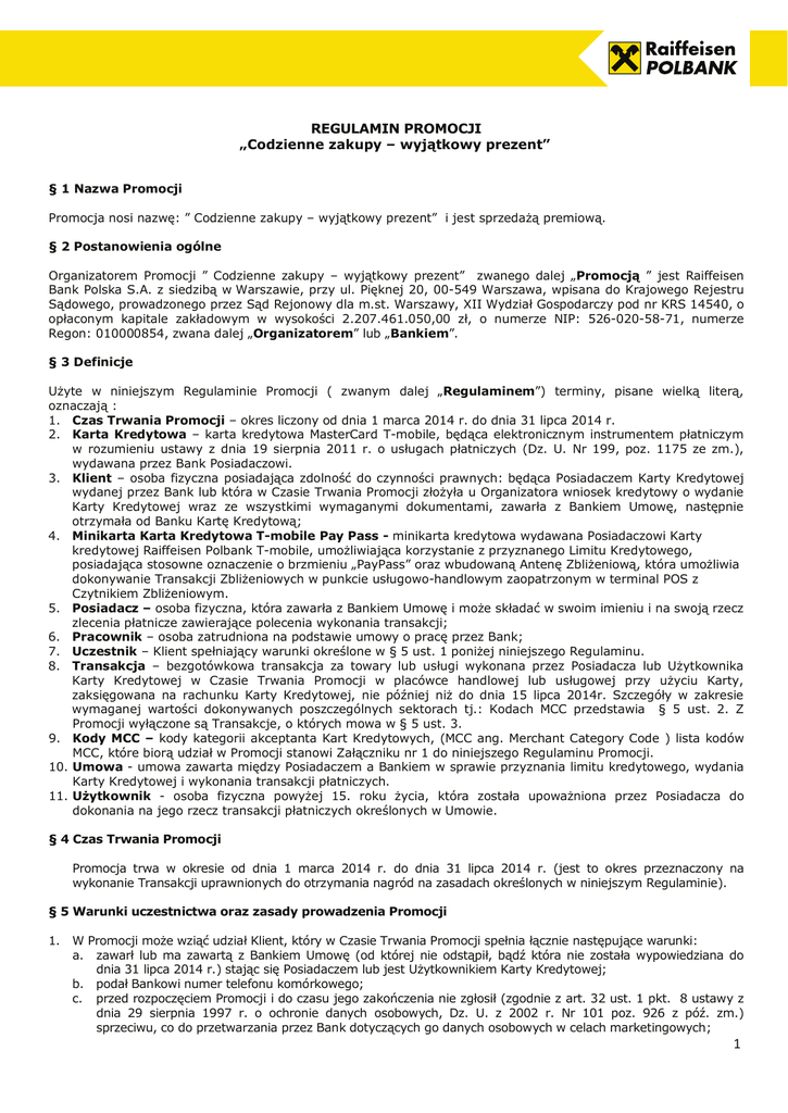 REGULAMIN PROMOCJI „Codzienne zakupy – wyjątkowy prezent” § 1 Nazwa Promocji Promocja nosi nazwę: ” Codzienne zakupy – wyjątkowy prezent” i jest sprzedażą premiową. § 2 Postanowienia ogólne Organizatorem Promocji ” Codzienne zakupy – wyjątkowy prezent” zwanego dalej „Promocją ” jest Raiffeisen Bank Polska S.A. z siedzibą w Warszawie, przy ul. Pięknej 20, 00-549 Warszawa, wpisana do Krajowego Rejestru Sądowego, prowadzonego przez Sąd Rejonowy dla m.st. Warszawy, XII Wydział Gospodarczy pod nr KRS 14540, o opłaconym kapitale zakładowym w wysokości 2.207.461.050,00 zł, o numerze NIP: 526-020-58-71, numerze Regon: 010000854, zwana dalej „Organizatorem” lub „Bankiem”. § 3 Definicje Użyte w niniejszym Regulaminie Promocji ( zwanym dalej „Regulaminem”) terminy, pisane wielką literą, oznaczają : 1. Czas Trwania Promocji – okres liczony od dnia 1 marca 2014 r. do dnia 31 lipca 2014 r. 2. Karta Kredytowa – karta kredytowa MasterCard T-mobile, będąca elektronicznym instrumentem płatniczym w rozumieniu ustawy z dnia 19 sierpnia 2011 r. o usługach płatniczych (Dz. U. Nr 199, poz. 1175 ze zm.), wydawana przez Bank Posiadaczowi. 3. Klient – osoba fizyczna posiadająca zdolność do czynności prawnych: będąca Posiadaczem Karty Kredytowej wydanej przez Bank lub która w Czasie Trwania Promocji złożyła u Organizatora wniosek kredytowy o wydanie Karty Kredytowej wraz ze wszystkimi wymaganymi dokumentami, zawarła z Bankiem Umowę, następnie otrzymała od Banku Kartę Kredytową; 4. Minikarta Karta Kredytowa T-mobile Pay Pass - minikarta kredytowa wydawana Posiadaczowi Karty kredytowej Raiffeisen Polbank T-mobile, umożliwiająca korzystanie z przyznanego Limitu Kredytowego, posiadająca stosowne oznaczenie o brzmieniu „PayPass” oraz wbudowaną Antenę Zbliżeniową, która umożliwia dokonywanie Transakcji Zbliżeniowych w punkcie usługowo-handlowym zaopatrzonym w terminal POS z Czytnikiem Zbliżeniowym. 5. Posiadacz – osoba fizyczna, która zawarła z Bankiem Umowę i może składać w swoim imieniu i na swoją rzecz zlecenia płatnicze zawierające polecenia wykonania transakcji; 6. Pracownik – osoba zatrudniona na podstawie umowy o pracę przez Bank; 7. Uczestnik – Klient spełniający warunki określone w § 5 ust. 1 poniżej niniejszego Regulaminu. 8. Transakcja – bezgotówkowa transakcja za towary lub usługi wykonana przez Posiadacza lub Użytkownika Karty Kredytowej w Czasie Trwania Promocji w placówce handlowej lub usługowej przy użyciu Karty, zaksięgowana na rachunku Karty Kredytowej, nie później niż do dnia 15 lipca 2014r. Szczegóły w zakresie wymaganej wartości dokonywanych poszczególnych sektorach tj.: Kodach MCC przedstawia § 5 ust. 2. Z Promocji wyłączone są Transakcje, o których mowa w § 5 ust. 3. 9. Kody MCC – kody kategorii akceptanta Kart Kredytowych, (MCC ang. Merchant Category Code ) lista kodów MCC, które biorą udział w Promocji stanowi Załączniku nr 1 do niniejszego Regulaminu Promocji. 10. Umowa - umowa zawarta między Posiadaczem a Bankiem w sprawie przyznania limitu kredytowego, wydania Karty Kredytowej i wykonania transakcji płatniczych. 11. Użytkownik - osoba fizyczna powyżej 15. roku życia, która została upoważniona przez Posiadacza do dokonania na jego rzecz transakcji płatniczych określonych w Umowie. § 4 Czas Trwania Promocji Promocja trwa w okresie od dnia 1 marca 2014 r. do dnia 31 lipca 2014 r. (jest to okres przeznaczony na wykonanie Transakcji uprawnionych do otrzymania nagród na zasadach określonych w niniejszym Regulaminie). § 5 Warunki uczestnictwa oraz zasady prowadzenia Promocji 1. W Promocji może wziąć udział Klient, który w Czasie Trwania Promocji spełnia łącznie następujące warunki: a. zawarł lub ma zawartą z Bankiem Umowę (od której nie odstąpił, bądź która nie została wypowiedziana do dnia 31 lipca 2014 r.) stając się Posiadaczem lub jest Użytkownikiem Karty Kredytowej; b. podał Bankowi numer telefonu komórkowego; c. przed rozpoczęciem Promocji i do czasu jego zakończenia nie zgłosił (zgodnie z art. 32 ust. 1 pkt. 8 ustawy z dnia 29 sierpnia 1997 r. o ochronie danych osobowych, Dz. U. z 2002 r. Nr 101 poz. 926 z póź. zm.) sprzeciwu, co do przetwarzania przez Bank dotyczących go danych osobowych w celach marketingowych; 1 d. nie jest Pracownikiem Banku. 2. W Promocji brane są pod uwagę Transakcje dokonane w poszczególnych miesiącach we wskazanych miejscach i określonych Kodach MCC. Informację o tym w jakiej grupie usługodawców należy dokonać transakcji, będzie przesłana w ofercie. Szczegółowa wartość wymaganych Transakcji, w poszczególnych miejscach/punktach handlowo-usługowych, będzie wskazywana w przesłanej ofercie. 3. W Promocji nie będą brane pod uwagę Transakcje: a. dla których punkt usługowo-handlowy dokonał korekty lub zwrotu środków na rachunek Klienta. b. reklamowane przez Klienta w trakcie trwania Promocji. c. wykonane tego samego dnia w tym samym punkcie usługowo – handlowym (w tym poprzez stronę internetową) przez tego samego Uczestnika – w takim przypadku do zestawienia transakcji będzie brana wyłącznie pierwsza Transakcja. d. dokonane z naruszeniem prawa lub postanowień Umowy. 4. Umowa Karty nie została wypowiedziana do dnia 31 lipca 2014 r. 5. Jeżeli Uczestnik posiada w Banku więcej niż jedną Kartę Kredytową T-mobile MasterCard, która jest główną Kartą Kredytową, to Transakcje dokonane tymi Kartami Kredytowymi oraz Minikartą Karta Kredytowa T-mobile Pay Pass, będą zaliczane do całkowitej wartości Transakcji dokonanych przez Uczestnika w Czasie Trwania Promocji. 6. Użytkownicy Minikarty Karty Kredytowej T-mobile Pay Pass dokonują Transakcji na rzecz Posiadacza głównej Karty Kredytowej. § 6 Sposób prowadzenia Promocji 1. Promocja podzielona jest na 5 miesięcznych etapów: 2. W każdym z miesięcznych etapów Uczestnik, może otr