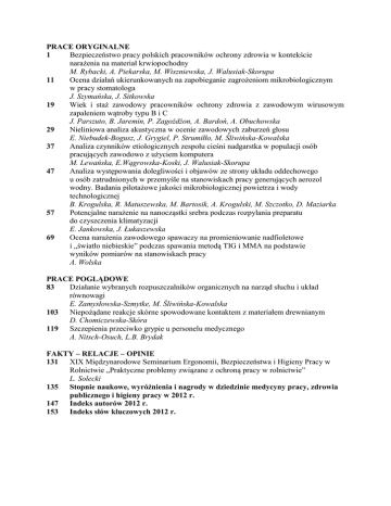PRACE ORYGINALNE 1 Bezpieczeństwo pracy polskich pracowników ochrony zdrowia w kontekście narażenia na materiał krwiopochodny M. Rybacki, A. Piekarska, M. Wiszniewska, J. Walusiak-Skorupa 11 Ocena działań ukierunkowanych na zapobieganie zagrożeniom mikrobiologicznym w pracy stomatologa J. Szymańska, J. Sitkowska 19 Wiek i staż zawodowy pracowników ochrony zdrowia z zawodowym wirusowym zapaleniem wątroby typu B i C J. Parszuto, B. Jaremin, P. Zagożdżon, A. Bardoń, A. Obuchowska 29 Nieliniowa analiza akustyczna w ocenie zawodowych zaburzeń głosu E. Niebudek-Bogusz, J. Grygiel, P. Strumiłło, M. Śliwińska-Kowalska 37 Analiza czynników etiologicznych zespołu cieśni nadgarstka w populacji osób pracujących zawodowo z użyciem komputera M. Lewańska, E.Wągrowska-Koski, J. Walusiak-Skorupa 47 Analiza występowania dolegliwości i objawów ze strony układu oddechowego u osób zatrudnionych w przemyśle na stanowiskach pracy generujących aerozol wodny. Badania pilotażowe jakości mikrobiologicznej powietrza i wody technologicznej B. Krogulska, R. Matuszewska, M. Bartosik, A. Krogulski, M. Szczotko, D. Maziarka 57 Potencjalne narażenie na nanocząstki srebra podczas rozpylania preparatu do czyszczenia klimatyzacji E. Jankowska, J. Łukaszewska 69 Ocena narażenia zawodowego spawaczy na promieniowanie nadfioletowe i „światło niebieskie” podczas spawania metodą TIG i MMA na podstawie wyników pomiarów na stanowiskach pracy A. Wolska PRACE POGLĄDOWE 83 Działanie wybranych rozpuszczalników organicznych na narząd słuchu i układ równowagi E. Zamysłowska-Szmytke, M. Śliwińska-Kowalska 103 Niepożądane reakcje skórne spowodowane kontaktem z materiałem drewnianym D. Chomiczewska-Skóra 119 Szczepienia przeciwko grypie u personelu medycznego A. Nitsch-Osuch, L.B. Brydak FAKTY – RELACJE – OPINIE 131 XIX Międzynarodowe Seminarium Ergonomii, Bezpieczeństwa i Higieny Pracy w Rolnictwie „Praktyczne problemy związane z ochroną pracy w rolnictwie” L. Solecki 135 Stopnie naukowe, wyróżnienia i nagrody w dziedzinie medycyny pracy, zdrowia publicznego i higieny pracy w 2012 r. 147 Indeks autorów 2012 r. 153 Indeks słów kluczowych 2012 r.